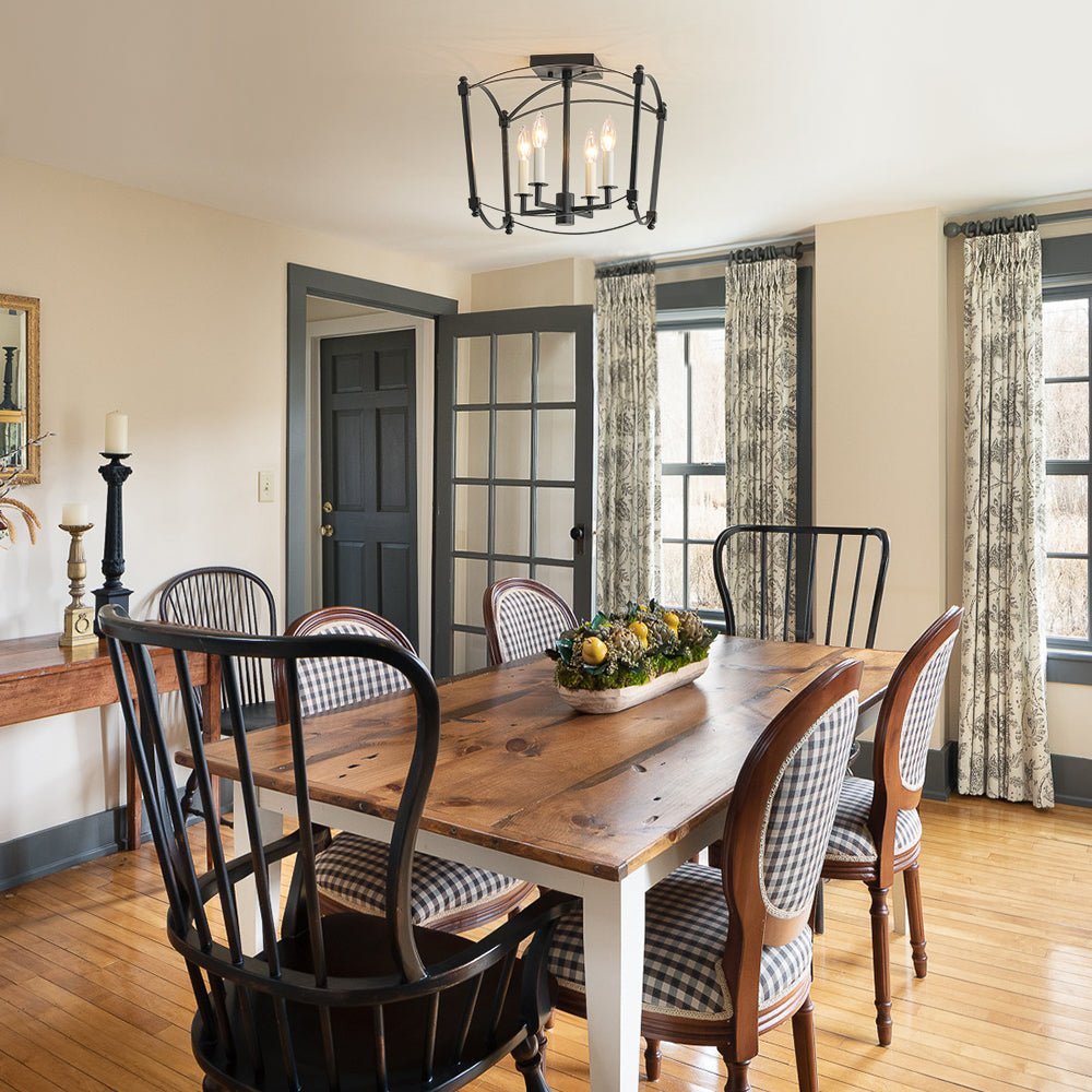 This 4-light semi-flush mount offers abundant ambient light while featuring a minimalist, boxy design that suits both high and low ceilings. Constructed from sturdy metal, the lantern semi-flush mount showcases a slender open frame with graceful, streamlined arched lines, evoking classic French elegance. The fixture houses four candle-style white light holders compatible with E12 candelabra bulbs (sold separately), creating an airy cage-inspired look with a timeless romantic appeal. The distressed gold finish adds a shabby chic charm, while the matte black accents introduce a sleek, modern touch. Perfect to illuminate an entry, dining room, kitchen, bathroom, bedroom, stairwell, or living room, this 4-light candle style ceiling light effortlessly enhances the style of your decor.