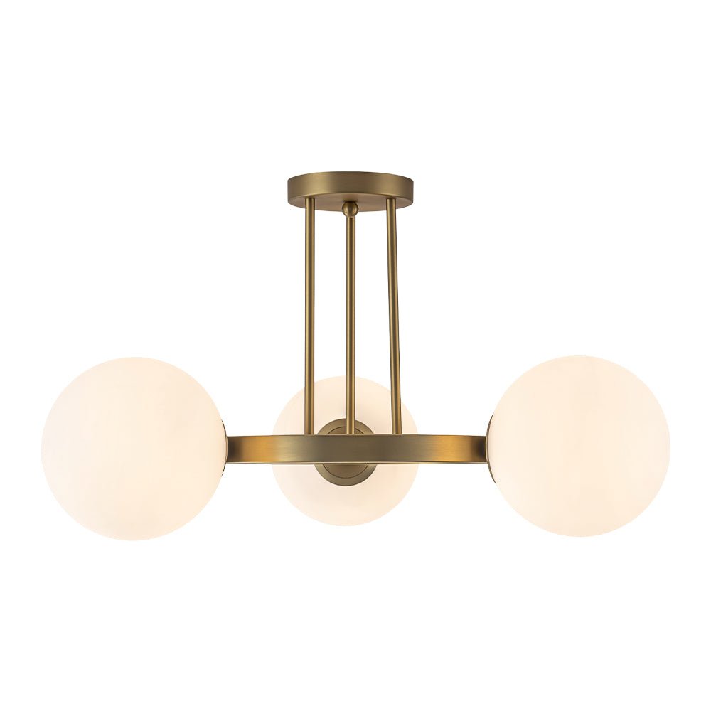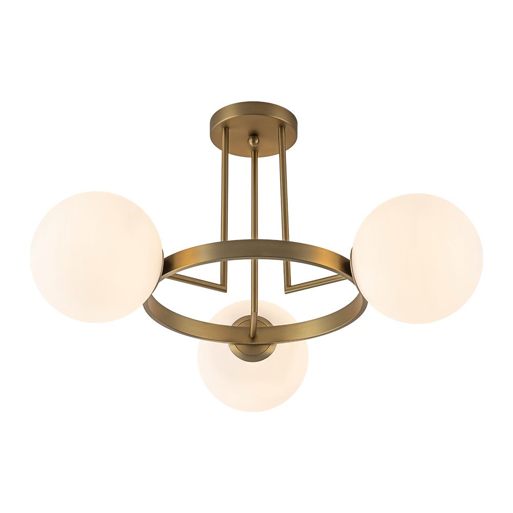 3-Light Brass Opal Glass Globe Round Ring Semi Flush Mount
