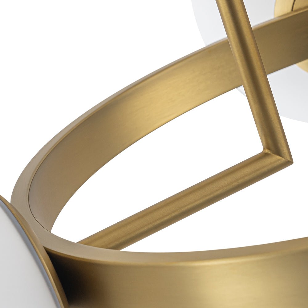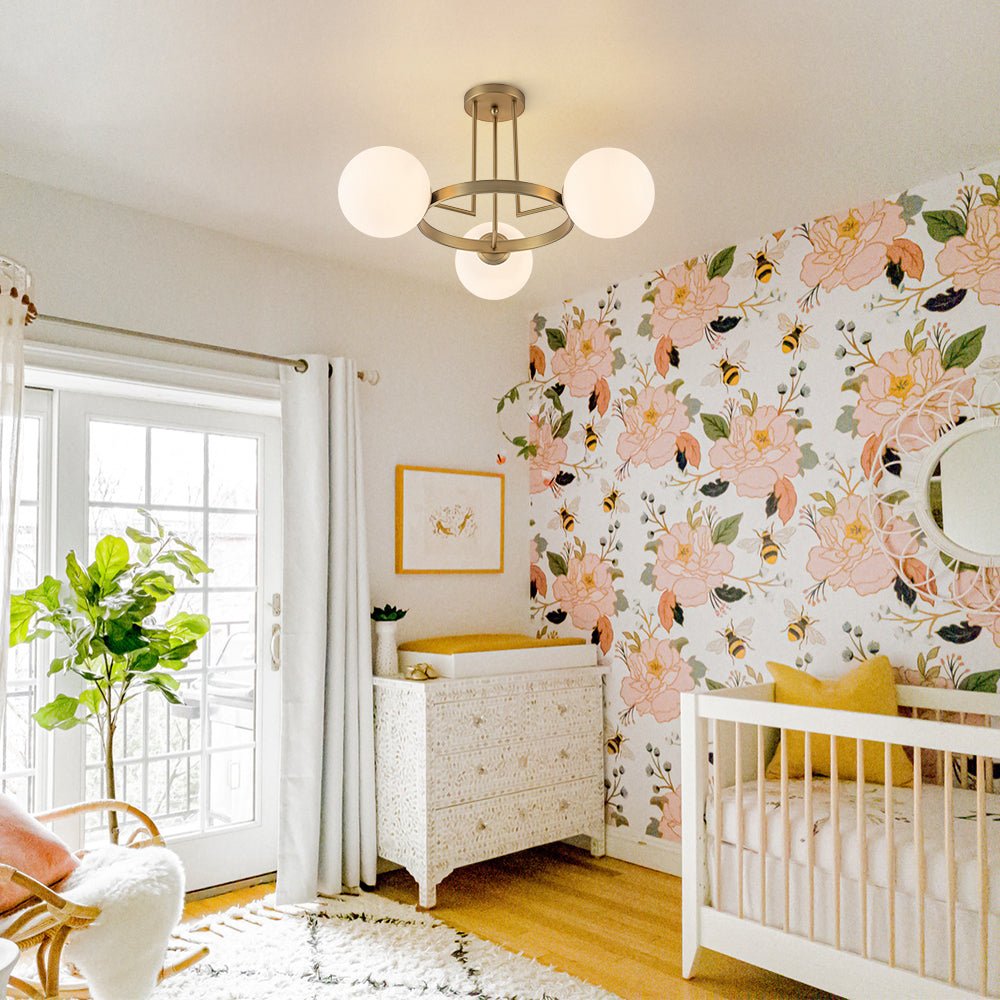 Simply geometric and elegantly restrained, this 3-light round semi-flush mount ceiling fixture showcases a slim iron ring finished in warm brushed brass. Three frosted glass globes are evenly spaced along the circular frame, resembling a strand of luminous white pearls—adding softness and visual rhythm that beautifully balances the clean gold silhouette. When illuminated, the milky opal glass gently diffuses light into a warm, ambient glow, creating an inviting and calming atmosphere. Ideal for bedrooms, dining areas, living rooms, kitchens, foyers, nurseries, or entryways, this opal glass bubble ceiling light pairs effortlessly with mid-century modern, contemporary, and modern interiors.