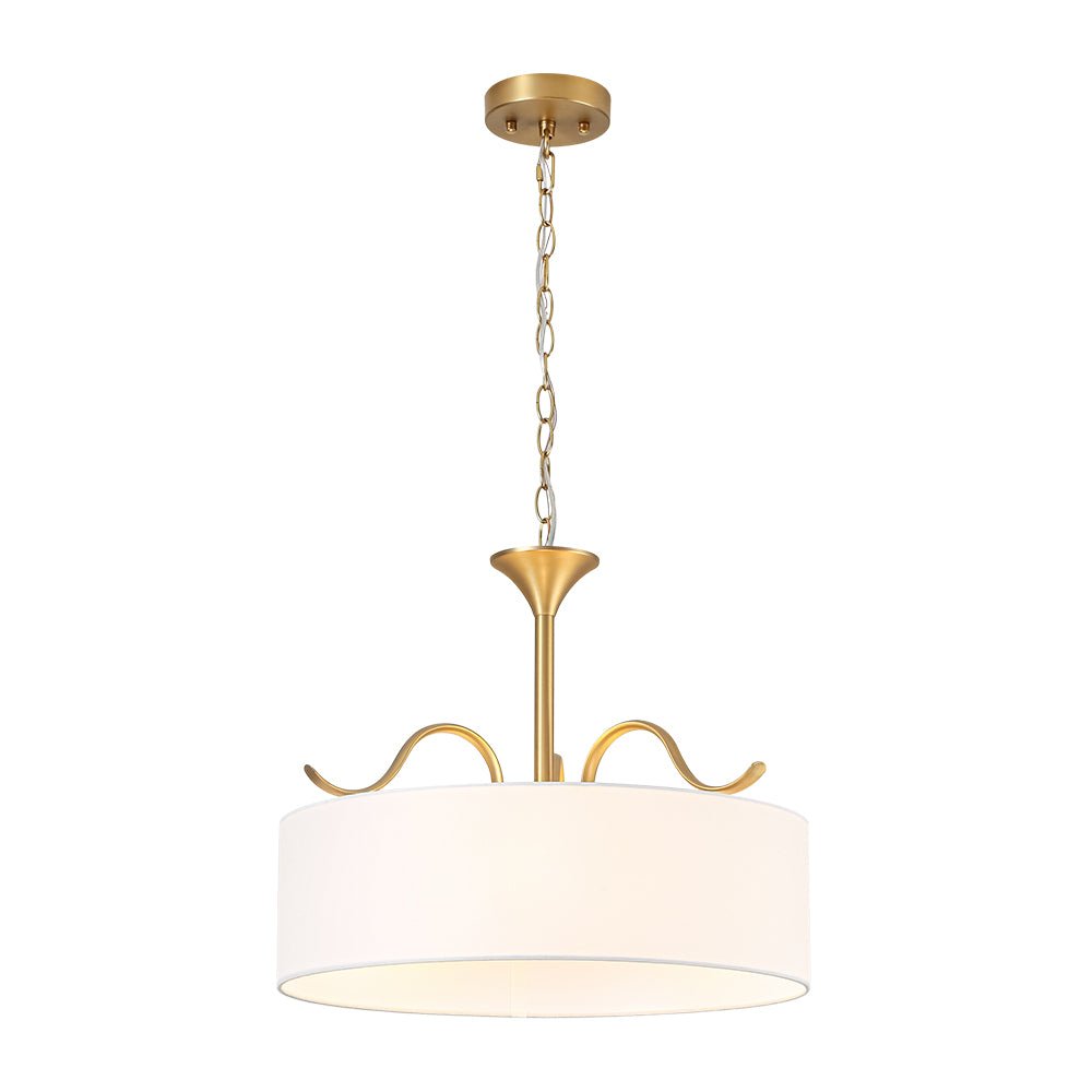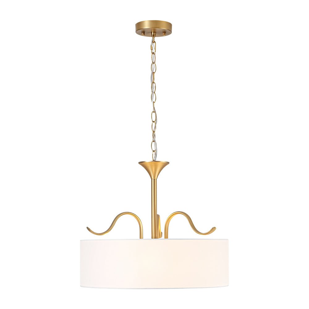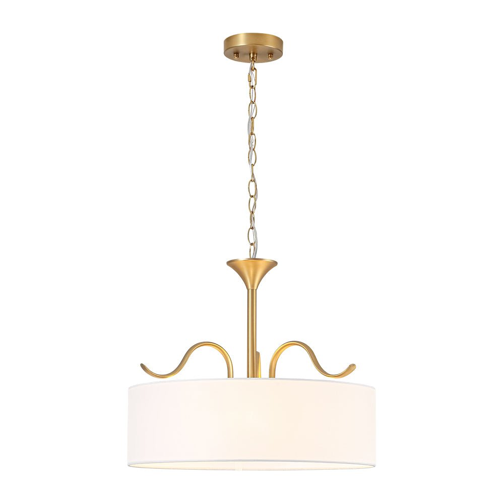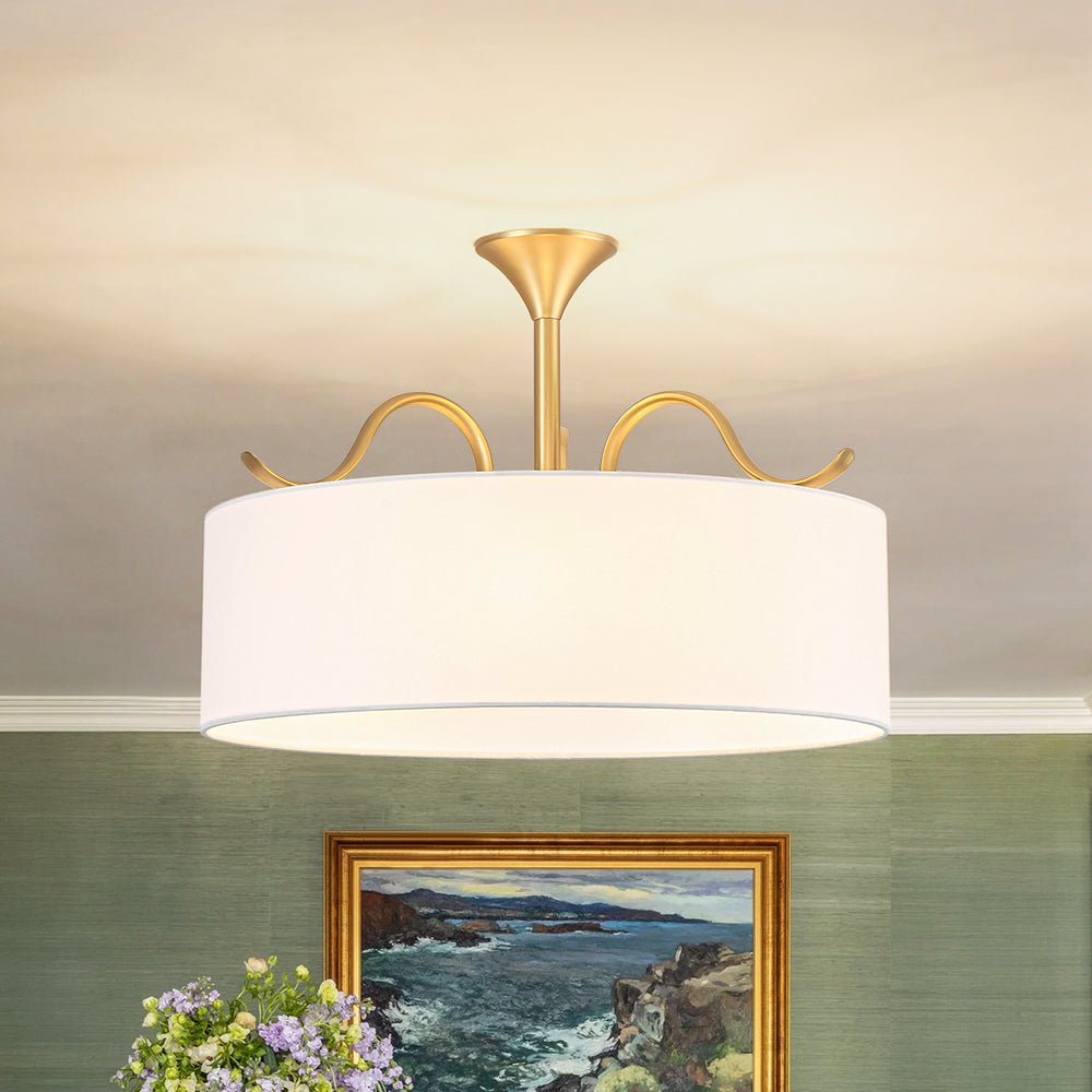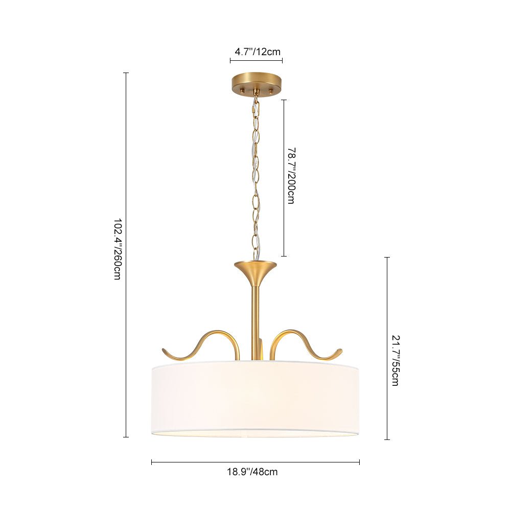 Bring quiet grandeur to your home with this 3-light fabric cage ceiling light, where soft organic textiles and sculptural metal meet in a harmonious sweep of light. A brushed brass frame outlines supports a soft white fabric shade that floats within like a lantern wrapped in evening light. The scrolling details at the top brings a touch of simple Baroque-Inspired elegance. The white fabric shade offers chic bohemian charm while diffuses the light into a smooth, luminous haze, softening edges and creating a calm, inviting atmosphere. Boasting a versatile design, this fabric drum lantern chandelier offers both pendant and semi-flush installation thanks to its removable hanging chain. Perfect for dining rooms, kitchens, foyers, living spaces, or bedrooms, this white fabric lantern semi flush chandelier lightweight in form yet rich in character, bringing poetic balance to any interior.