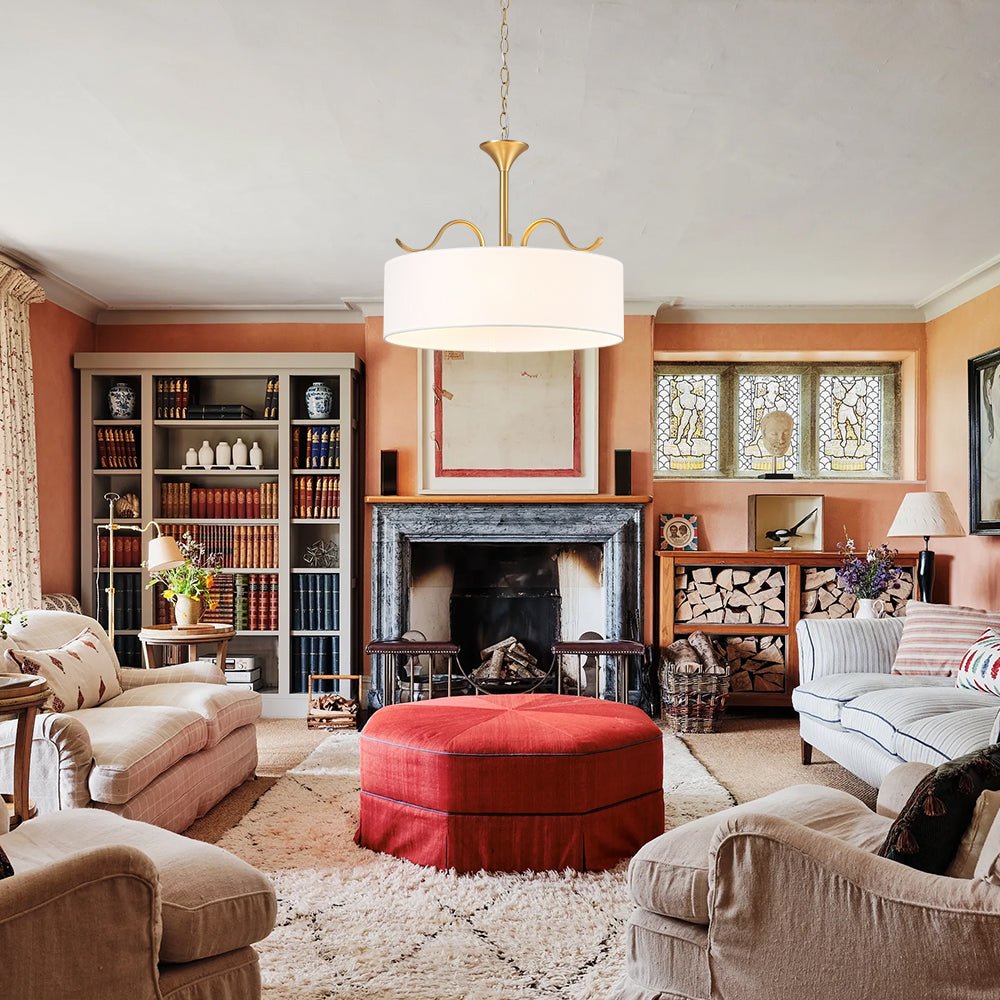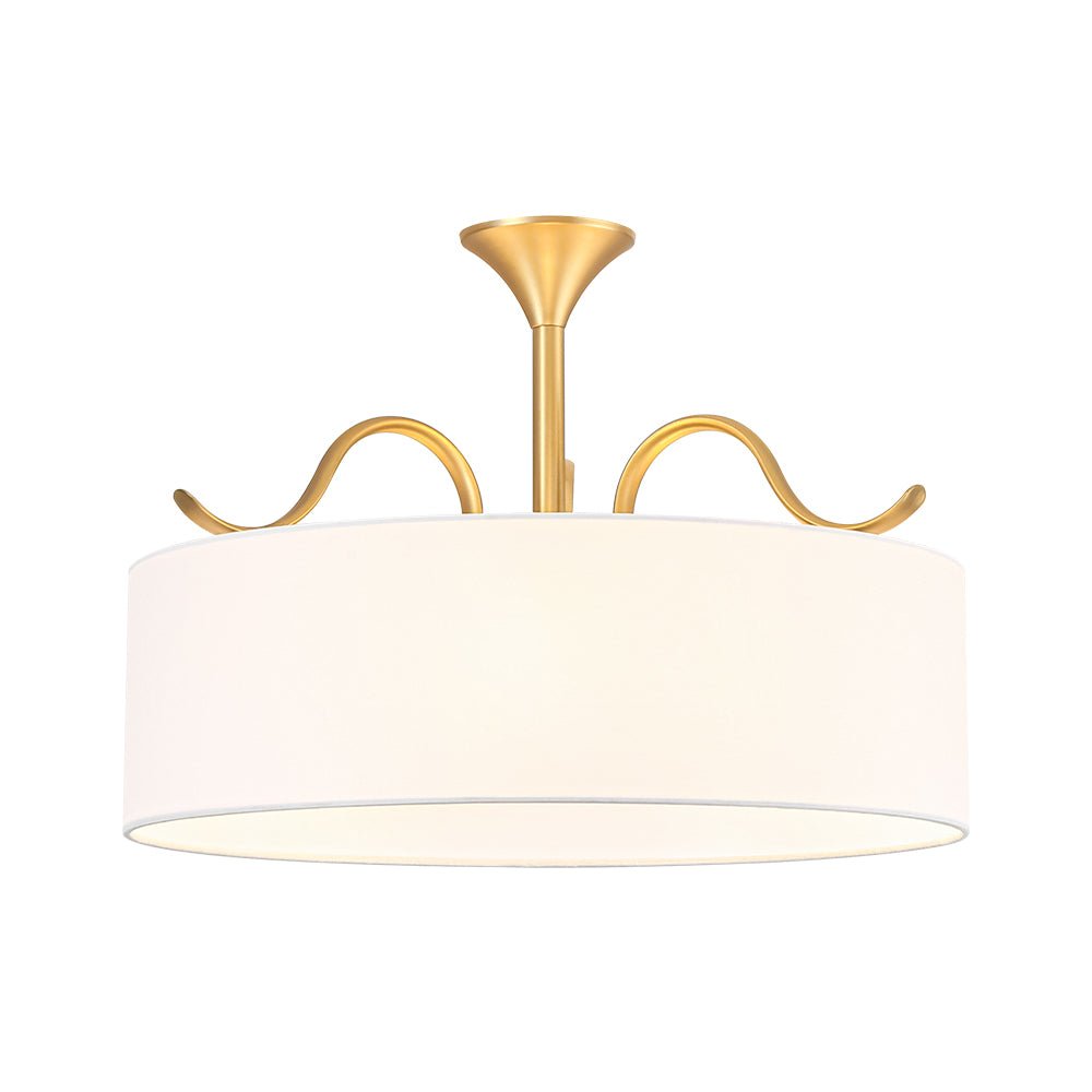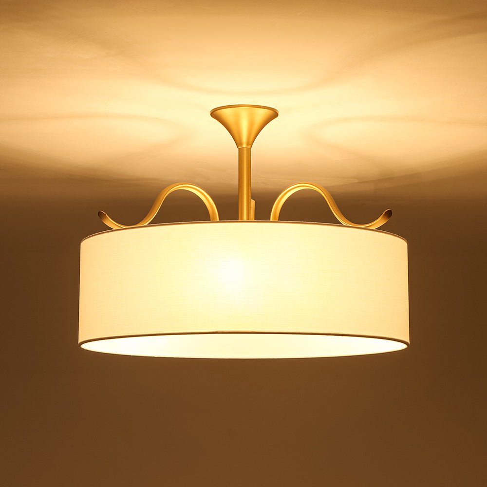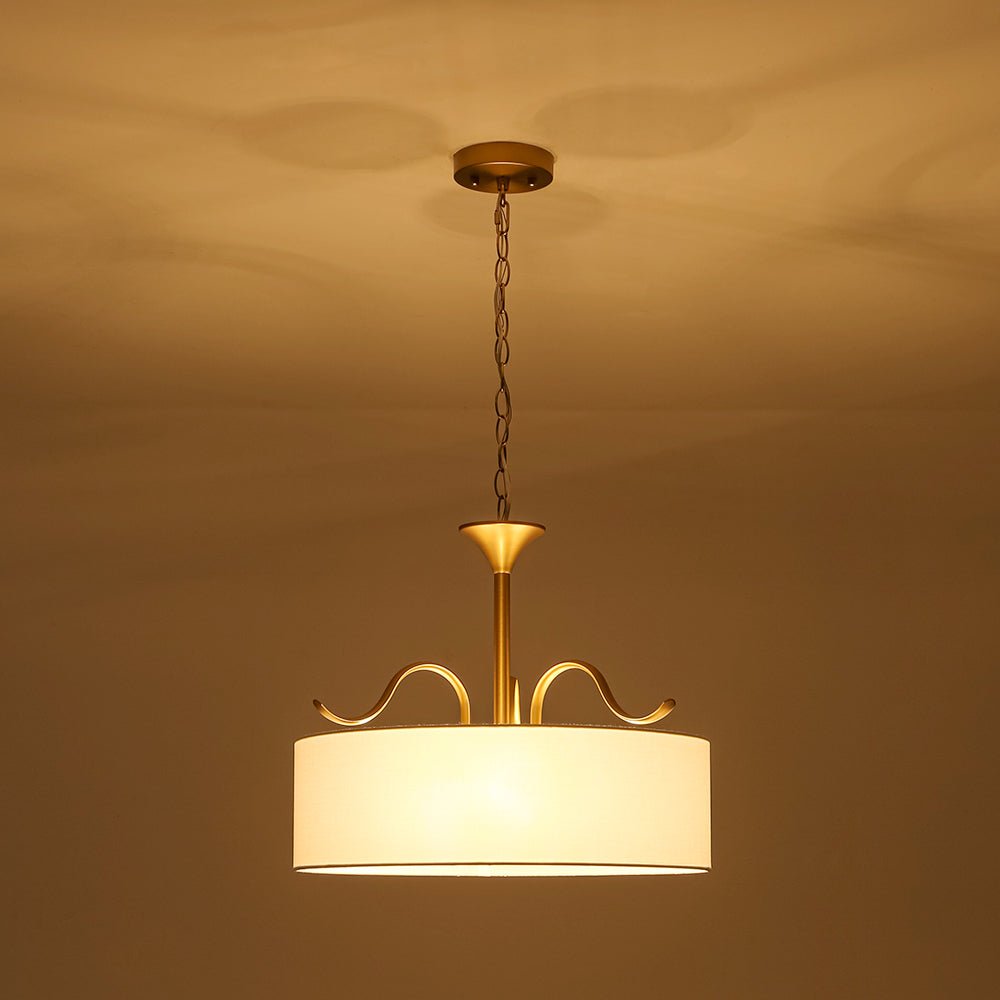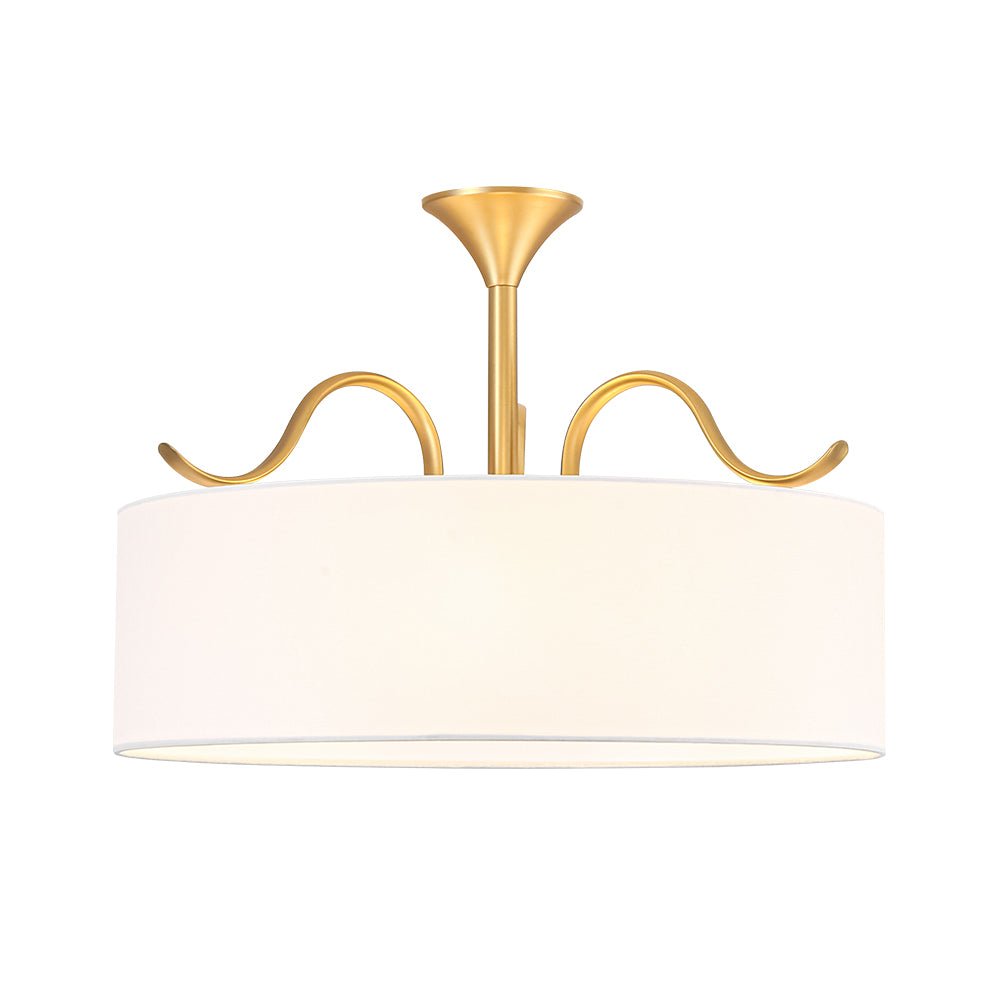 Bring quiet grandeur to your home with this 3-light fabric cage ceiling light, where soft organic textiles and sculptural metal meet in a harmonious sweep of light. A brushed brass frame outlines supports a soft white fabric shade that floats within like a lantern wrapped in evening light. The scrolling details at the top brings a touch of simple Baroque-Inspired elegance. The white fabric shade offers chic bohemian charm while diffuses the light into a smooth, luminous haze, softening edges and creating a calm, inviting atmosphere. Boasting a versatile design, this fabric drum lantern chandelier offers both pendant and semi-flush installation thanks to its removable hanging chain. Perfect for dining rooms, kitchens, foyers, living spaces, or bedrooms, this white fabric lantern semi flush chandelier lightweight in form yet rich in character, bringing poetic balance to any interior.