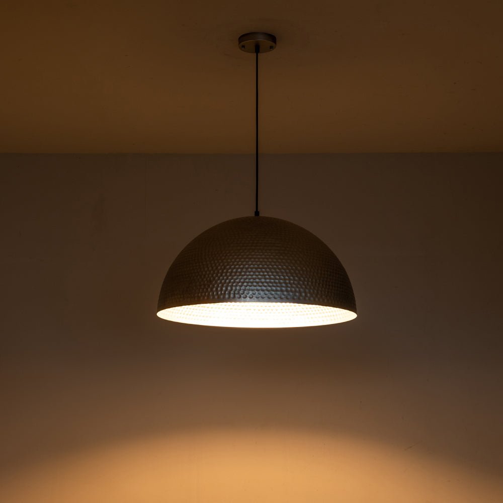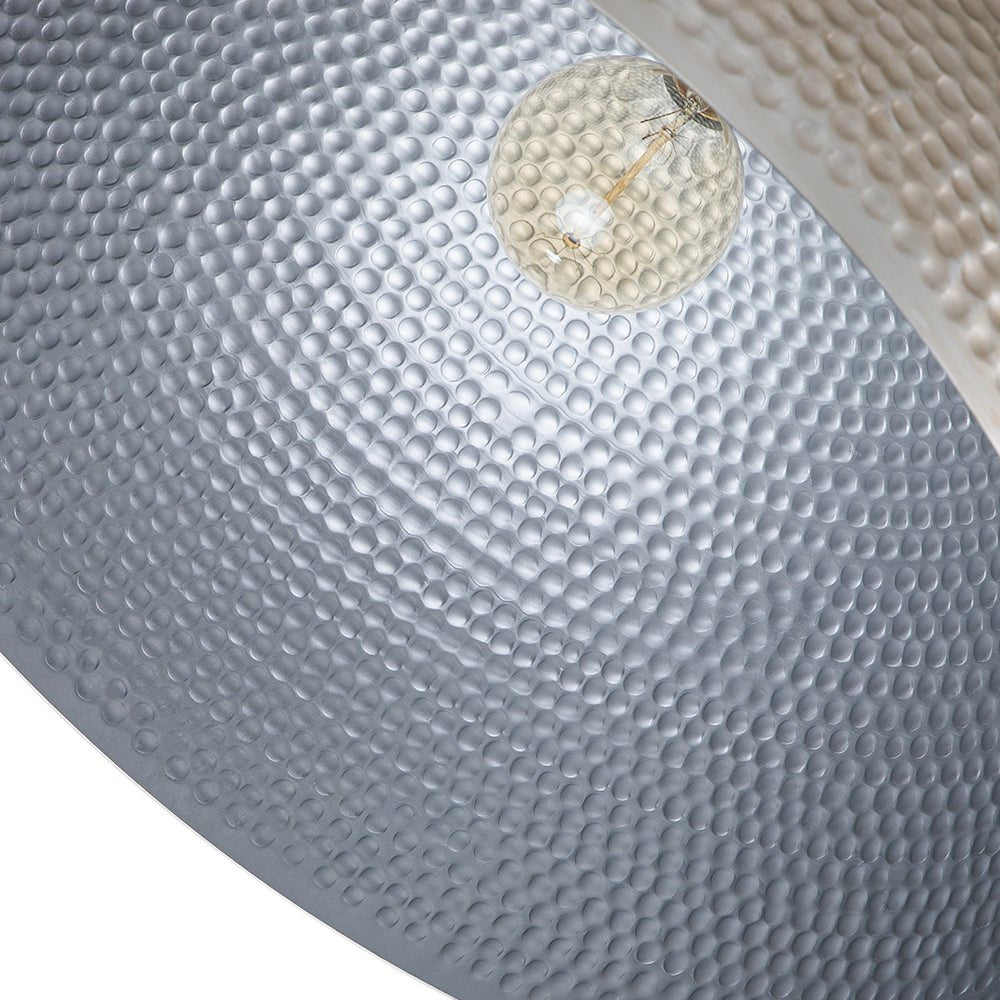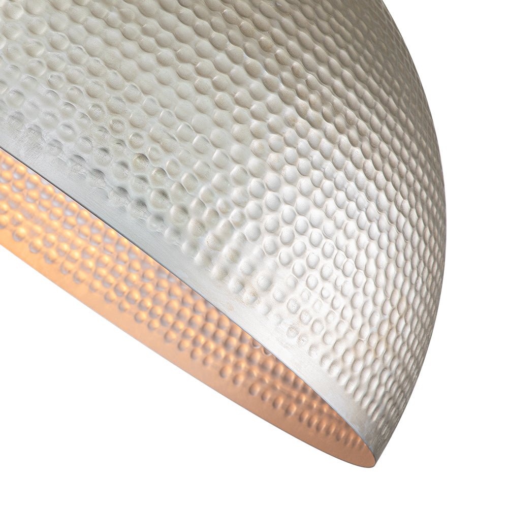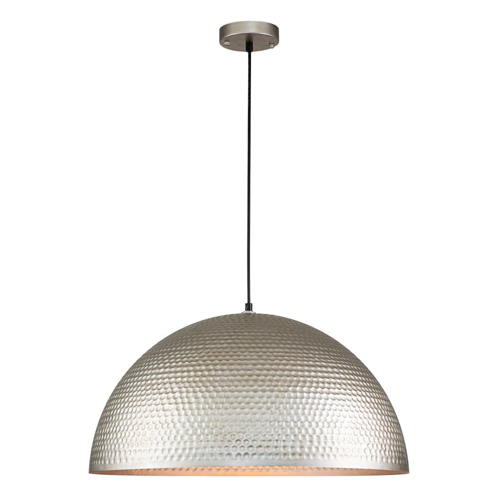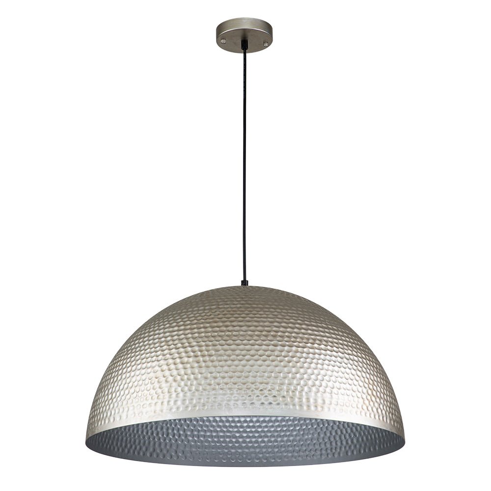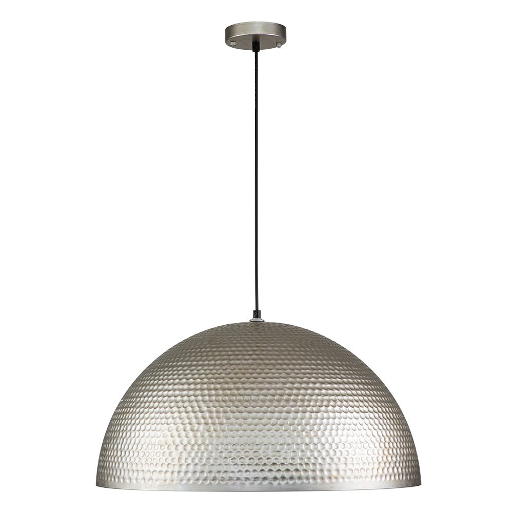 One Light ⢠Oversized Dome Shade ⢠Hammered Metal ⢠Antique Silver Finish ⢠E26 Medium-base Bulbs (Not Included) ā¢Ā Hardwired ⢠UL Listed