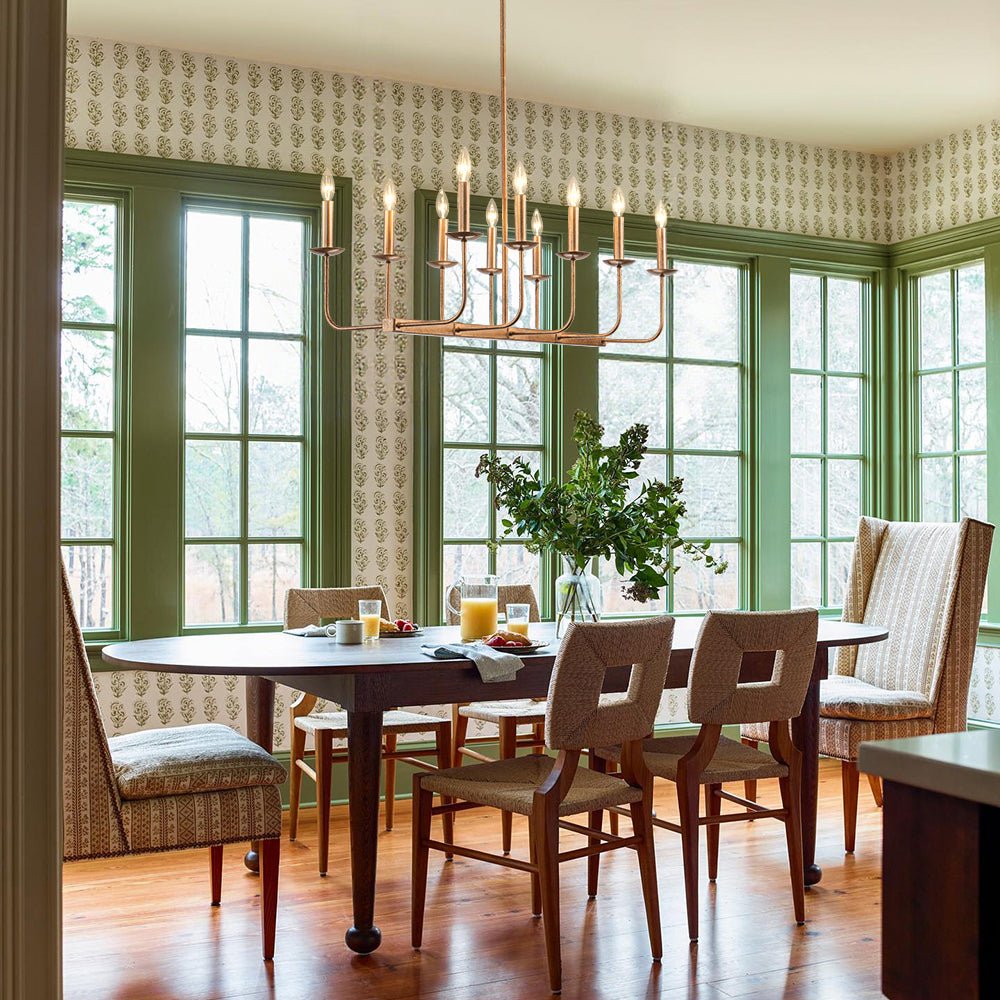Ten slender arms gently curve symmetrically from a streamlined central bar, each topped with a candle-style bulb holder that adds a touch of vintage charm. The open, airy design ensures an even, welcoming task glow, while the adjustable hanging pole offers installation flexibility to suit various ceiling heights.
