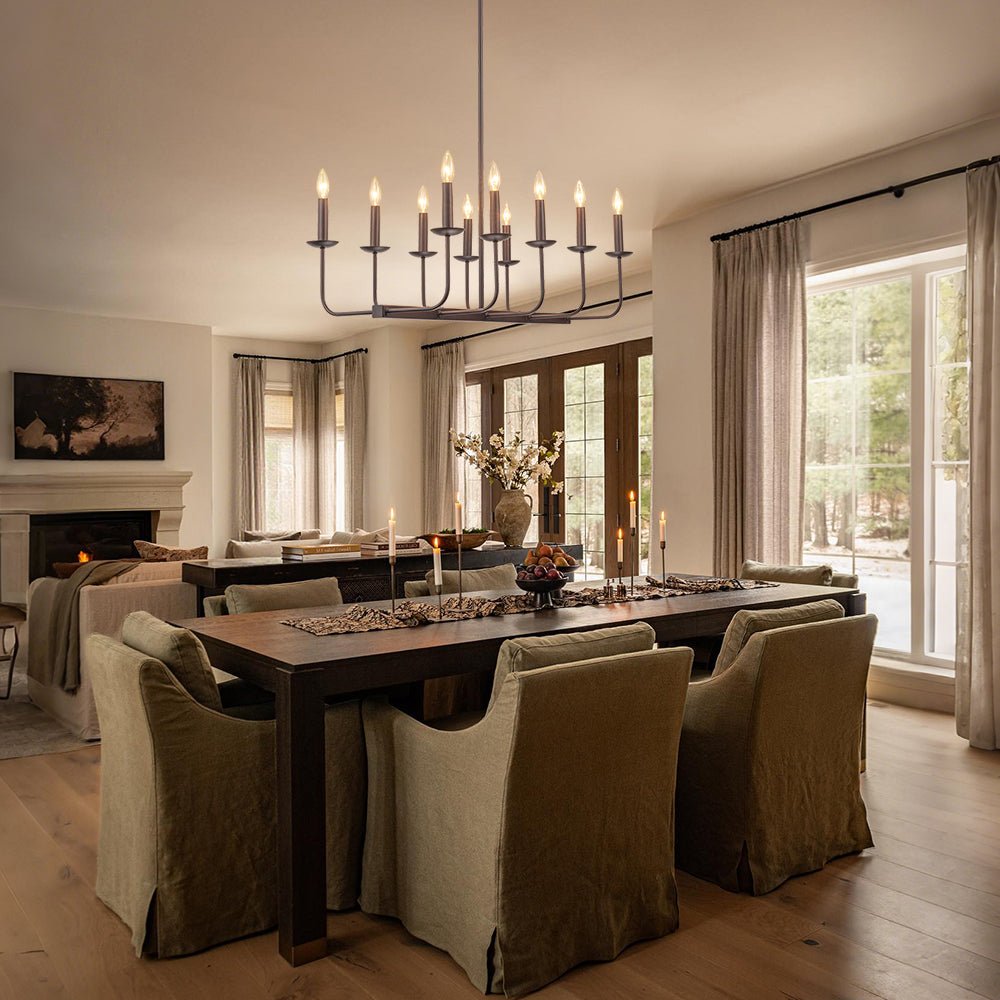 Timeless French elegance meets modern functionality in this 10-light linear metal chandelier. Designed with a clean, elongated silhouette, this island pendant reimagines classic candelabra style with contemporary lines—perfect for dining rooms, kitchen islands, living spaces, bathrooms, or entryways.