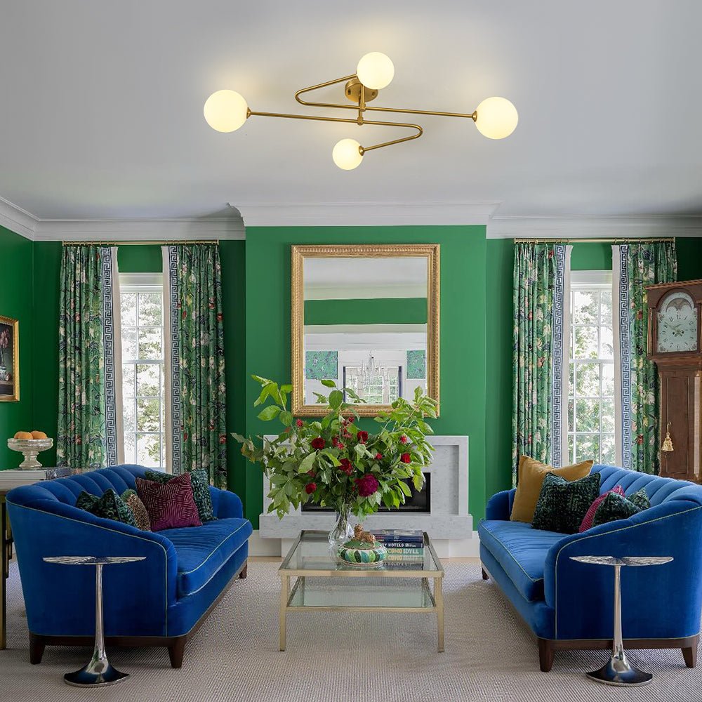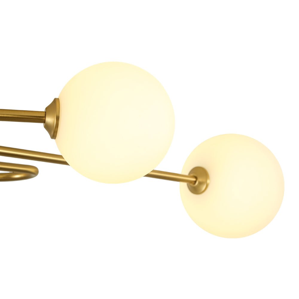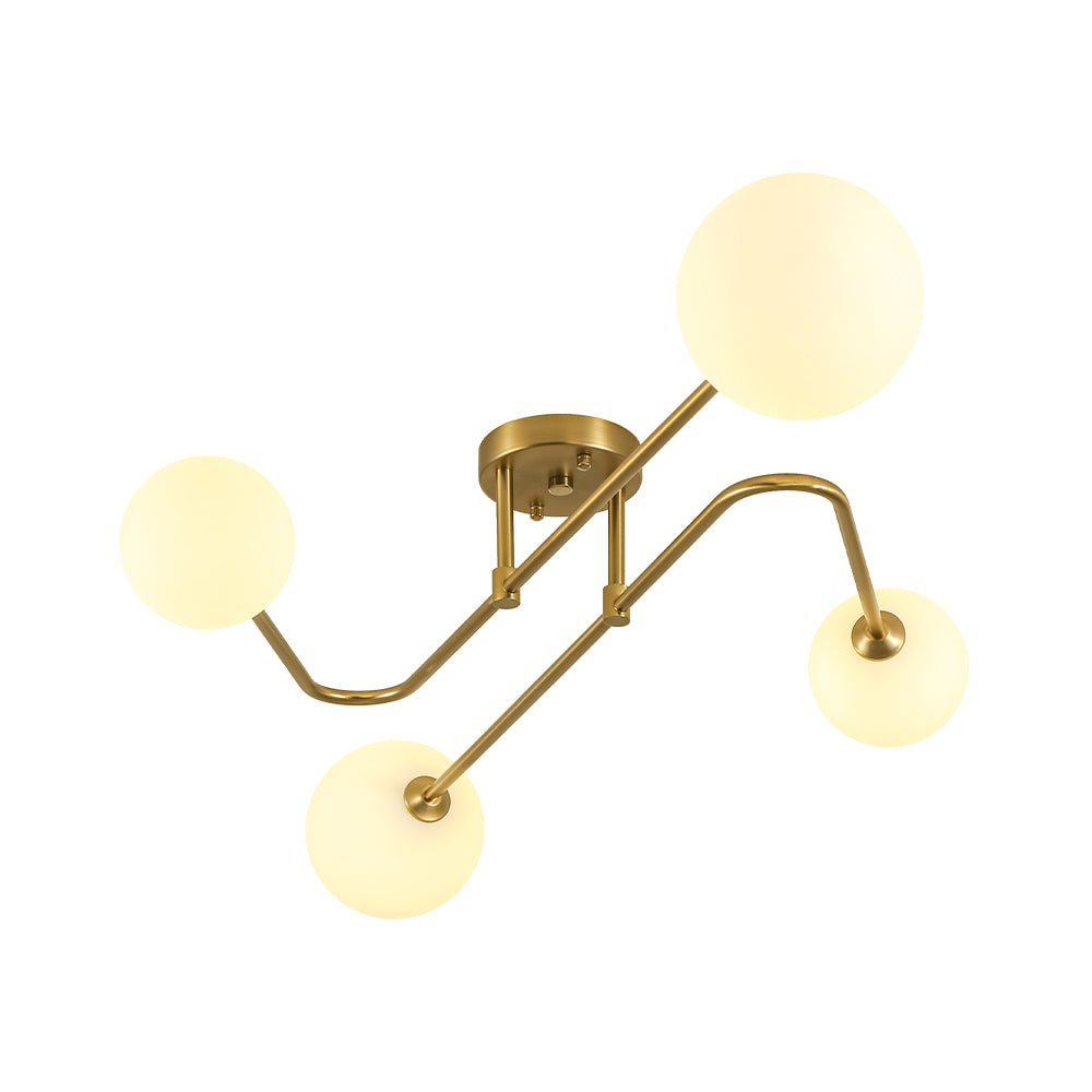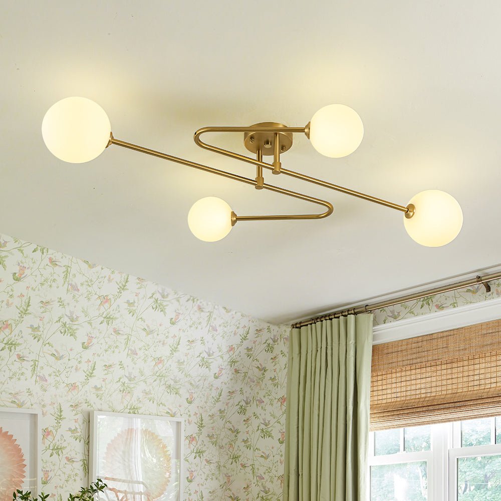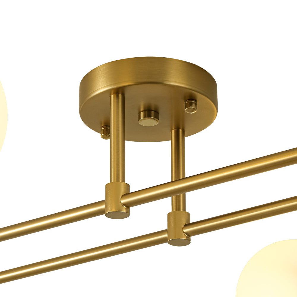 Inspired by both sputnik and linear design, this semi-flush mount ceiling light features a striking geometric frame in a warm brushed brass finish. Four milky white glass globes enhance its modern elegance, while the linear silhouette adds a playful architectural touch. Designed for G9 bulbs (not included) and compatible with a dimmer kit, this linear sputnik light fixture provides adjustable ambient lighting. Ideal for living rooms, hallways, bedrooms, dining areas, or foyers, this brass bubble sputnik semi flush chandelier brings a fresh, contemporary twist to modern and mid-century interiors.