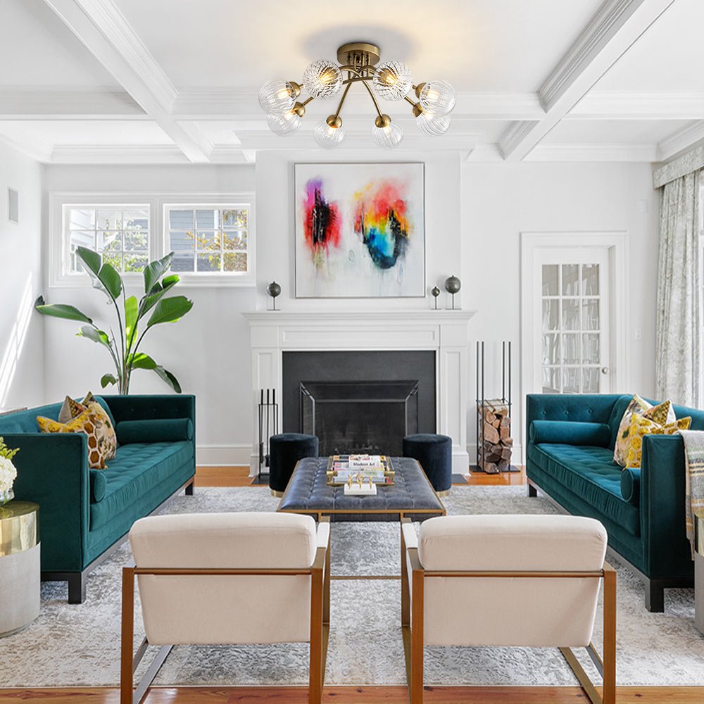 Our 8-light semi flush mount light beautifully blends contemporary elegance with mid-century charm. The sophisticated sputnik design, accented by bubble-inspired elements, features four gracefully curved arms that intersect and drape downward with effortless style. Clear ribbed glass globes at the ends of each arm add depth and refinement, enhancing the overall design with a touch of timeless elegance. Compatible with 5W G9 LED bulbs (not included), the ribbed glass balls softly diffuse the light, creating a warm, inviting glow. Perfect for entryways, dining rooms, kitchens, bedrooms, bathrooms, or living spaces, this ribbed glass sputnik light fixture elevates any room with its captivating presence.