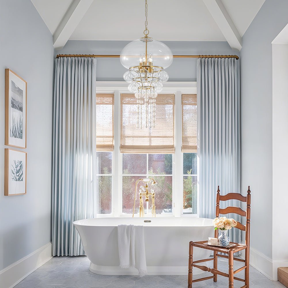 Inspired by the delicate form of a floating crystal jellyfish, this statement pendant light features a brushed brass frame adorned with clear glass accents in a tiered bubble design. A large, dome-like glass shade tops the fixture, creating a soft, airy silhouette that fuses retro charm with modern refinement.