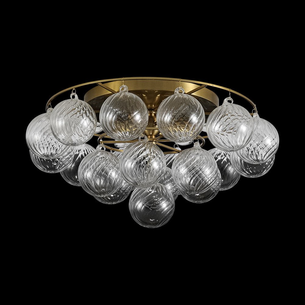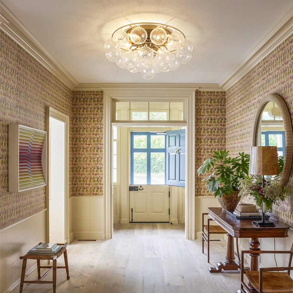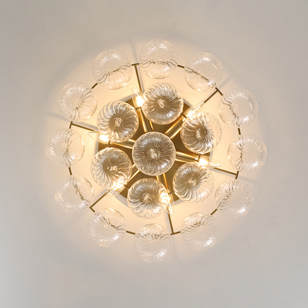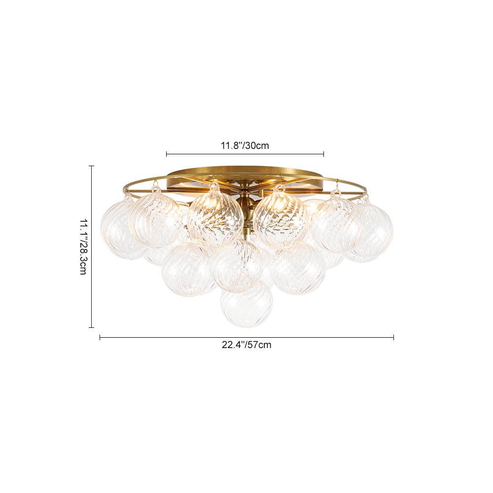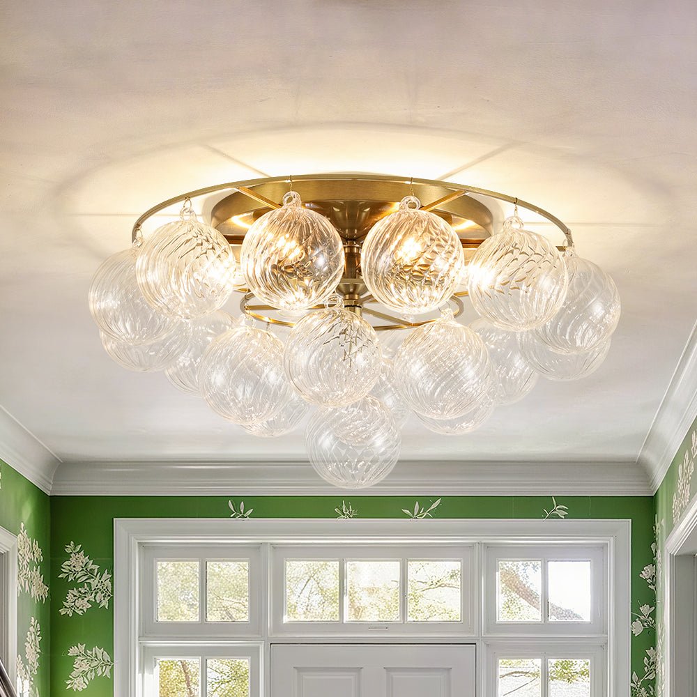 This cluster round ceiling light brings a touch of sculptural elegance with its tiered arrangement of ribbed glass globes. The brushed brass circle frame lends a warm, sophisticated finish, adding a touch of luxury to your space. Like ripples captured in glass, the round tiered design conveys harmonious elegance with a layered aesthetic. Each clear globe, etched with graceful swirled textures, enriches this semi flush mount with depth and dimensional intrigue, evoking the beauty of floating bubbles frozen in motion. When illuminated, the ribbed glass beautifully diffuses the light, casting a soft, radiant glow with shimmering depth. Perfect for low ceilings, dining rooms, bedrooms, entryways, bathrooms, or stairwells, this tiered bubble semi flush chandelier blends modern glamour with timeless artistry, creating a luminous focal point for both contemporary and transitional interiors.
