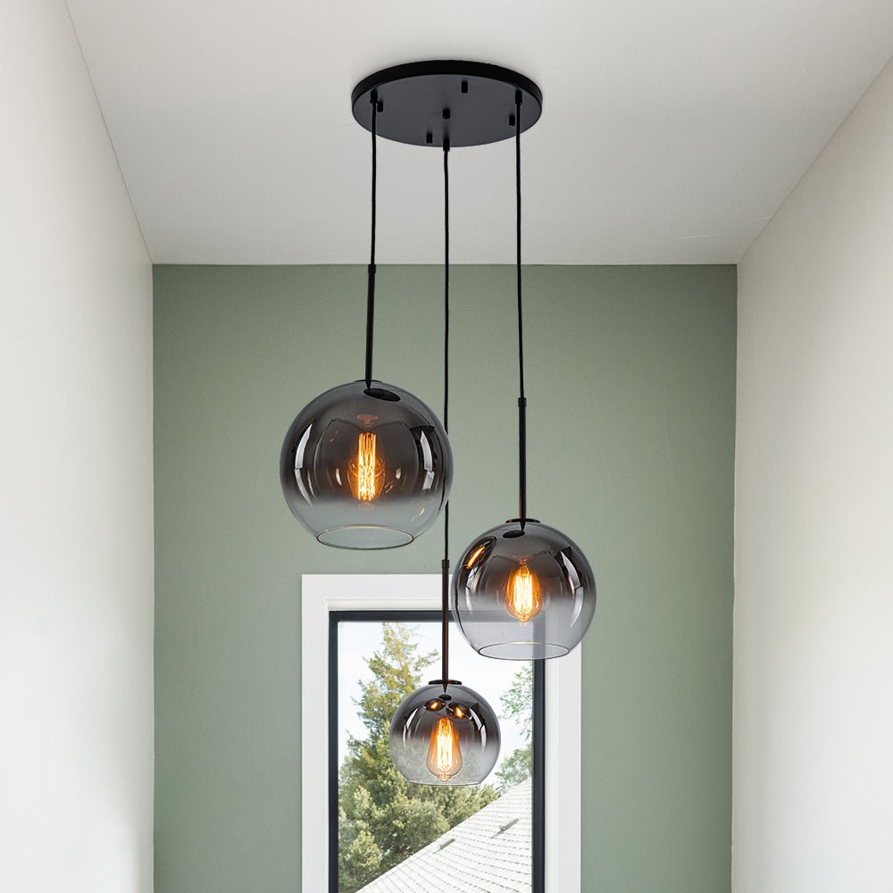This modern 3-light pendant features three glass globes in varying sizes suspended from a round canopy. Each pendant’s hanging height can be easily adjusted to create a cascading effect or a symmetrical arrangement—tailor the look to fit your space and style.