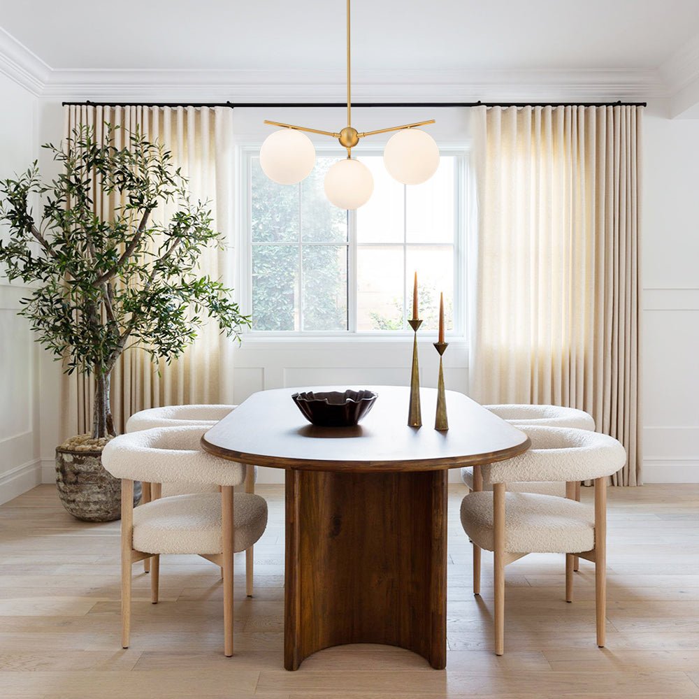 Striking a creative balance between sleek minimalism and refined elegance, this modern linear Sputnik chandelier draws inspiration from the form of a bamboo dragonfly. Three slender arms extend horizontally from a central sphere, creating a dynamic yet harmonious silhouette. Each arm holds a softly glowing frosted white glass globe, diffusing light evenly for a warm, inviting ambiance. Finished in brushed brass, this tired sputnik light fixture boasts a streamlined luxury silhouette, adds a sophisticated touch with a hint of mid-century flair. Ideal for dining rooms, kitchens, entryways, bathrooms, foyers, bedroom, or living spaces, this tiered bubble chandelier brings sculptural beauty and balanced symmetry to any room.
