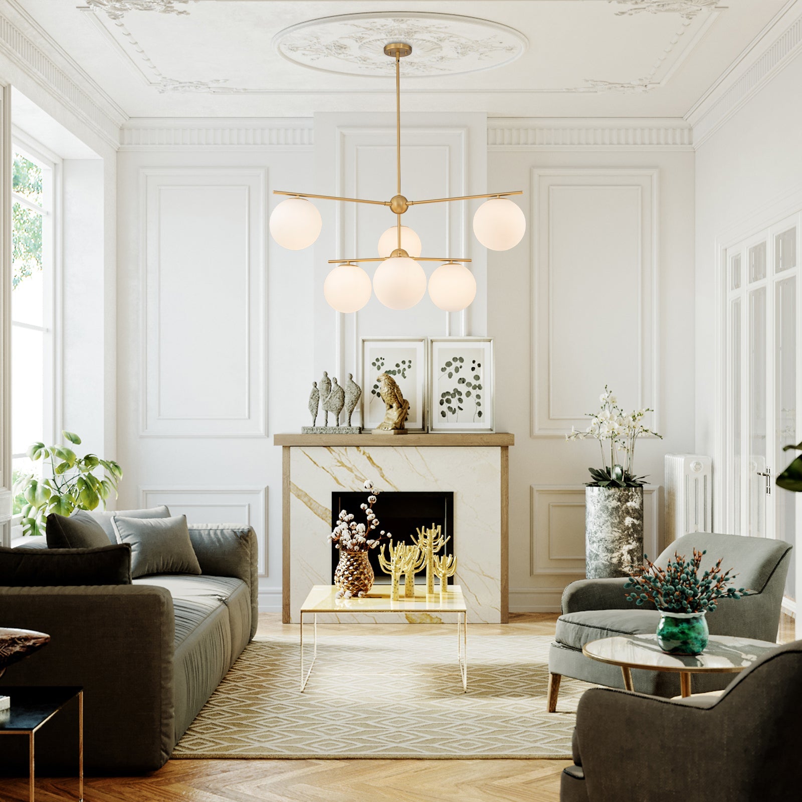 Three/Six Lights • Opal Glass Globes • Bubble Style • Minimalist Sputnik Frame • Linear Arms • Tiered Design • Brushed Brass • E26 Bulbs (Not Included) • Hardwired • UL Listed/ETL