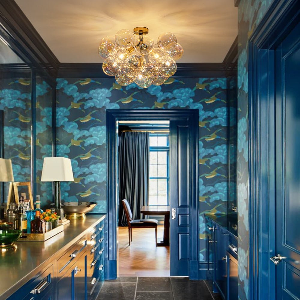 The semi-flush mount design keeps things sleek and modern, while the cluster of glowing orbs adds a sense of playful sophistication. When illuminated, the iridescent glass amplifies the light with a soft, radiant shimmer—creating a mesmerizing ambiance that elevates any room.