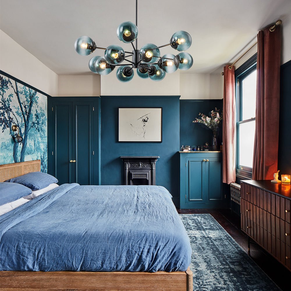 Elevate your space with this glamorous 12-light Sputnik chandelier, designed to make a bold statement with modern elegance. Featuring twelve clear blue glass globes that extend from a sleek cylindrical center, this sputnik light fixture captures the iconic mid-century bubble silhouette and tiered design with a fresh, contemporary twist. Each globe showcases a gradual blue hue, creating a captivating gradient effect that enhances depth and visual interest. The blue-tinted glass adds a stylish layer of sophistication and a soft pop of color, making the fixture stand out beautifully in any setting.