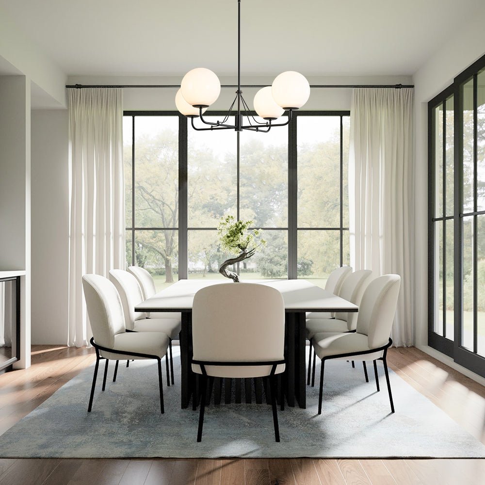 The milky white glass globes offer a luxurious bubble-like feel, their lustrous surfaces catching natural light even when the fixture is off. When illuminated, the globes softly diffuse the glow, casting a cozy and inviting ambiance throughout the room.
