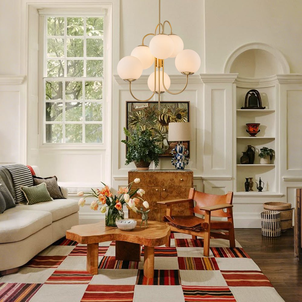 Finished in brushed brass, the 6-light sputnik light fixture exudes mid-century modern sophistication, while milky white glass globes enrich the design with a luxurious, bubble-like allure. These softly diffused spheres cast a warm, ambient glow that enhances both the function and atmosphere of the room.
