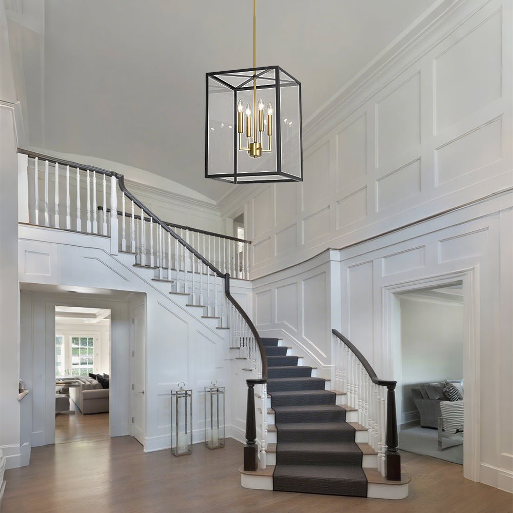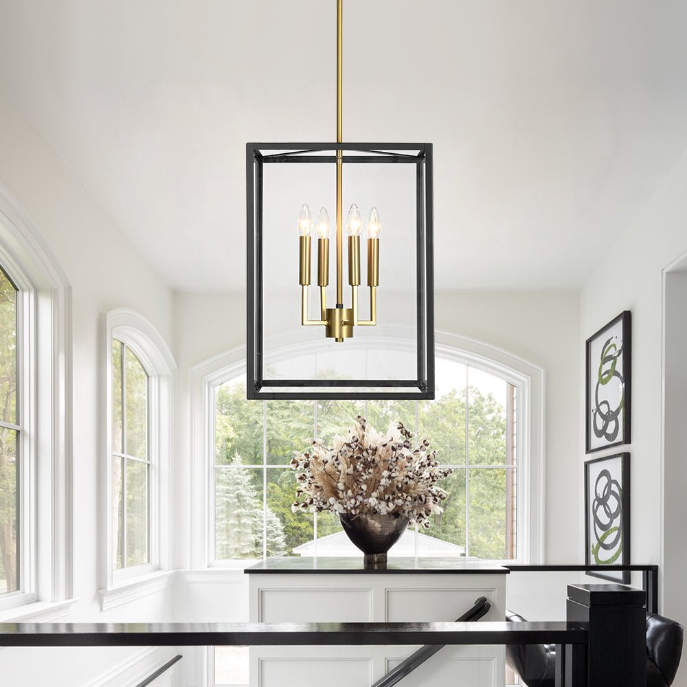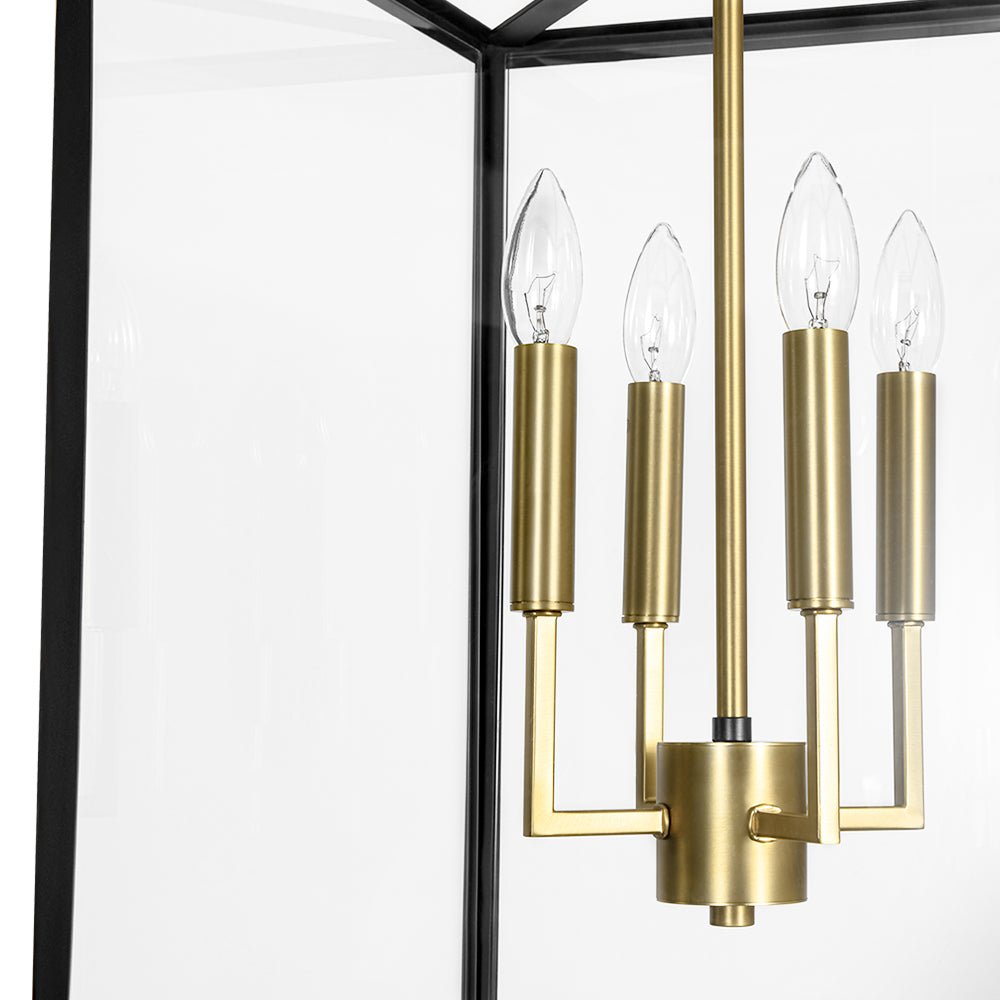 Effortlessly complementing any interior style, our 4-light lantern chandelier strikes the perfect balance between refined simplicity and timeless farmhouse elegance. Ideal for entryways, dining rooms, kitchen islands, living rooms, bedrooms, or bathrooms, this large cage pendant light features four large rectangular clear glass panels encased in a sleek square frame. Inside, a classic 4-light candelabra (E12 bulbs, not included) offers ample illumination for both ambient and task lighting. The striking contrast of a matte black cage with brushed brass candle-style sockets brings a mid-century modern appeal with a touch of manor-style sophistication.