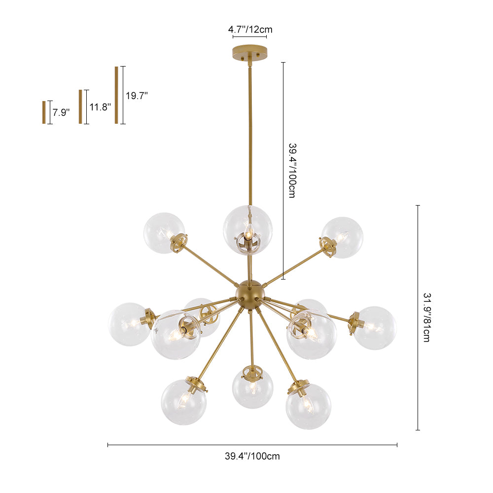 This modern sphere chandelier offers an energetic sputnik silhouette, with a burst of spherical shades constructed with clear glass for ample illumination. The matte black or chic brass finish adds a superier accent to this glass globe chandelier. Moreover, this glass globe chandelier is available with a dimmer switch and dimmable bulbs (both not included) for the right amount of lighting from morning to evening. Hung by an adjustable matching pole and an adaptor, this sphere chandelier is compatible with both flat and sloped ceiling according to your ceiling height. Add some drama factor in the living room, dining room, foyer, entryway, hotel, and restaurant with this sphere 12-light sputnik chandelier.