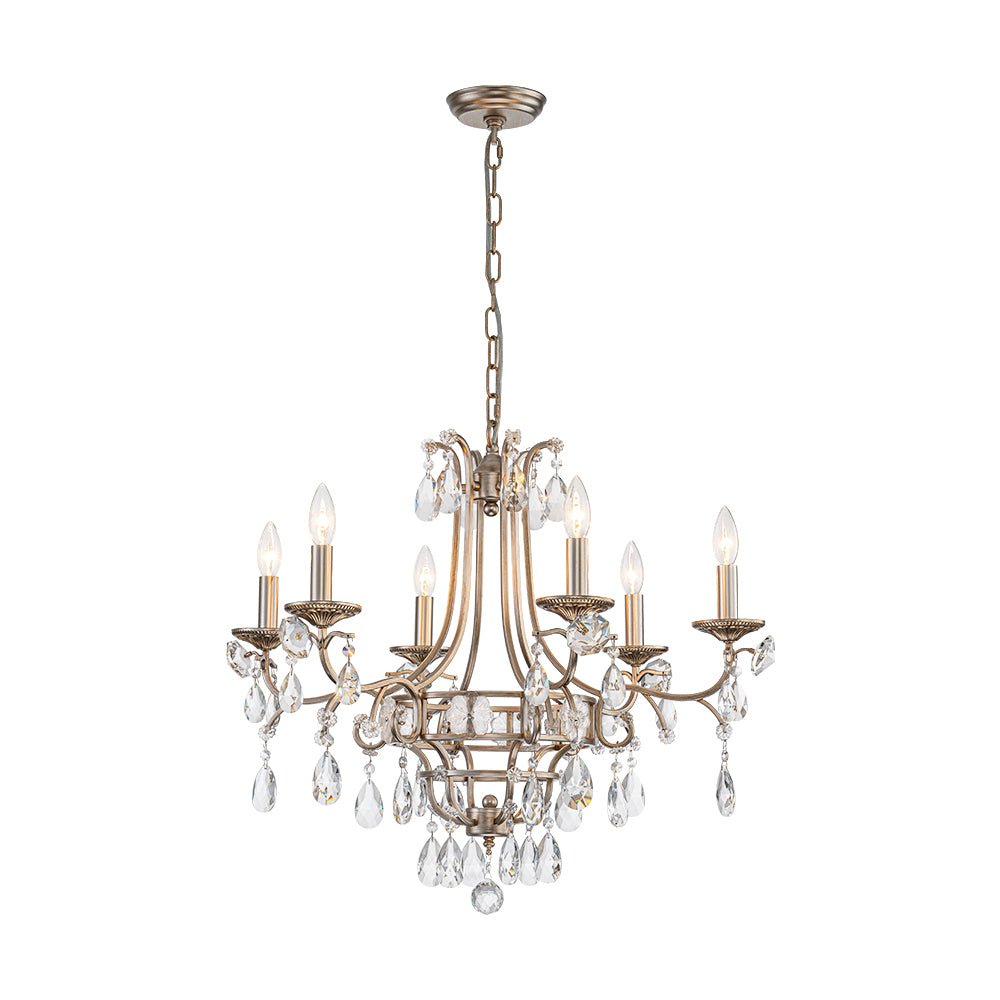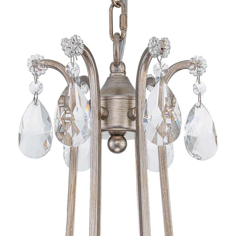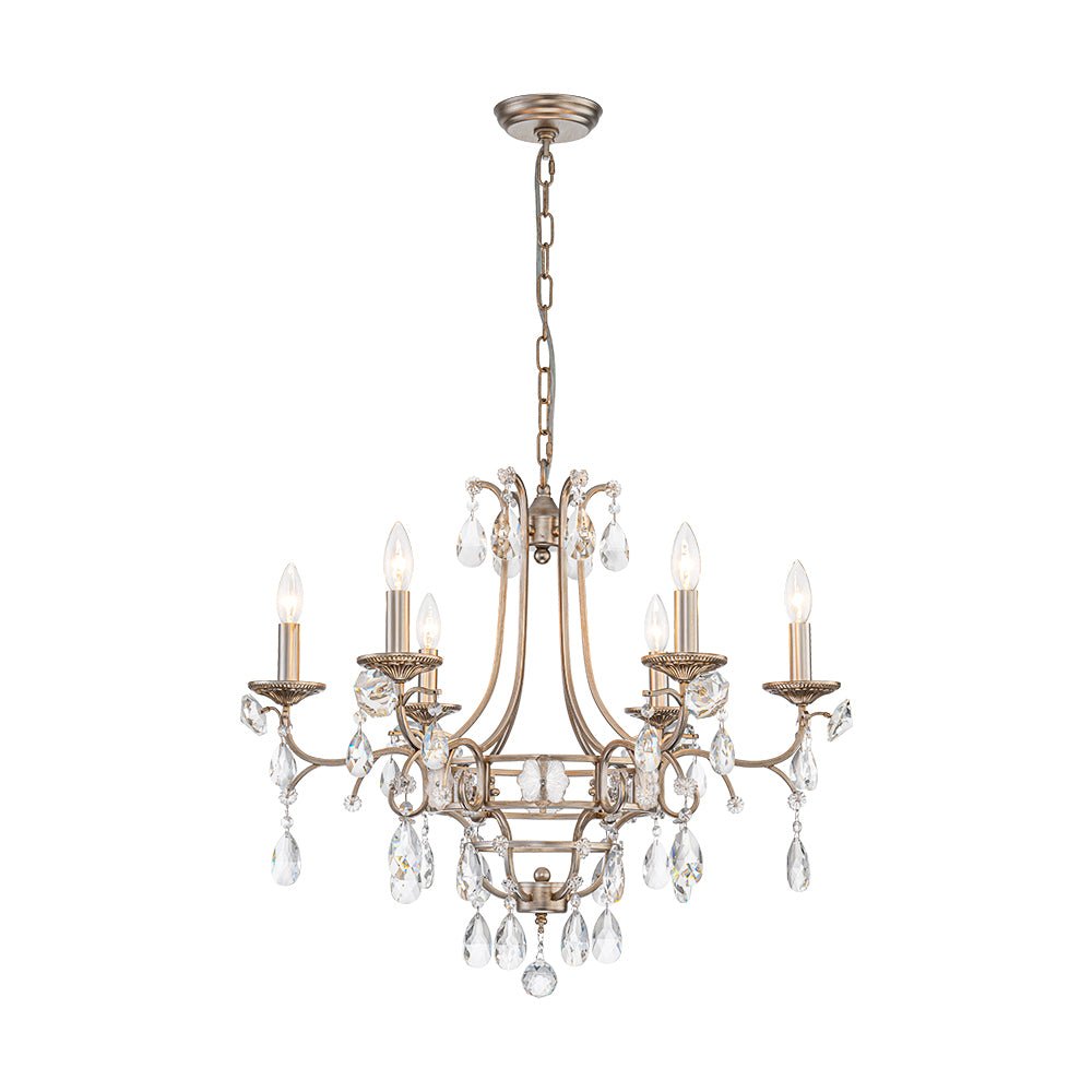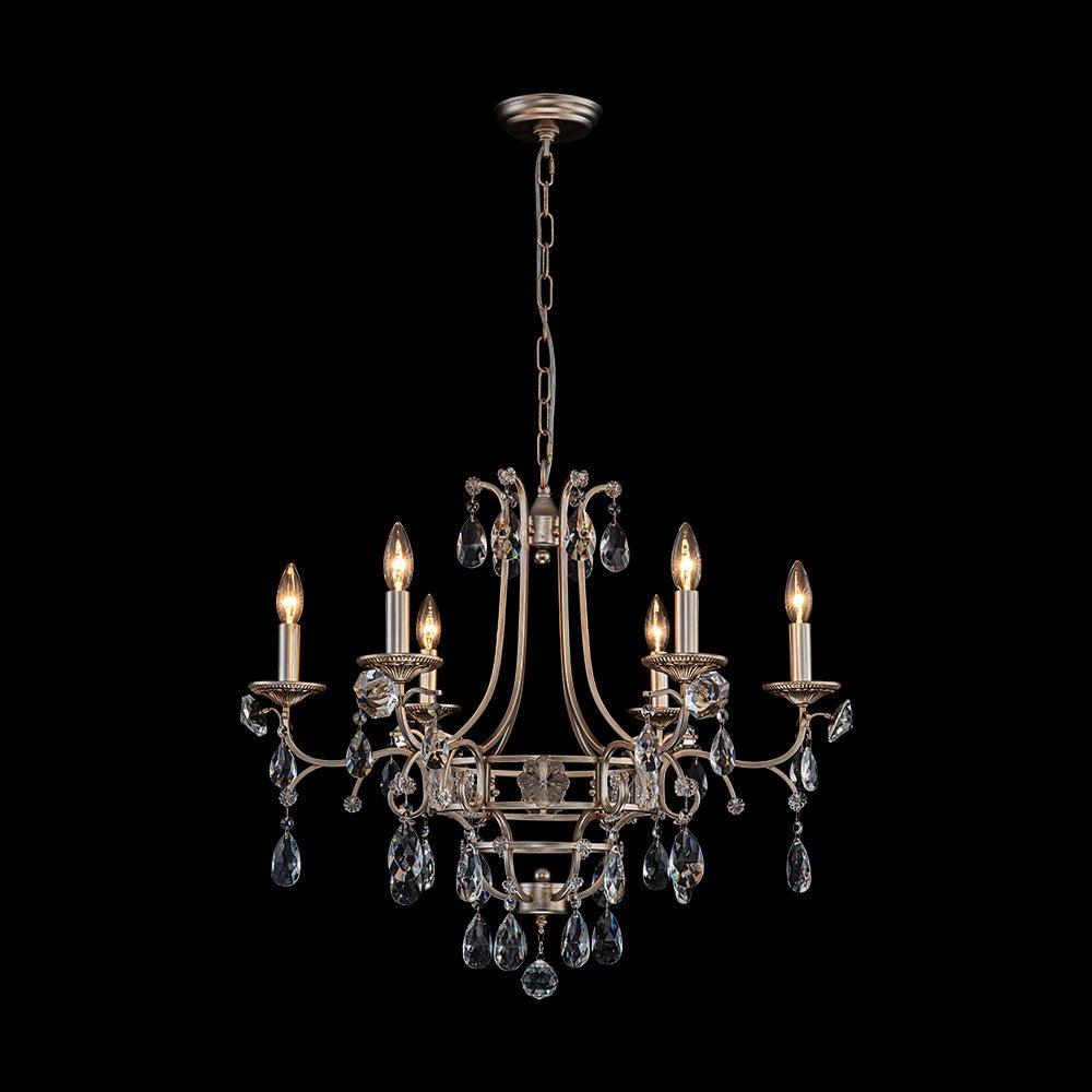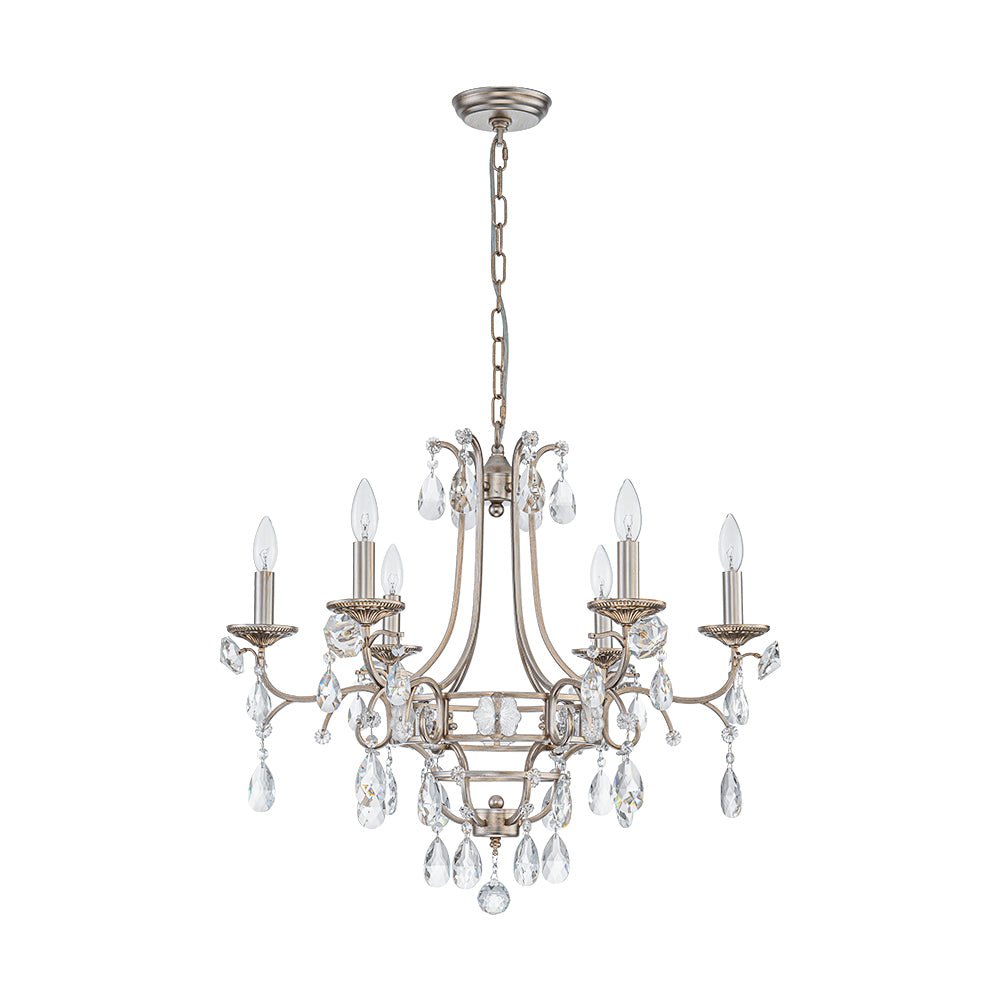 Inspired by the elegance of traditional empire chandeliers, this 6-light crystal fixture showcases an airy, curved frame accented with graceful scrolling details. Faceted crystal drops and delicate glass flowers sparkle beautifully as they catch the light, while the antique silver finish lends a touch of shabby chic luxury with timeless sophistication.