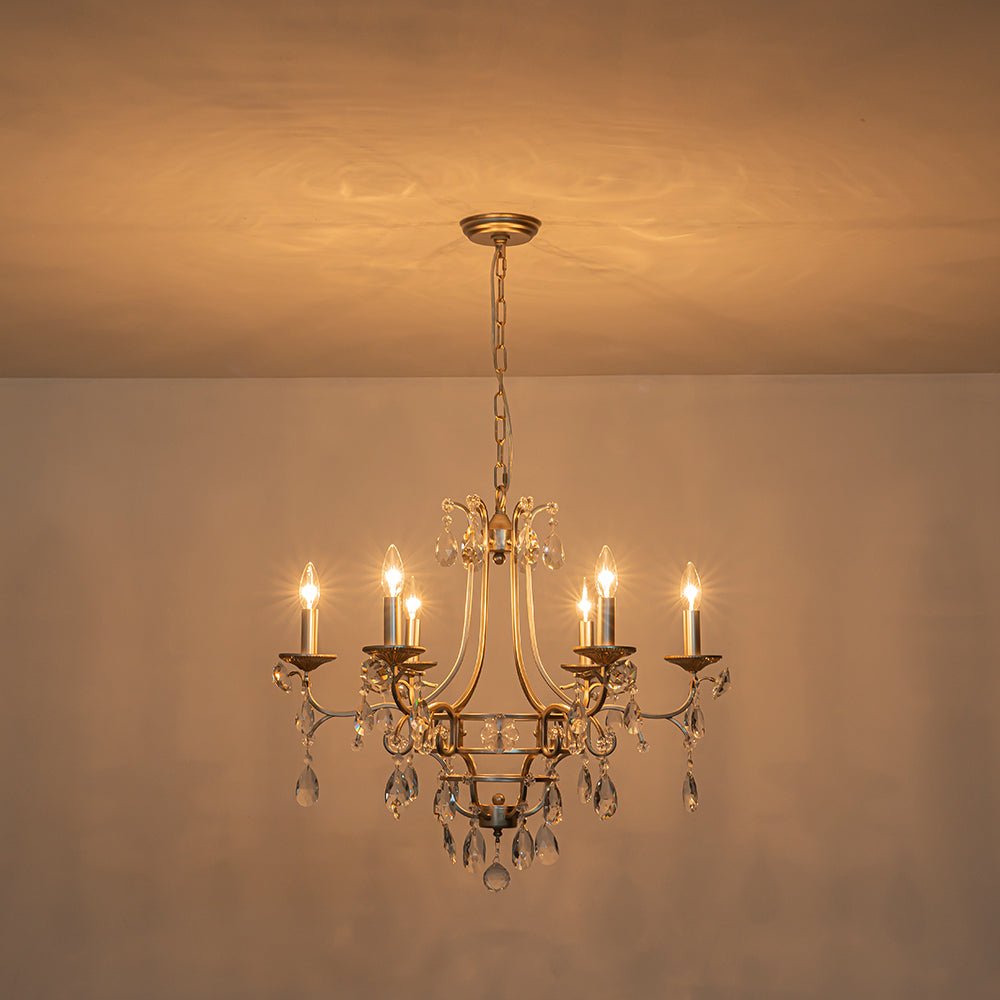 Candle-style arms, each designed for an E12 candelabra bulb (bulbs not included), add old-world charm and provide focused, functional illumination. Ideal for both beauty and practicality, this crystal empire candle chandelier enhances dining rooms, kitchen islands, bathrooms, living rooms, bedrooms, foyers, entryways, or even walk-in closets with refined style.