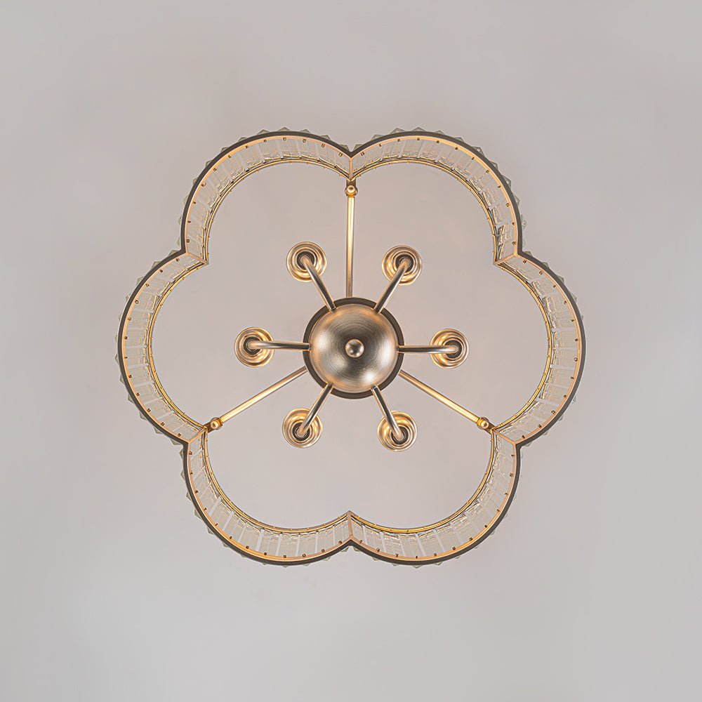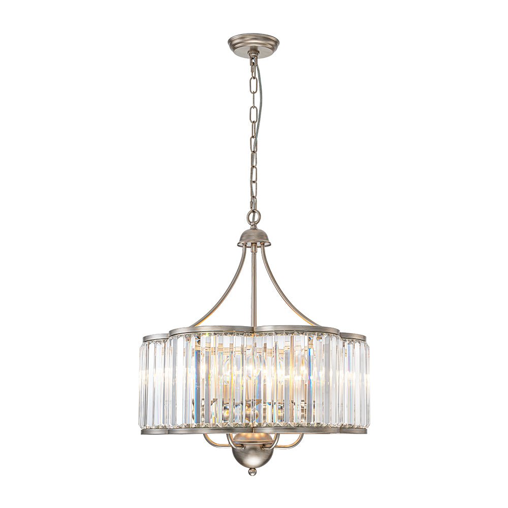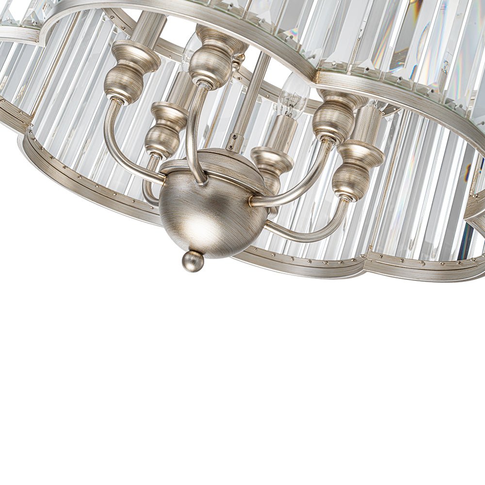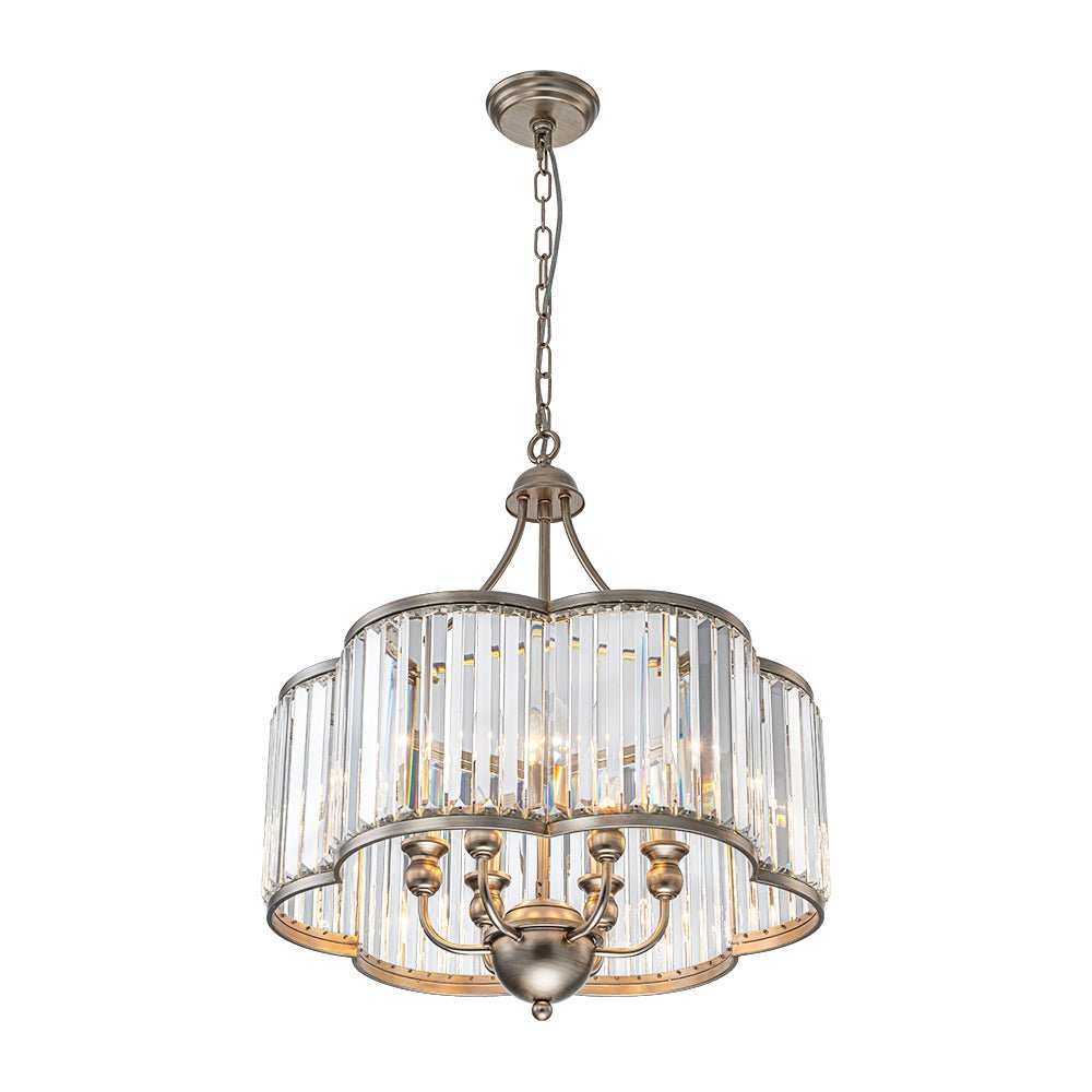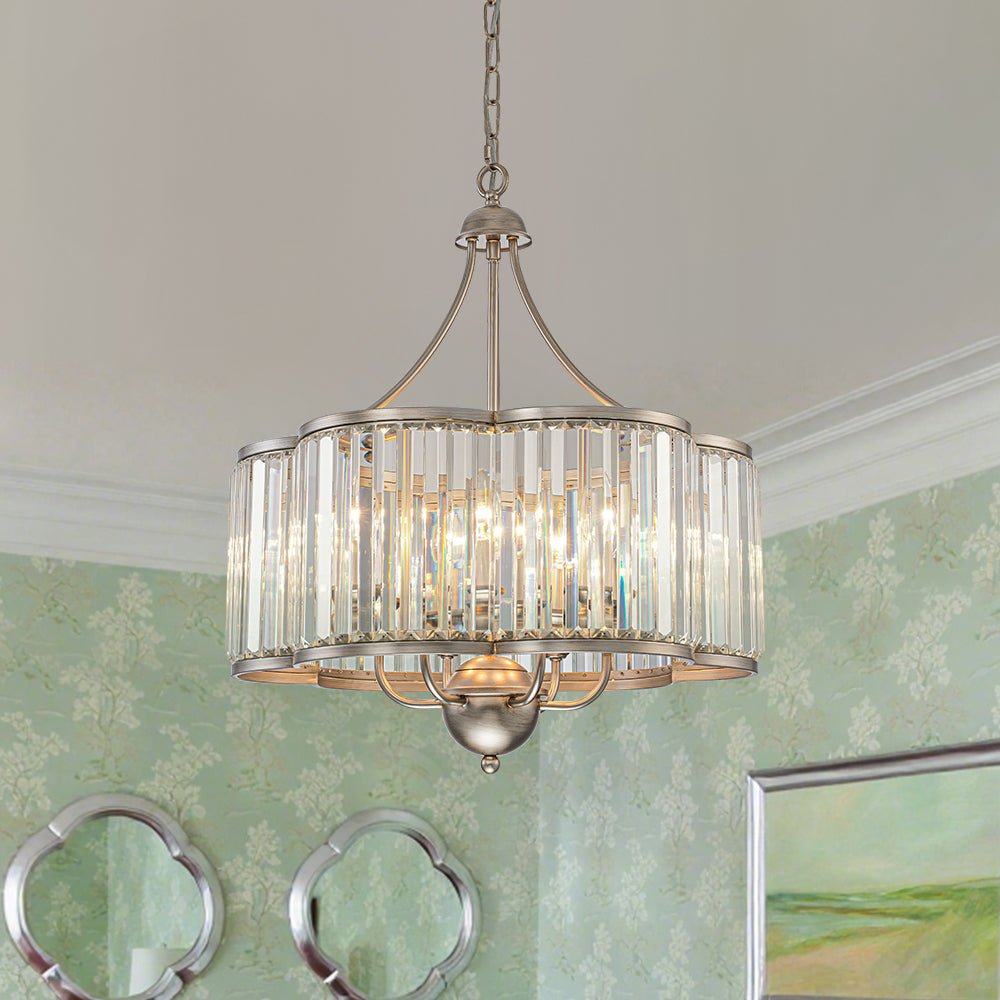 Glam your interior with this elegant candle-style chandelier, featuring a graceful clover-shaped silhouette crafted from antique silver-toned metal for a touch of shabby chic sophistication. The scalloped frame is adorned with vertical faceted crystal prisms that beautifully reflect and refract light, creating a dazzling effect from every angle.