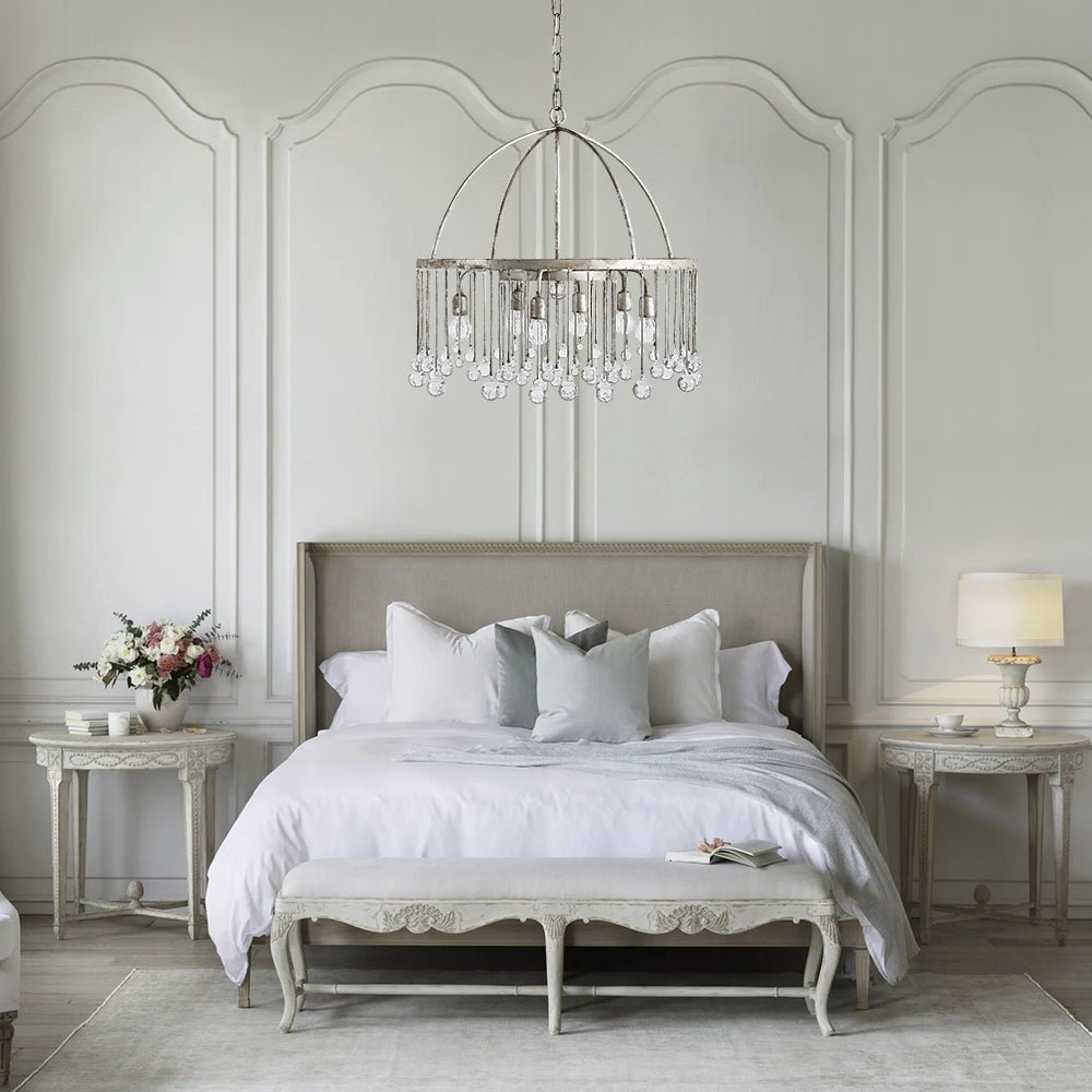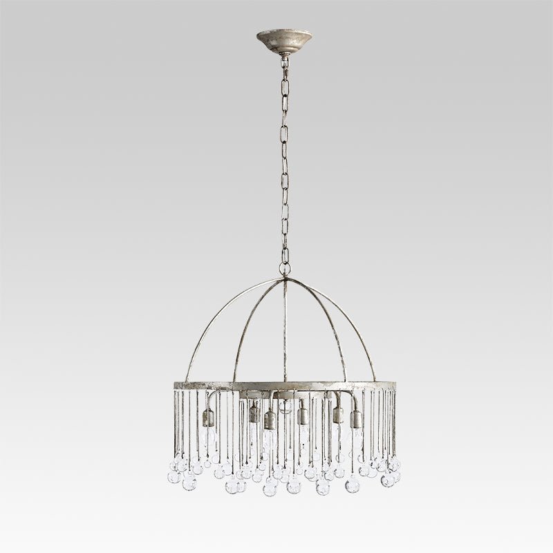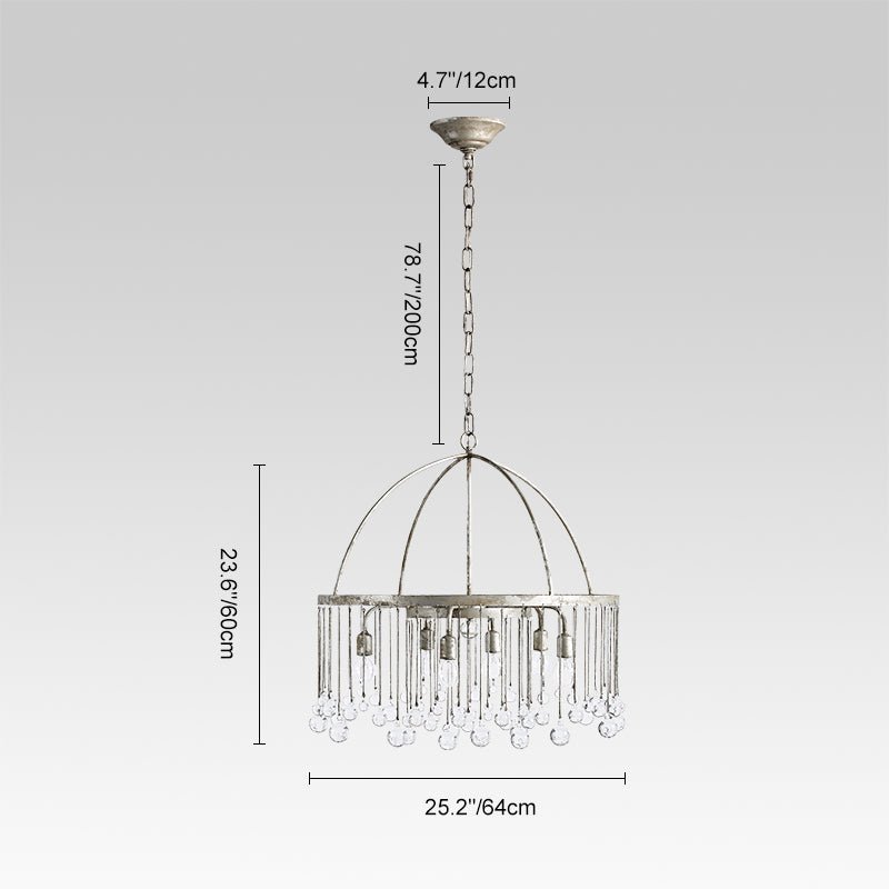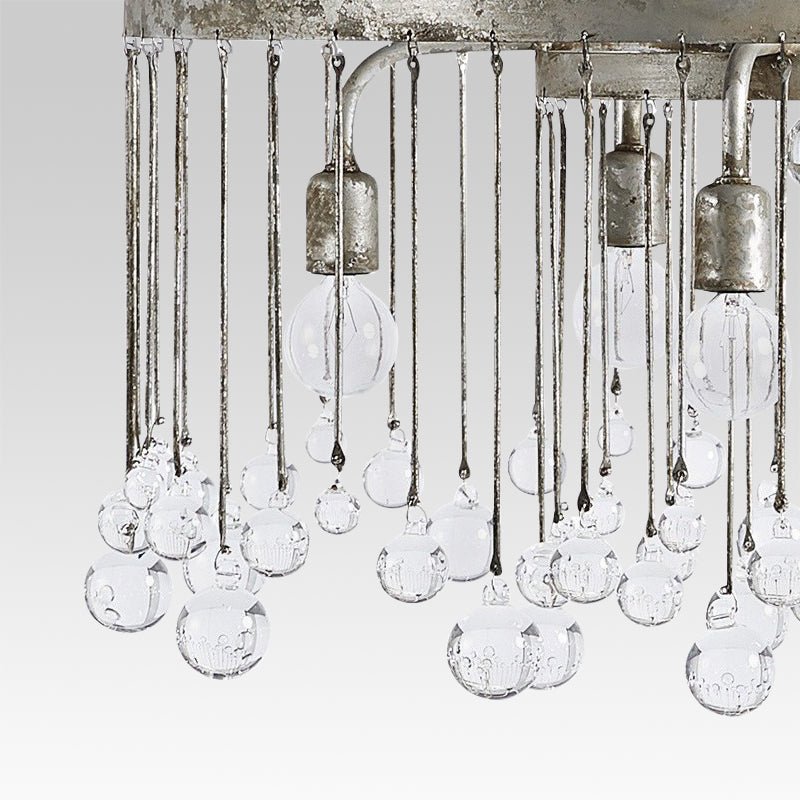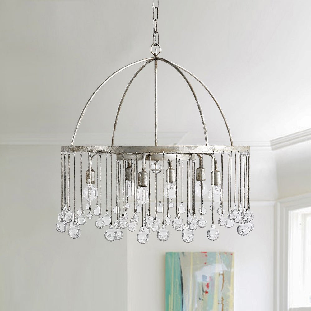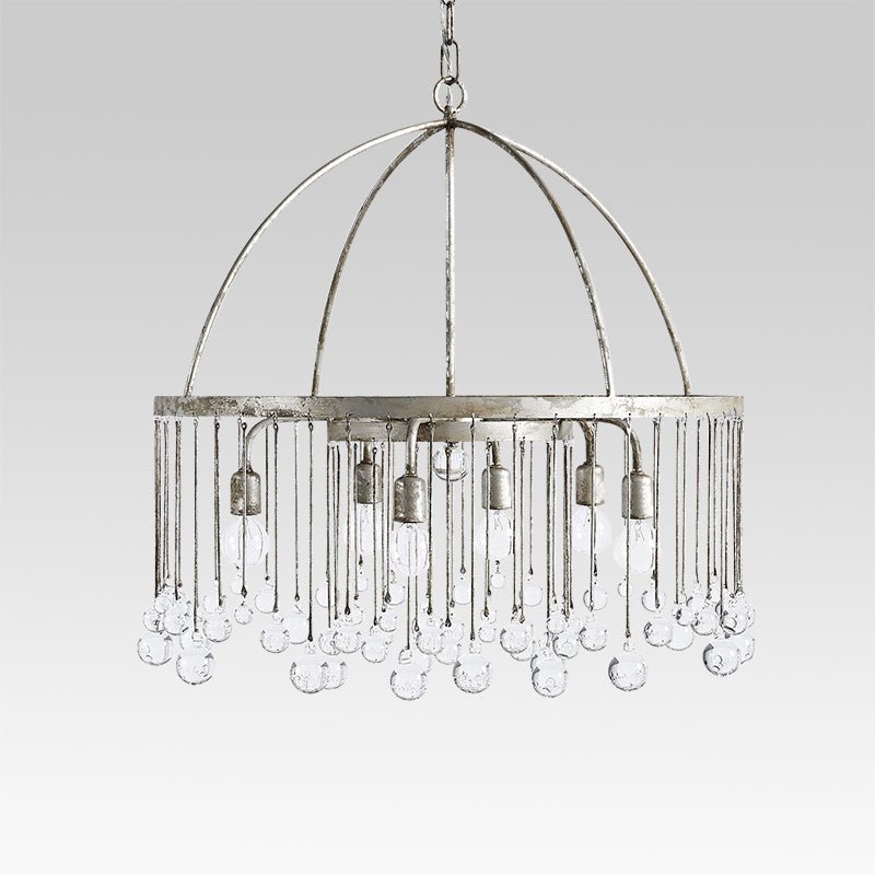 Luxurious yet not overwhelming, like an open dome roof-like frame with beautiful glass crystal balls hanging down as clear raindrops from the round rim, this vintage luxe pendant light plays a romantic song of rain for the space. A rusty silver finish brings a shabby chic touch to this glass ball chandelier that enhances your home decor and makes you indulge. We love to suspend this glass crystal raindrop chandelier in the living room, dining room, bedroom, or lobby for gracefully chic results to catch everyone's heart.