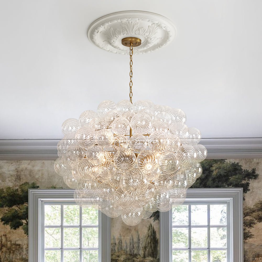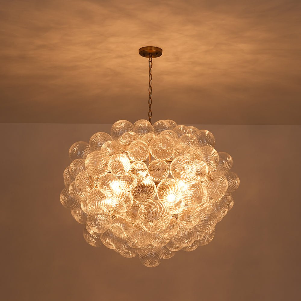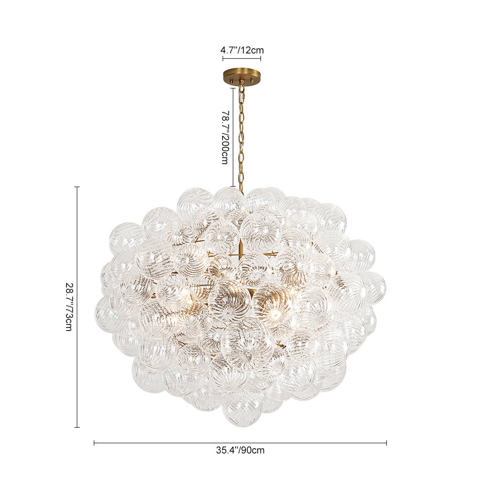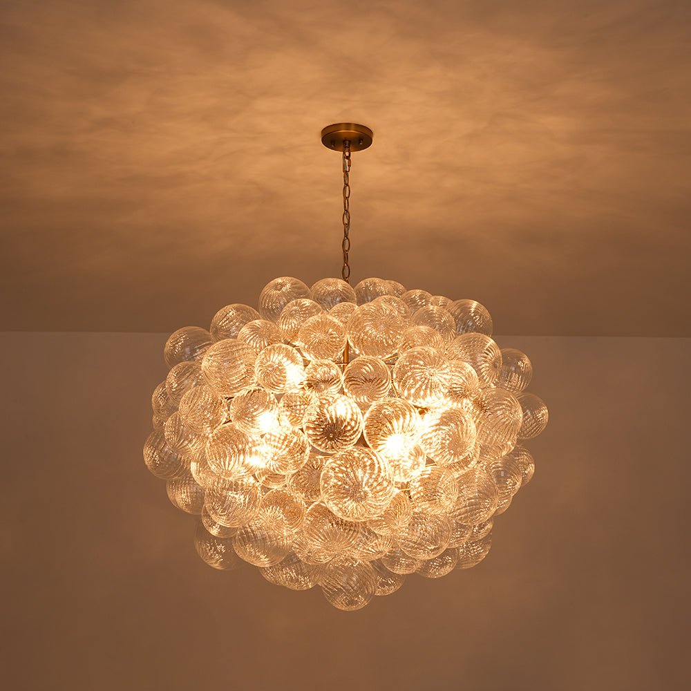 Experience the height of luxury with our best-selling collection of textured glass bubble chandeliers. This exclusive cluster globe design showcases a stunning arrangement of swirling, ribbed glass orbs delicately perched on a sculptural metal frameāreminiscent of a sparkling crystal sugar apple. When lit, the 12-light round chandelier casts a warm, radiant glow through each intricately swirled globe, creating a mesmerizing bubble-like shimmer. Perfect for elevating a modern living room, entryway, dining area, bathroom, foyer, or bedroom, this ribbed glass bubble orb chandelier is a true statement of refined elegance and artistic charm.