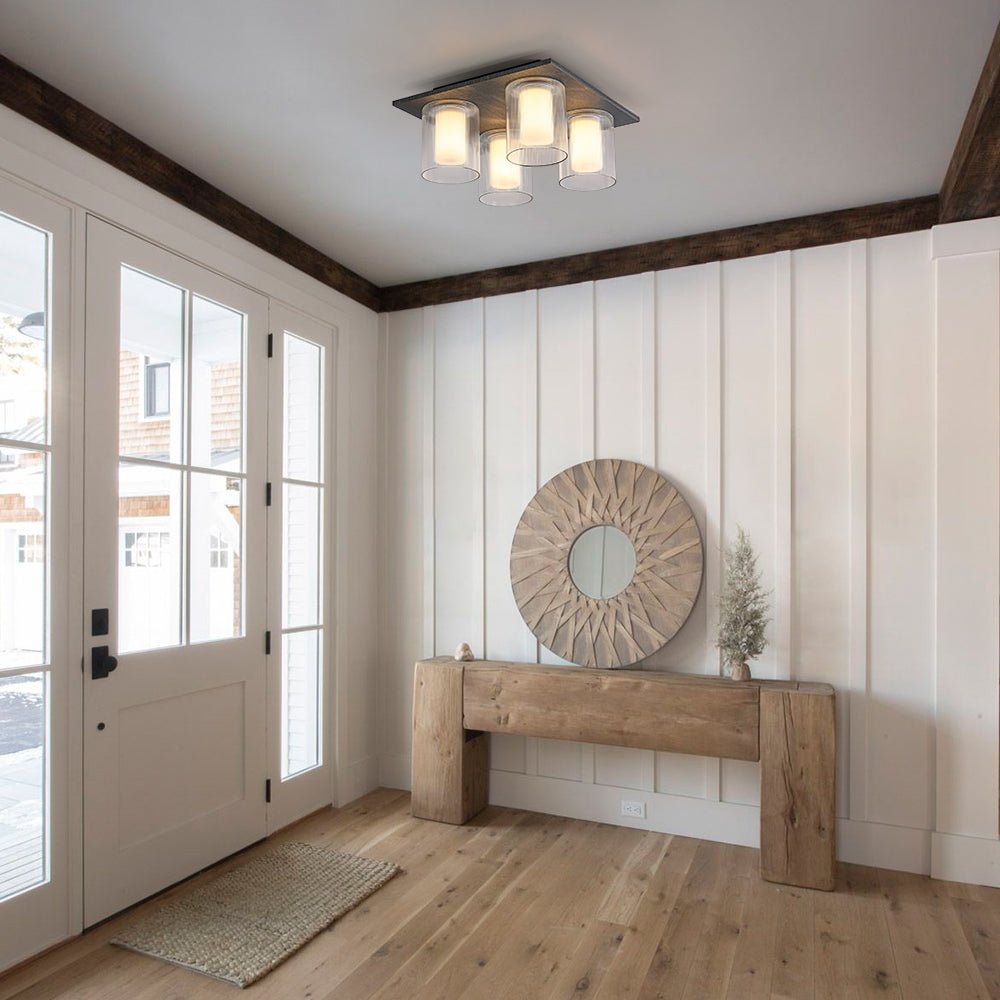 Enhance the ambiance of your kitchen island, dining area, entry, bedroom, bathroom, foyer, or workspace with this stylish 4-light LED square ceiling light. Featuring a perfect blend of cutting-edge design and functional brilliance, this semi flush mount is anchored by a thin square MDF board supporting four cylindrical shades below evenly. These sleek shades stand out for a stylish dual-layer design: clear ribbed glass on the outside and frosted white glass on the inside. The industrial edge is further accentuated by the brushed gray finish, while the frosted white glass shades house energy-efficient 3000K LED lights for clean, even illumination and a warm and inviting atmosphere.