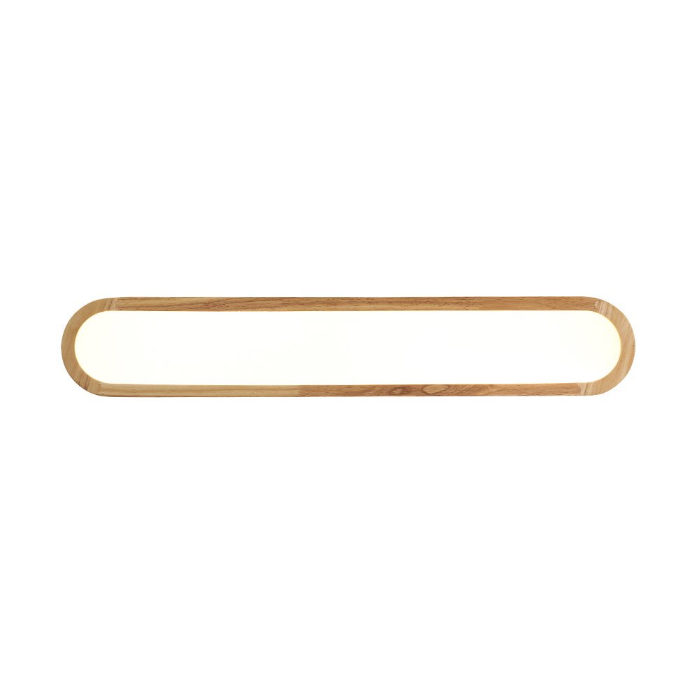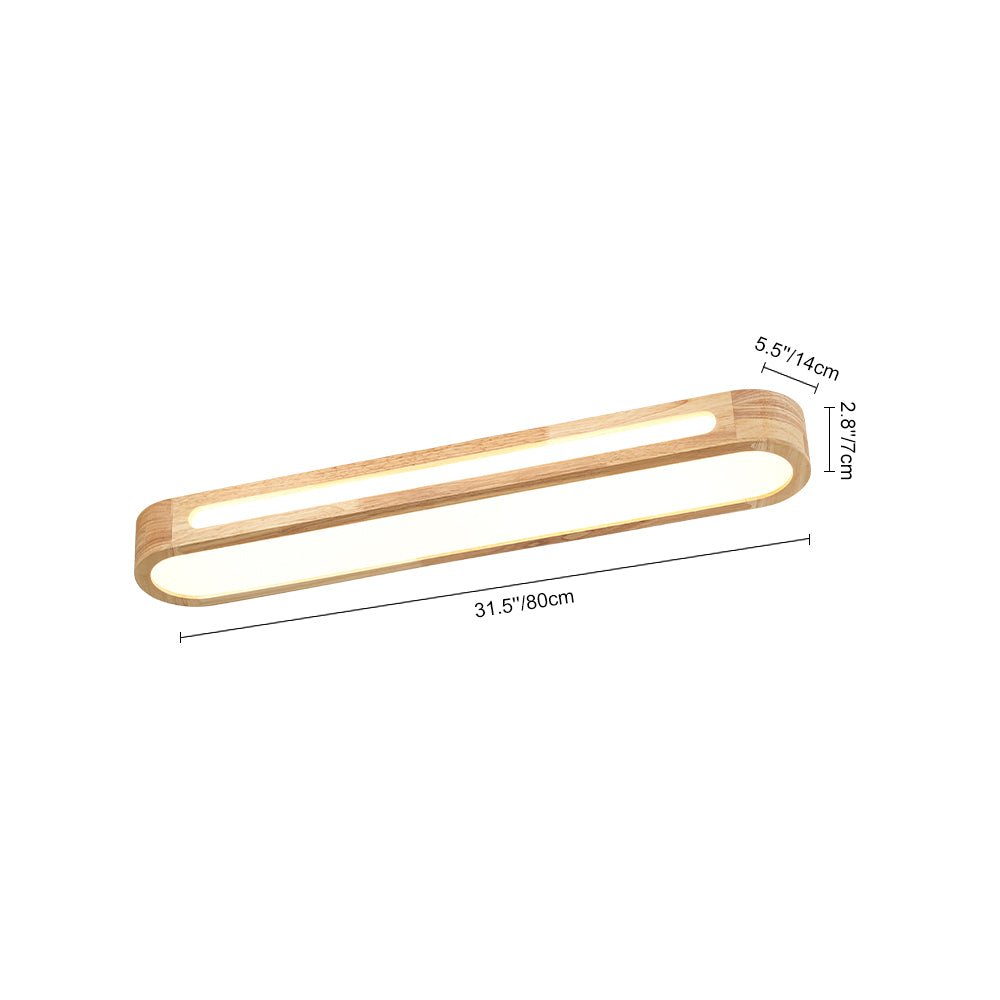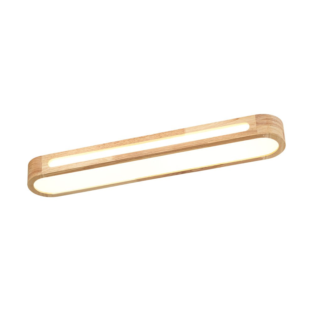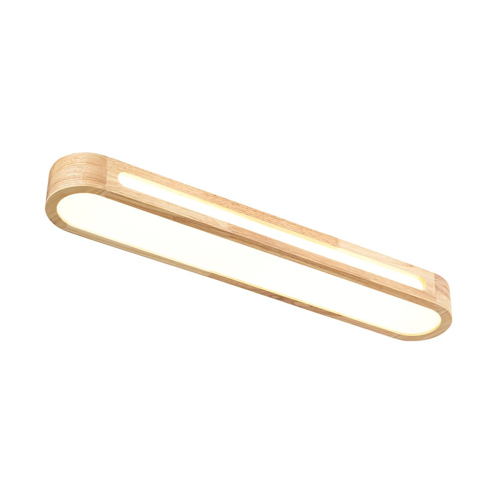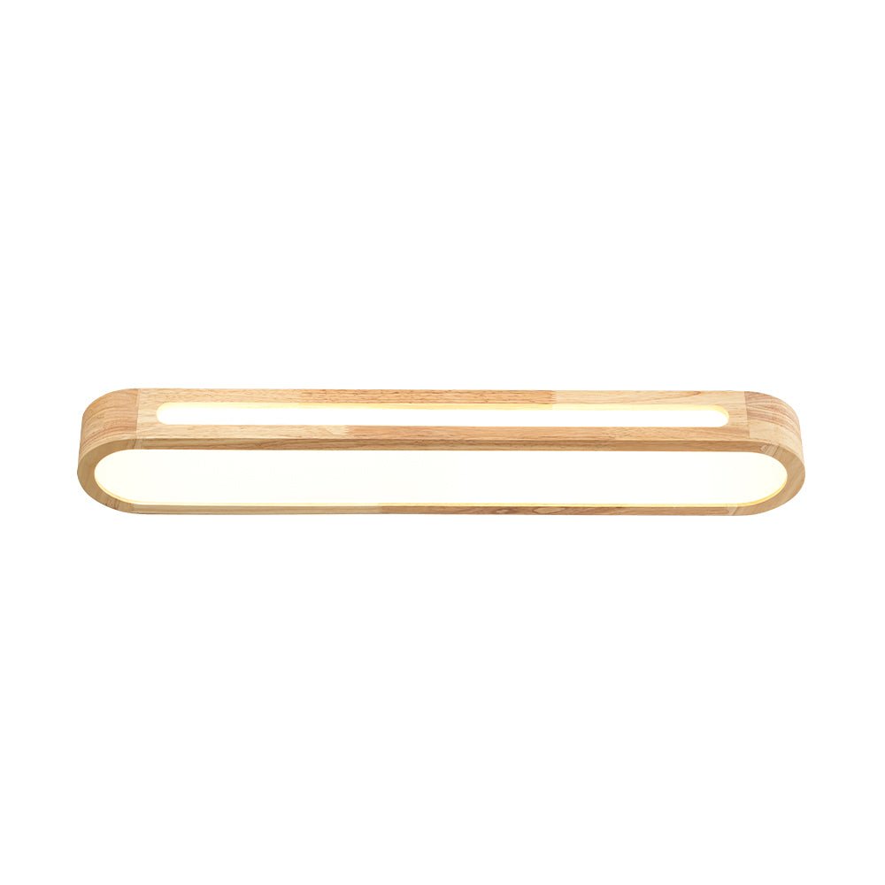 This LED flush mount ceiling light showcases a sleek, minimalist design with a streamlined oval frame and a stylish side-glow feature, finished in natural oak wood grain for a modern farmhouse elegance.