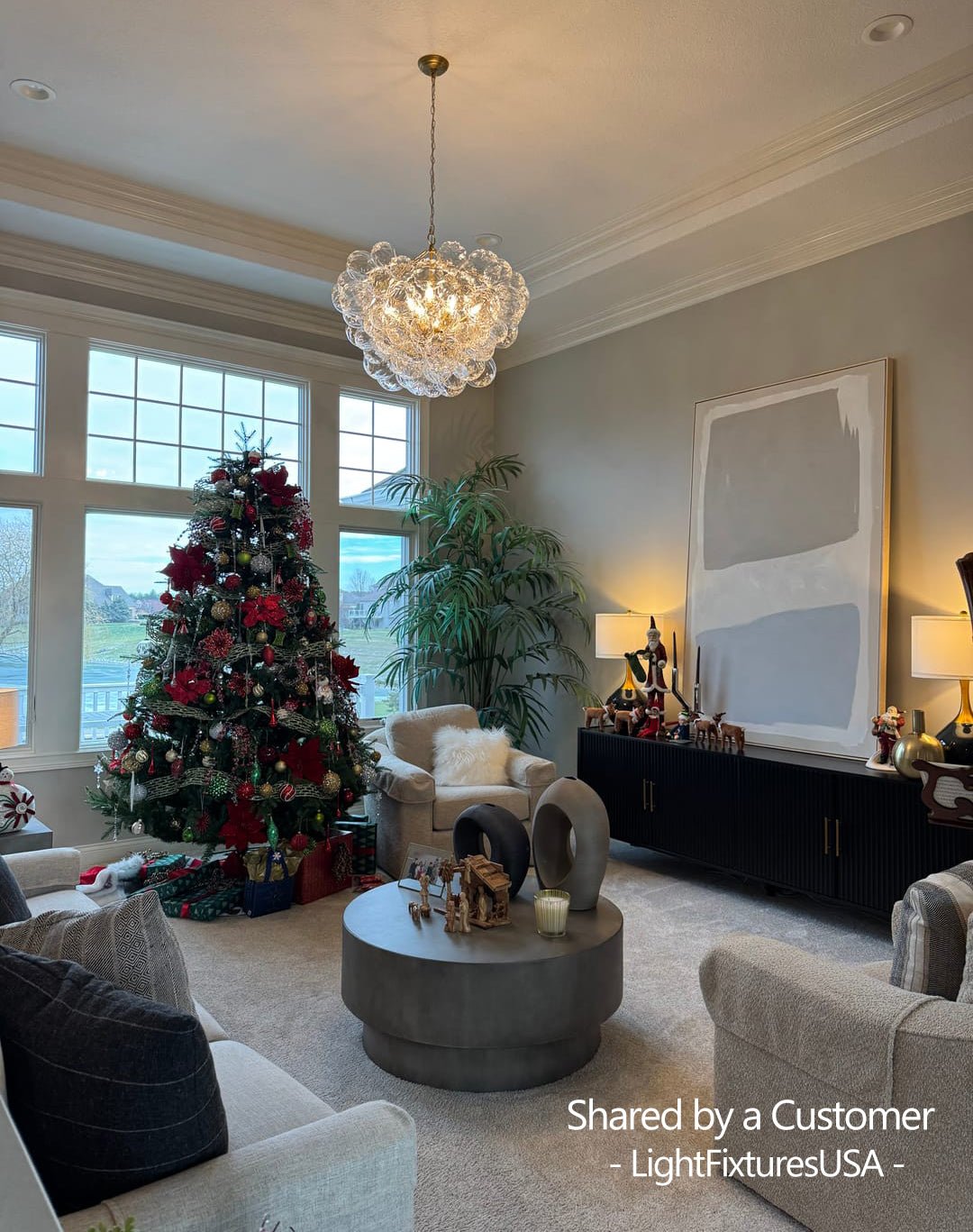 Experience the epitome of luxury charm and artful ambiance with our new collection of bubble chandeliers. The quintessence is our ground-breaking sculpture texture glass globe, inspired by ice engraving style and crafted of clear hand-blown texture glass, boasting an ornate yet ethereal touch. When turning on this cluster glass globe chandelier, warm lighting sweeps across the rich brass frame, flowing out through every curve of the glass orbs with exquisite grace. This sculpture texture glass bubble chandelier radiates an unparalleled level of romantic elegance and refinement at every turn, perfect to enhance a modern living room, entryway, dining room, bathroom, or bedroom.