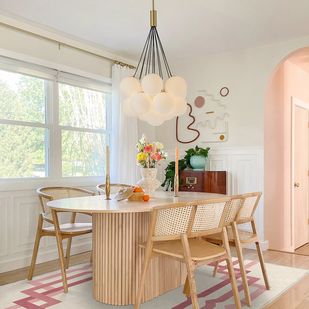 Adorn your space with the ethereal charm of this cluster ball chandelier. Featuring thirteen globe shades made from frosted opal glass and a sleek brass finish, this bubble chandelier pendant light emanates a soft, ambient glow. Suspended by black cables, the milky white glass orbs draping from the center and gathering, seem to float like an airy and delicate cloud, creating a serene and graceful atmosphere. Perfect for enhancing the aesthetics of your living room, dining room, lobby, foyer, child room, or bedroom, this elegant cluster bubble chandelier pendant light is designed to evoke a sense of elegance and tranquility.