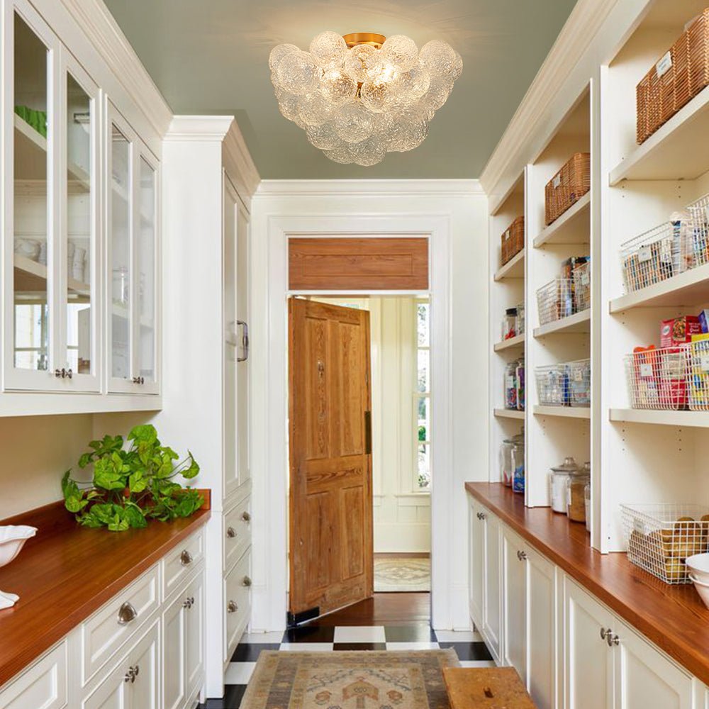 Arranged in captivating clusters, a collection of charming textured glass globes come together to form this bubble ceiling light. Inspired by the lively ripples of water, the clear glass orbs capture the dynamic motion of waves, freezing them into delicate, icy spheres reminiscent of the enchanting beauty of Frozen. When illuminated, warm light spills gracefully through the intricate ripples of each orb, casting a soft glow across the rich brass bowl-shaped frame. Meticulously crafted, this funky semi flush chandelier embodies opulent charm and adds a touch of magic to any space. Perfect for your living room, dining room, entryway, bedroom, foyer, or hallway, this cluster glass globe chandelier will make your home shine with elegance.