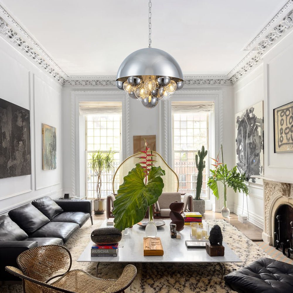 This eclectic cluster globe chandelier design features a striking metal dome that gracefully embraces an array of glass globes in varying sizes, resembling a vault cover housing precious gemstones. The design strikes a fresh, stylish, and harmoniously balanced blend, combining industrial edge with exquisite bubble-like elegance. Among the clear/smoked glass spheres are carefully arranged ribbed glass balls with swirled textures, enriching the depth and adding visual intrigue. The brass option brings a touch of modern mid-century sophistication, perfect for introducing a pop of chic brilliance. Alternatively, the chrome version, paired with smoked glass balls for a more dramatic effect, delivers a funky and avant-garde shine that adds boldly fashionable flair to any space. Whether in a dining room, entryway, kitchen, bedroom, bathroom, or living area, this statement pendant light brings an elevated, modern aesthetic to any room.