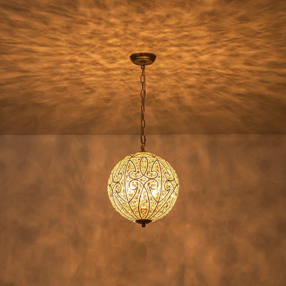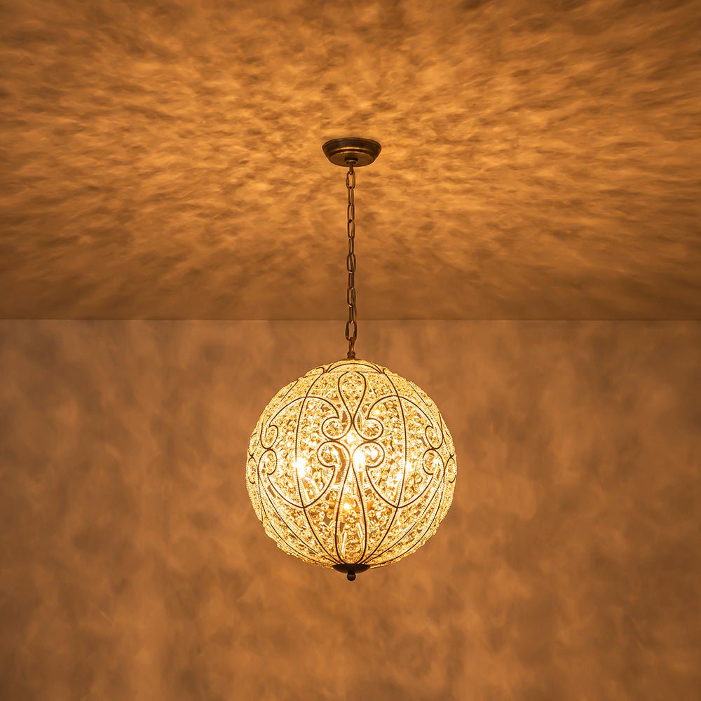 Exuding luxurious elegance and vintage sophistication, this orb chandelier captures the timeless allure of classic French design. Perfect for dining rooms, entryways, kitchen islands, foyers, bedrooms, bathrooms, and living spaces, this round pendant light features a globe-shaped cage adorned with intricate scrollwork and sparkling crystals. The distressed silver finish adds a delicate shabby chic touch, enhancing its vintage appeal. When paired with E12 candelabra bulbs (not included), the crystals beautifully reflect the light, creating a breathtaking display.