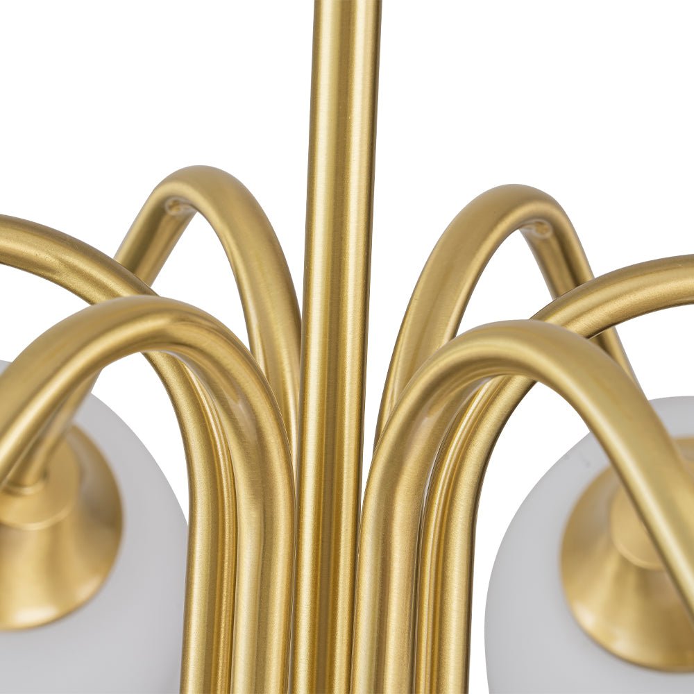 Six/Ten Lights • Sputnik Design • Milky White Glass • Bubble Style • Curved Arms • Brushed Brass • E26 Medium-Base Bulbs (Not Included) • Hardwired • UL Listed/ETL