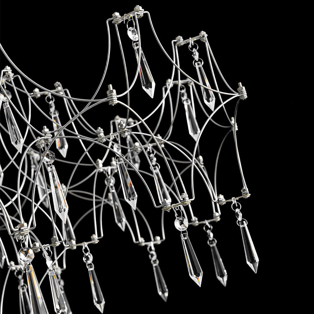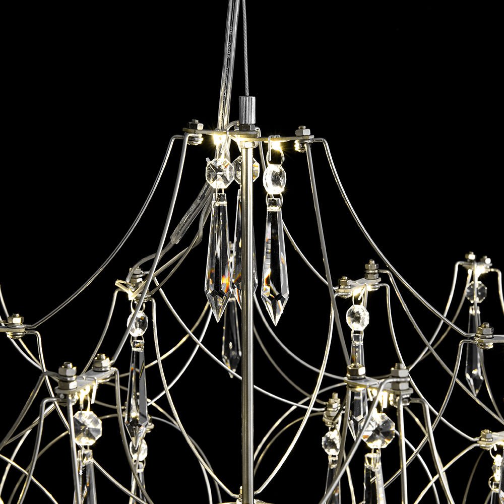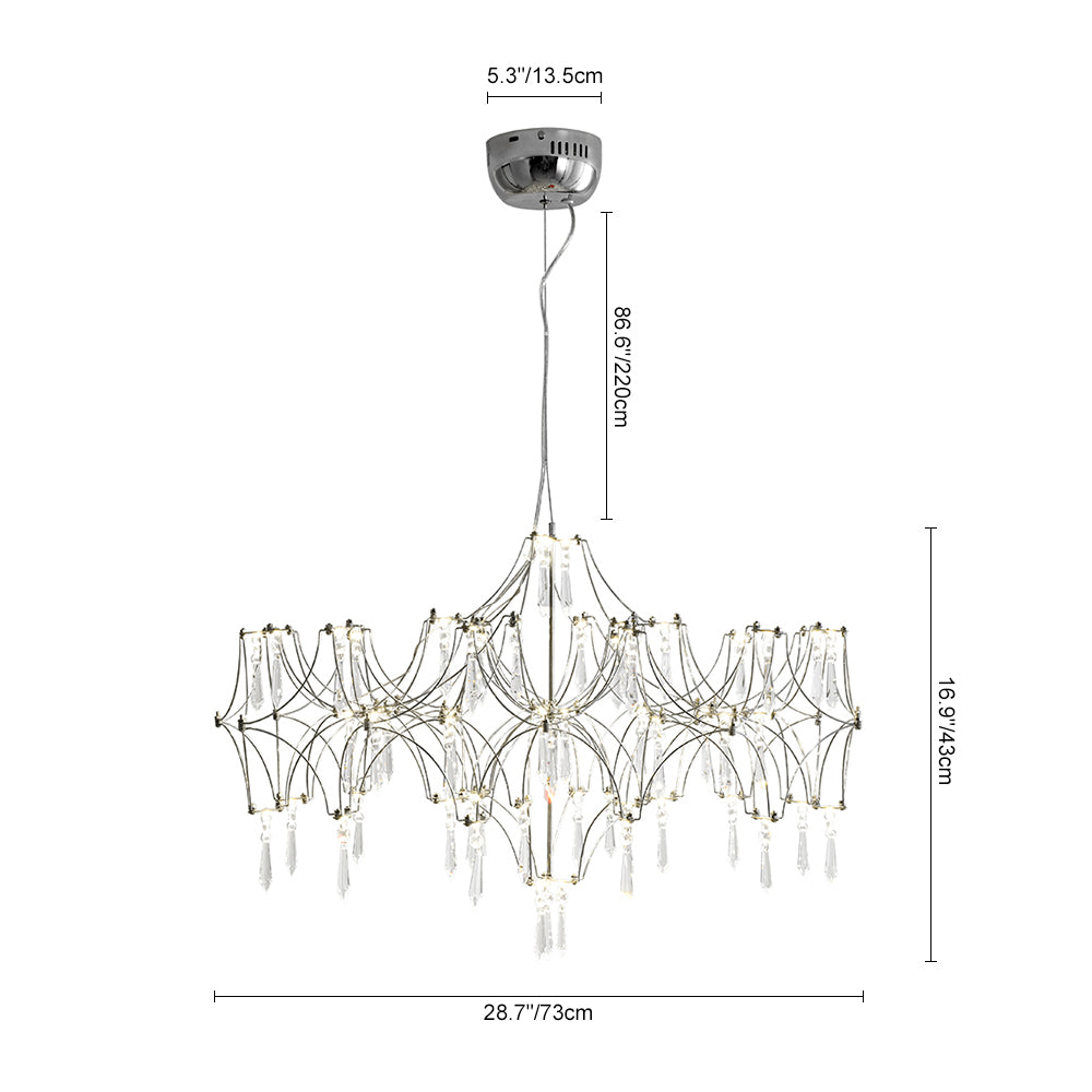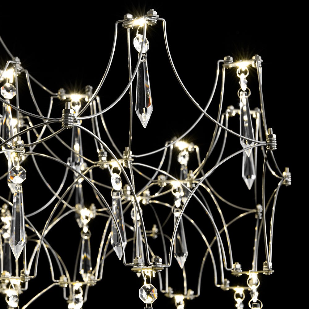 This LED chandelier features a celestial-inspired, starry design that evokes the mesmerizing beauty of a galaxy. Its intricate structure is formed by a network of delicate stainless steel wires arranged in cascading tiers, creating a sense of depth and fluidity. The polished chrome airy wire frame mimics the ethereal movement of celestial formations, while the suspended faceted crystal drops resemble shimmering stars scattered across the night sky.