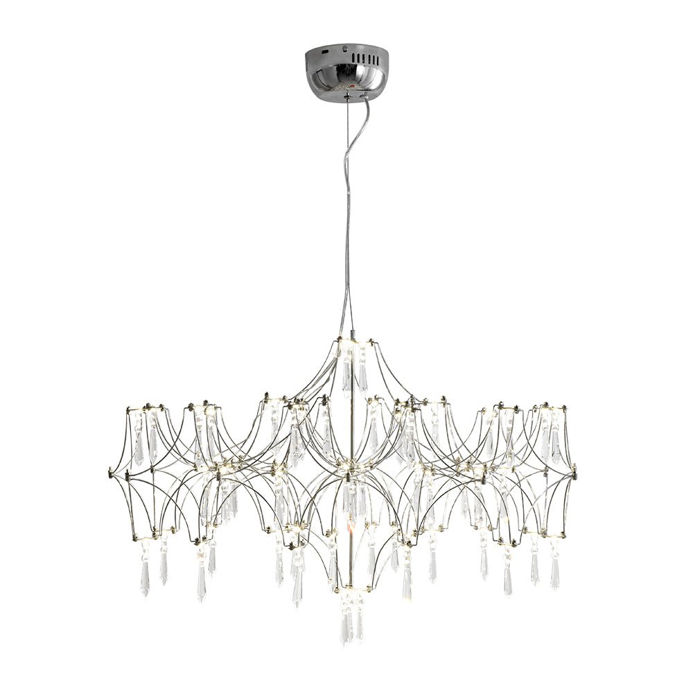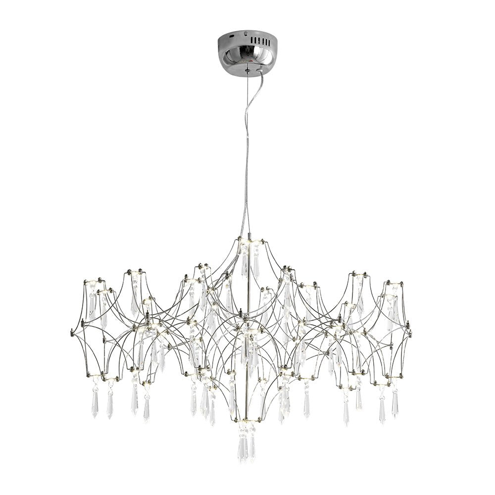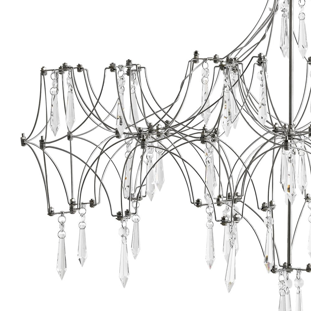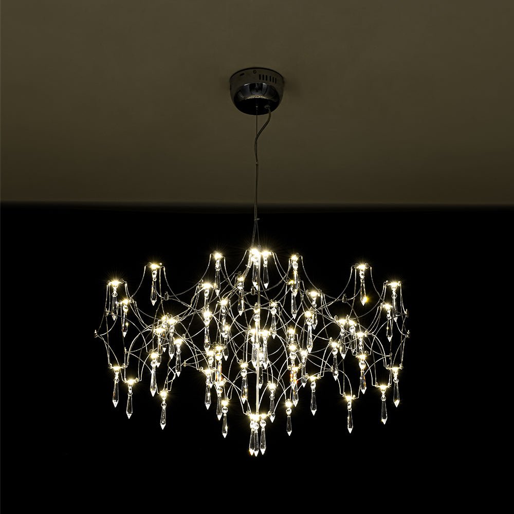 This LED chandelier features a celestial-inspired, starry design that evokes the mesmerizing beauty of a galaxy. Its intricate structure is formed by a network of delicate stainless steel wires arranged in cascading tiers, creating a sense of depth and fluidity. The polished chrome airy wire frame mimics the ethereal movement of celestial formations, while the suspended faceted crystal drops resemble shimmering stars scattered across the night sky.