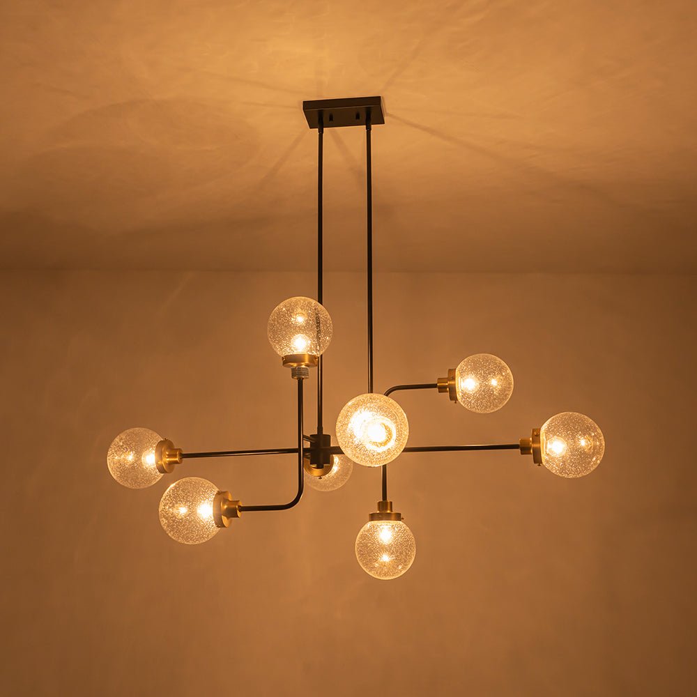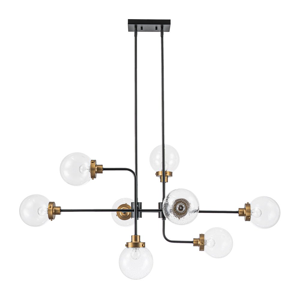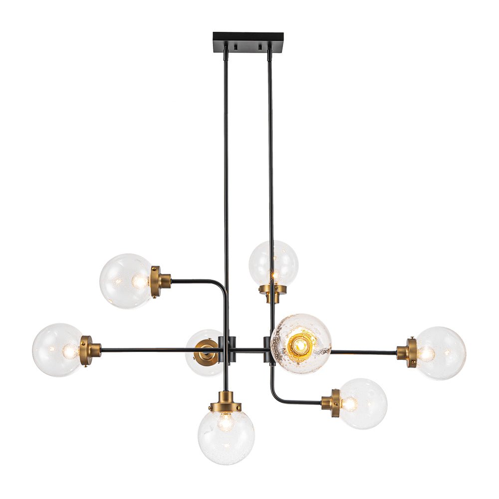 This striking island chandelier introduces a contemporary glam aesthetic with an innovative and captivating design. Inspired by sputnik design and bubble motifs, this 8-light glass globe chandelier showcases a layered linear structure with horizontal and curved crossbars, creating dimensional and visual intrigue. Eight clear seedy glass spheres bubble out from the light holders, reminiscent of frozen soda pop bubbles, infusing the piece with a crisp, refreshing charm. The matte black and brushed brass color scheme adds a chic, mid-century modern touch that complements various décor styles. When lit, this seeded glass bubble sputnik linear chandelier provides bright, even illumination with inviting ambiance, making it a perfect centerpiece for dining tables, kitchen islands, living rooms, foyers, entryways, bathrooms, studio, or game rooms.