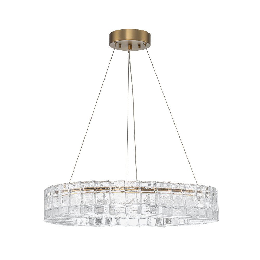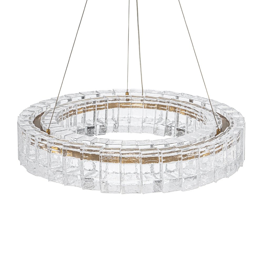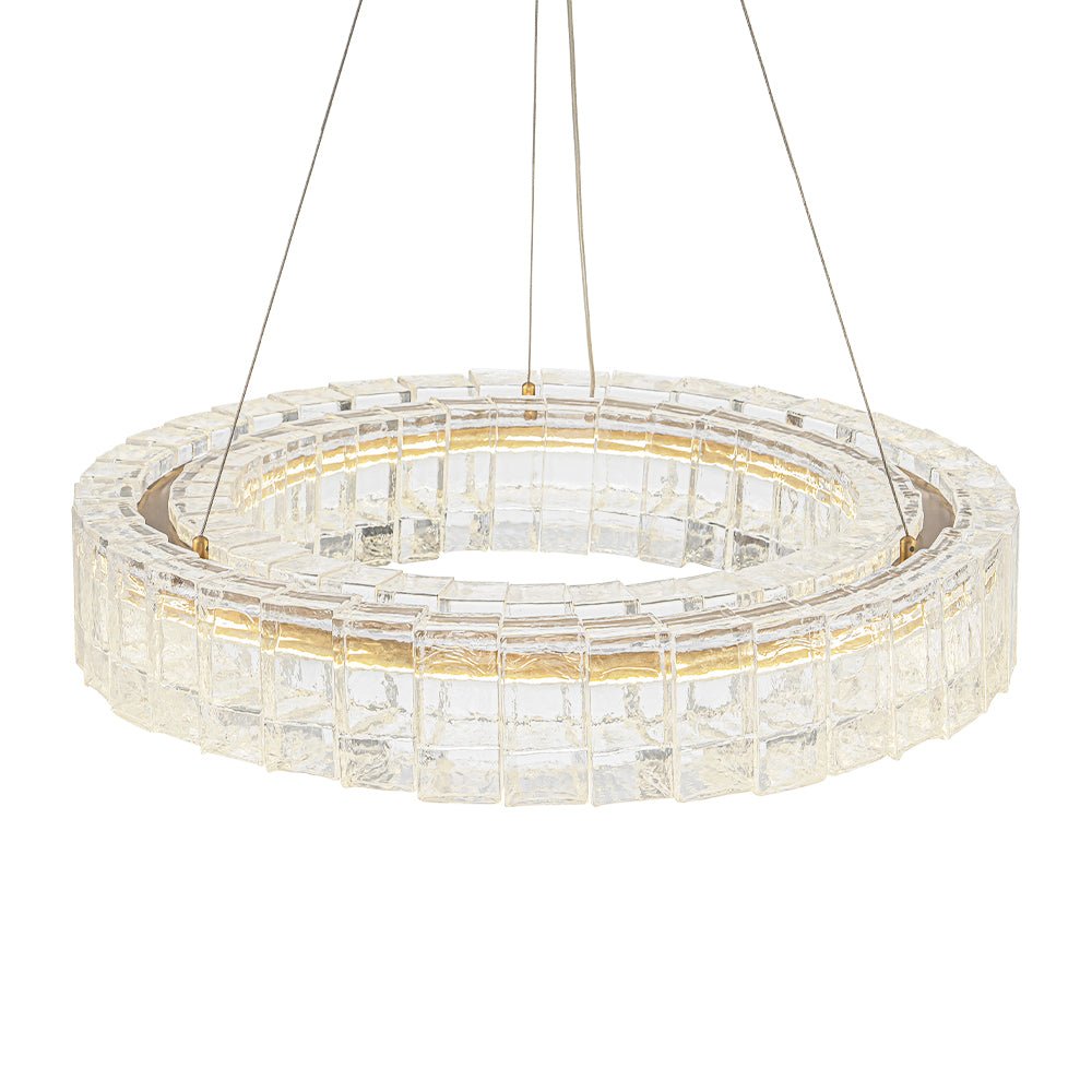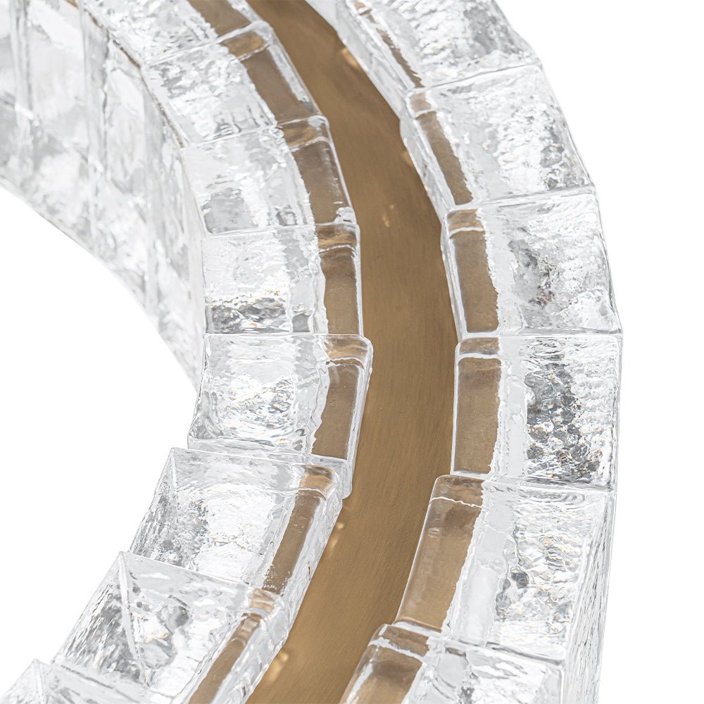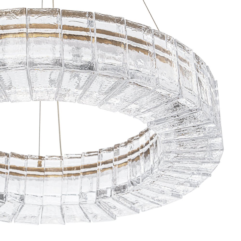 Step into the artistry of ice with this exquisite round LED chandelier. Expertly crafted from transparent water-textured glass, this breathtaking statement piece features an arrangement of icy cube-like blocks, creating a stunning crystal halo that evokes a sleek and minimalist aesthetic. Outfitted with efficient 4000K LED lighting, this Frozen style ring pendant light radiates warmth and brilliance, transforming any space into a captivating masterpiece. The brushed brass accents add a touch of contemporary sophistication, elevating the design to new levels of opulence. Perfect for entryways, living rooms, dining rooms, kitchen islands, bathrooms, bedrooms, and foyers, this ice style LED halo chandelier seamlessly combines modern glamour and practicality, making it a perfect choice for upscale décor.