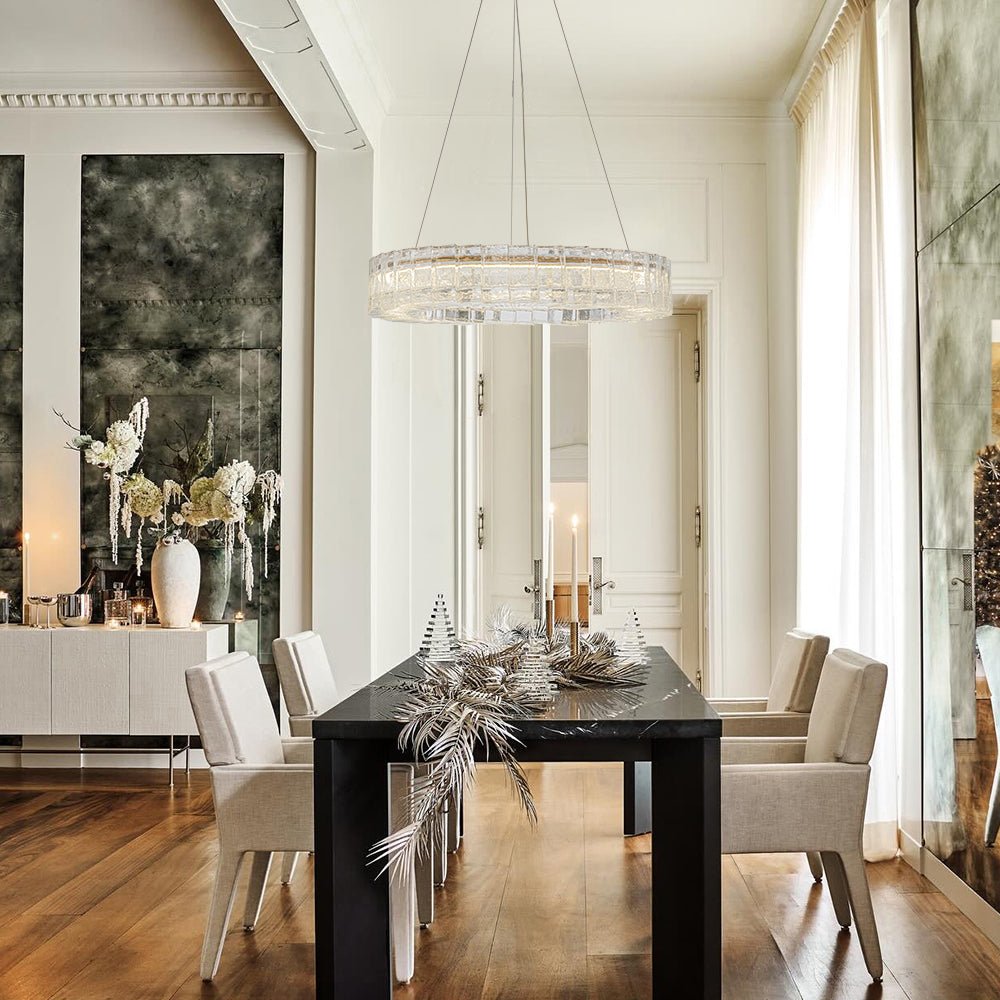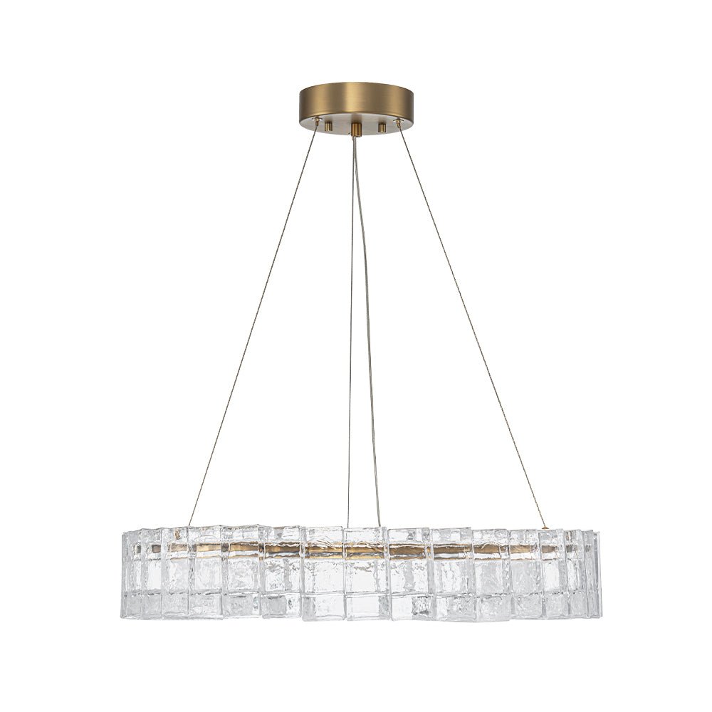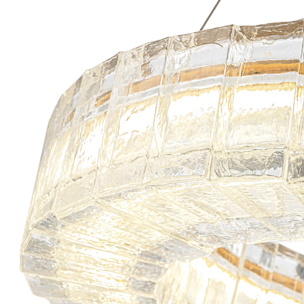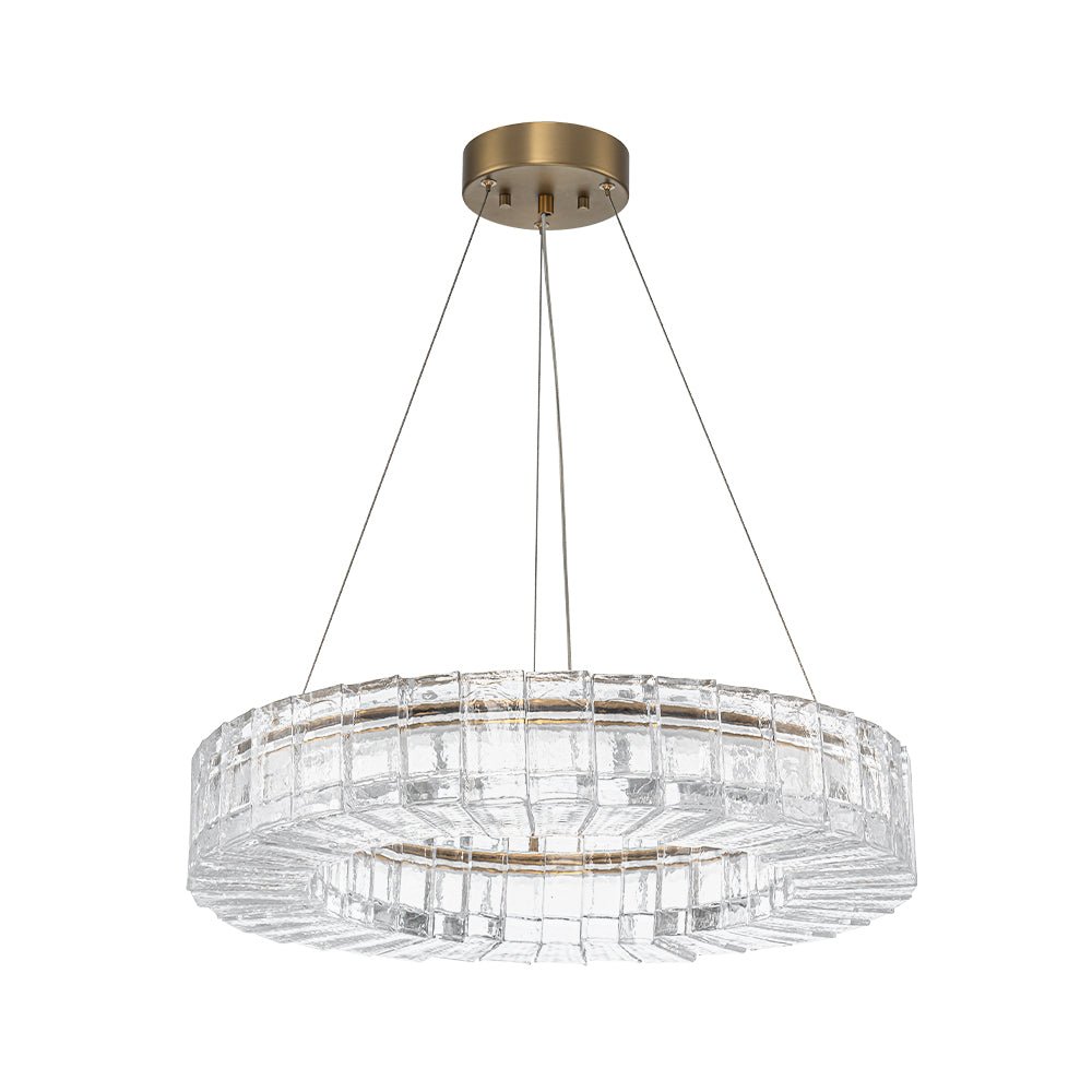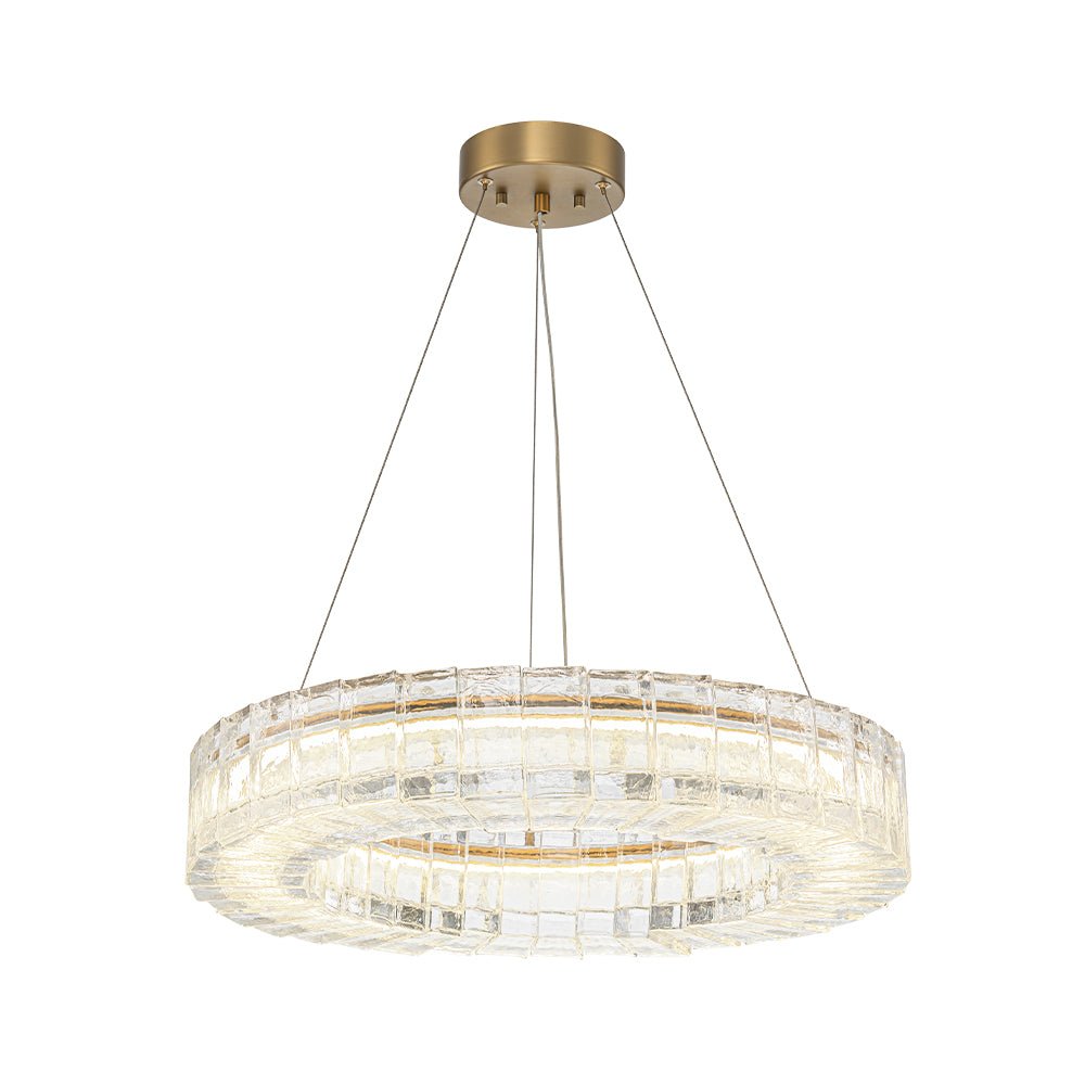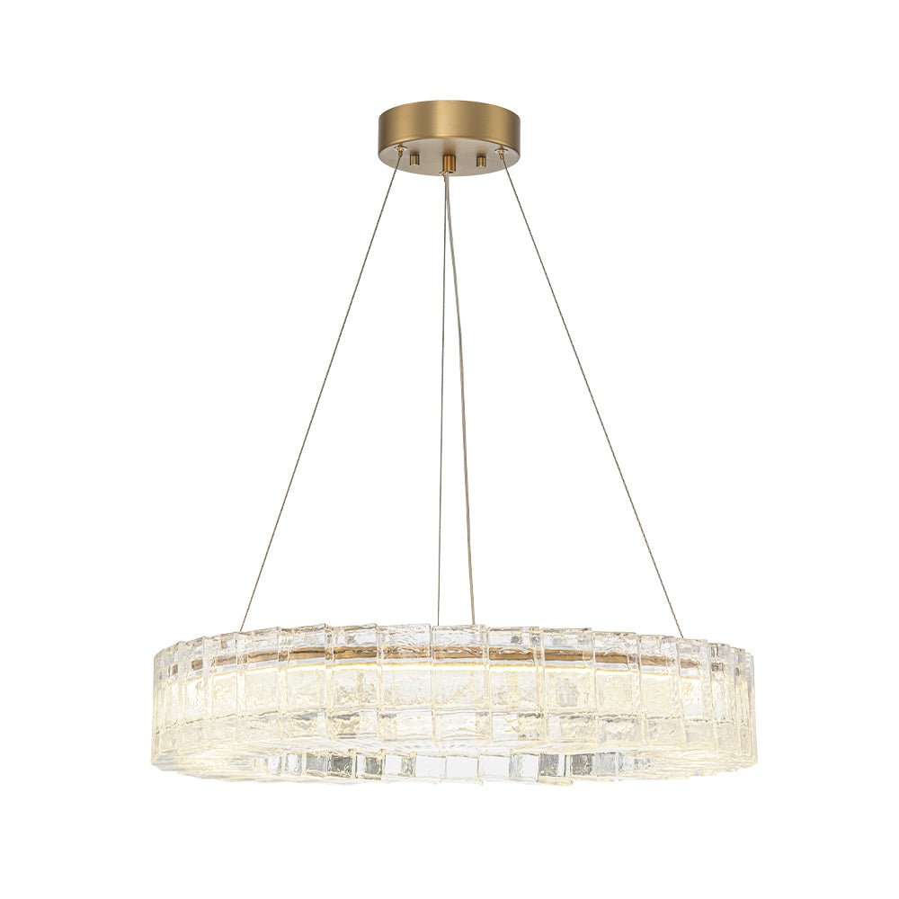 Step into the artistry of ice with this exquisite round LED chandelier. Expertly crafted from transparent water-textured glass, this breathtaking statement piece features an arrangement of icy cube-like blocks, creating a stunning crystal halo that evokes a sleek and minimalist aesthetic. Outfitted with efficient 4000K LED lighting, this Frozen style ring pendant light radiates warmth and brilliance, transforming any space into a captivating masterpiece. The brushed brass accents add a touch of contemporary sophistication, elevating the design to new levels of opulence. Perfect for entryways, living rooms, dining rooms, kitchen islands, bathrooms, bedrooms, and foyers, this ice style LED halo chandelier seamlessly combines modern glamour and practicality, making it a perfect choice for upscale décor.