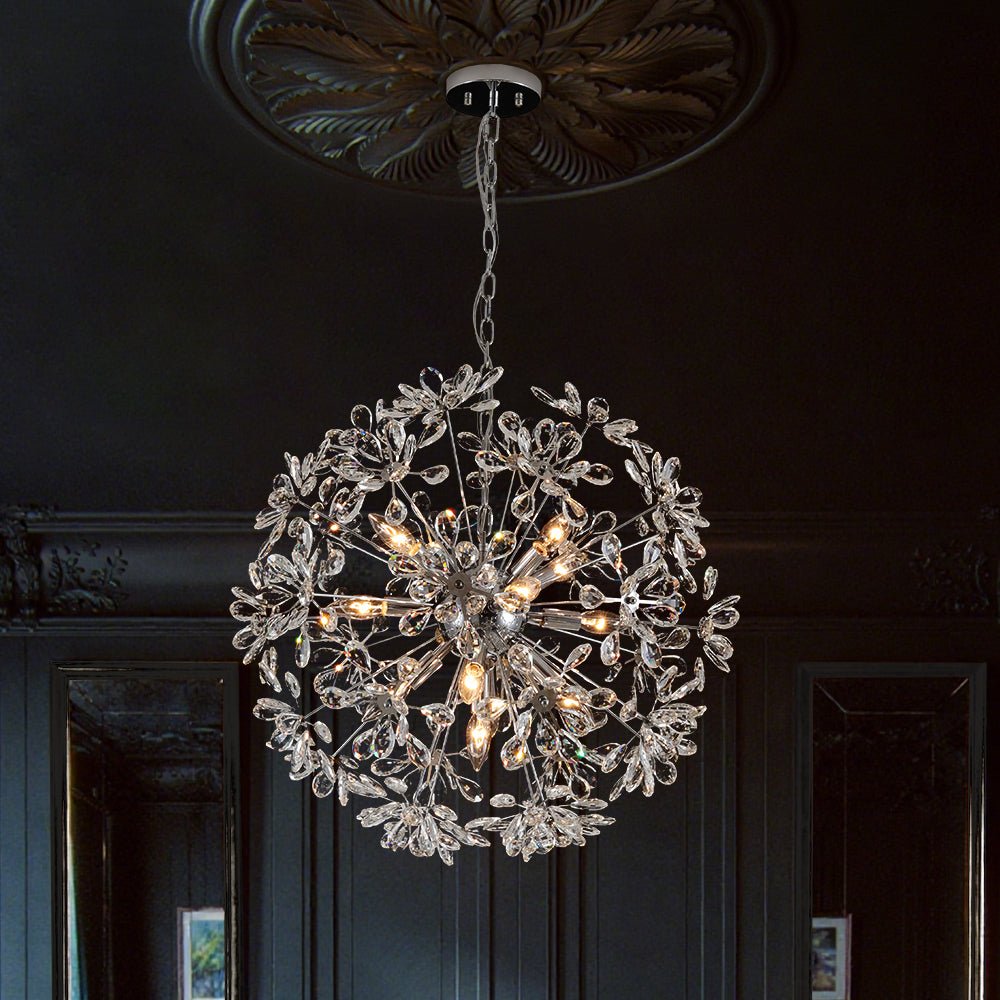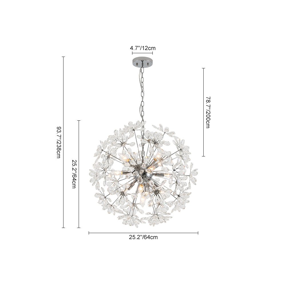 Bring a touch of dazzling brilliance into your home with this round crystal sputnik pendant light, a radiant statement where modern artistry meets timeless elegance. Crafted with a stunning 13-light design, the chandelier blossoms like a dandelion caught mid-burst, each slender metal arm adorned with faceted crystal flowers that shimmer with breathtaking detail.