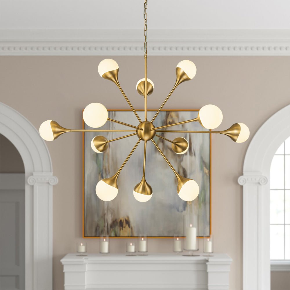 Striking and harmonious, our sphere chandelier offers a blend of modern mid-century panache and artistic vigor. Drawing inspiration from its eye-catching sunburst form and finished in brushed brass, 12 slim arms radiate from a core sphere, with a subtle bend edge at the end that creates a visual of sophistication and individuality. The glossy opal glass globes enclosing each lamp enhance the voguish allure of this Sputnik luminaire while also softening the bright glare into a gentler hazy-warm ambiance. Bestow an exquisite element to your living room, dining room, passage, or bedroom with this 12-light opal glass globe Sputnik chandelier.