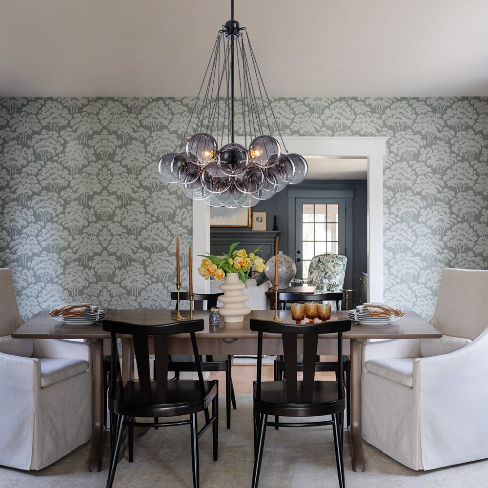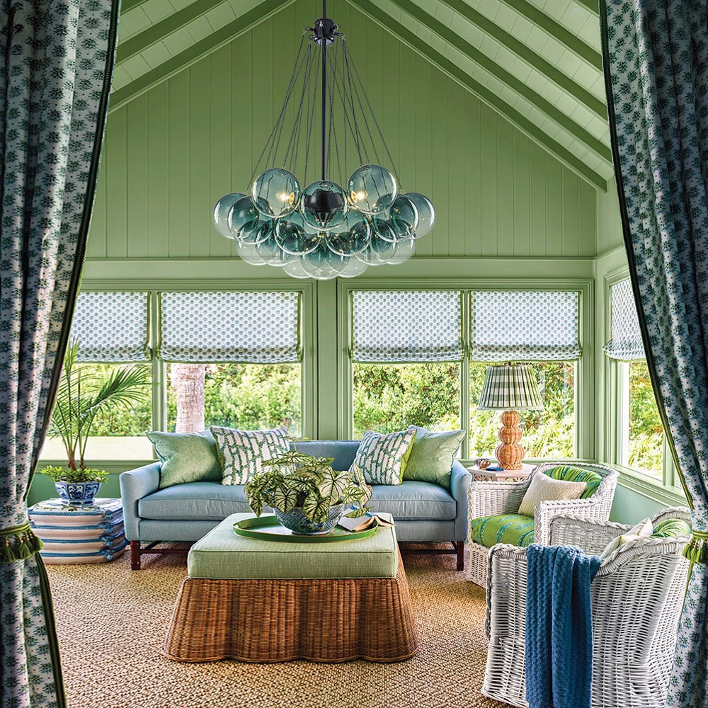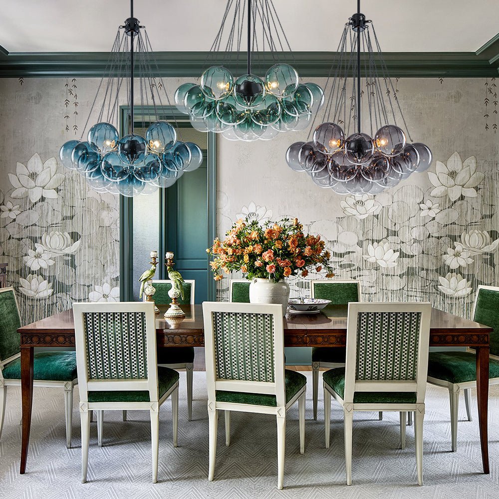 The cascading arrangement creates a sense of depth and movement, giving the bubble chandelier a weightless, airy presence despite its sculptural form. Each globe transitions from a gentle tint—available in blue, green, or gray—into crystal-clear glass, evoking a refreshing, poetic lightness.