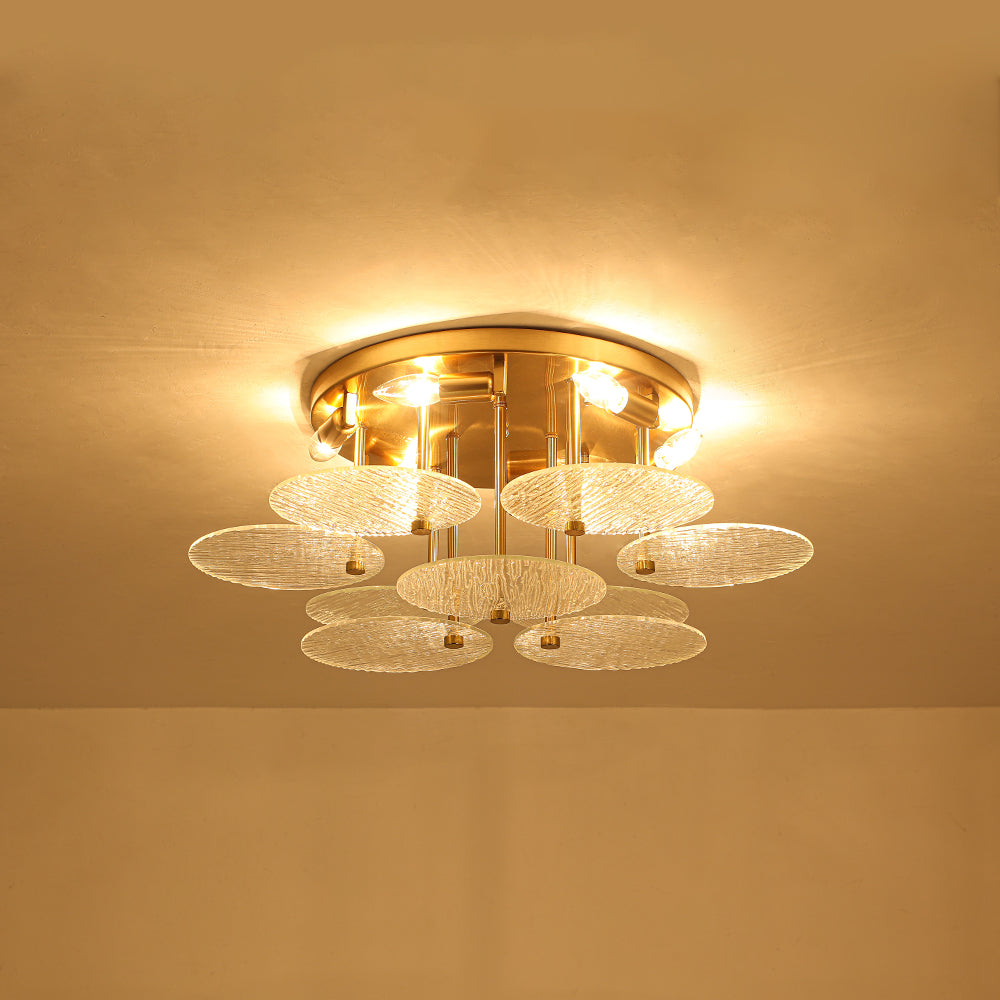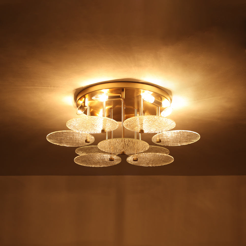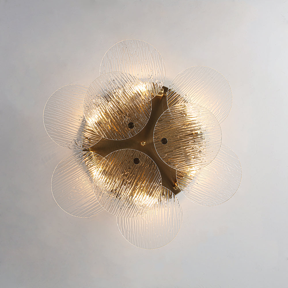 Designed to bring sculptural elegance and soft illumination to any room, this brass 6-light round semi flush mount features clear textured glass discs arranged in a two-tier composition, evenly scattered to resemble a blooming flower—creating a sense of movement and organic balance.