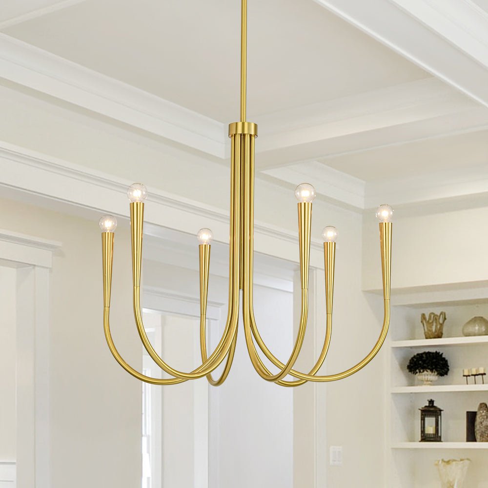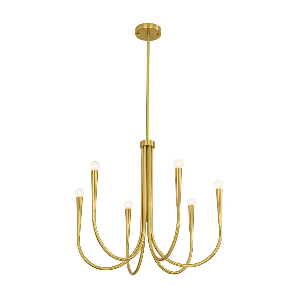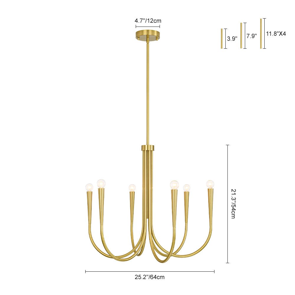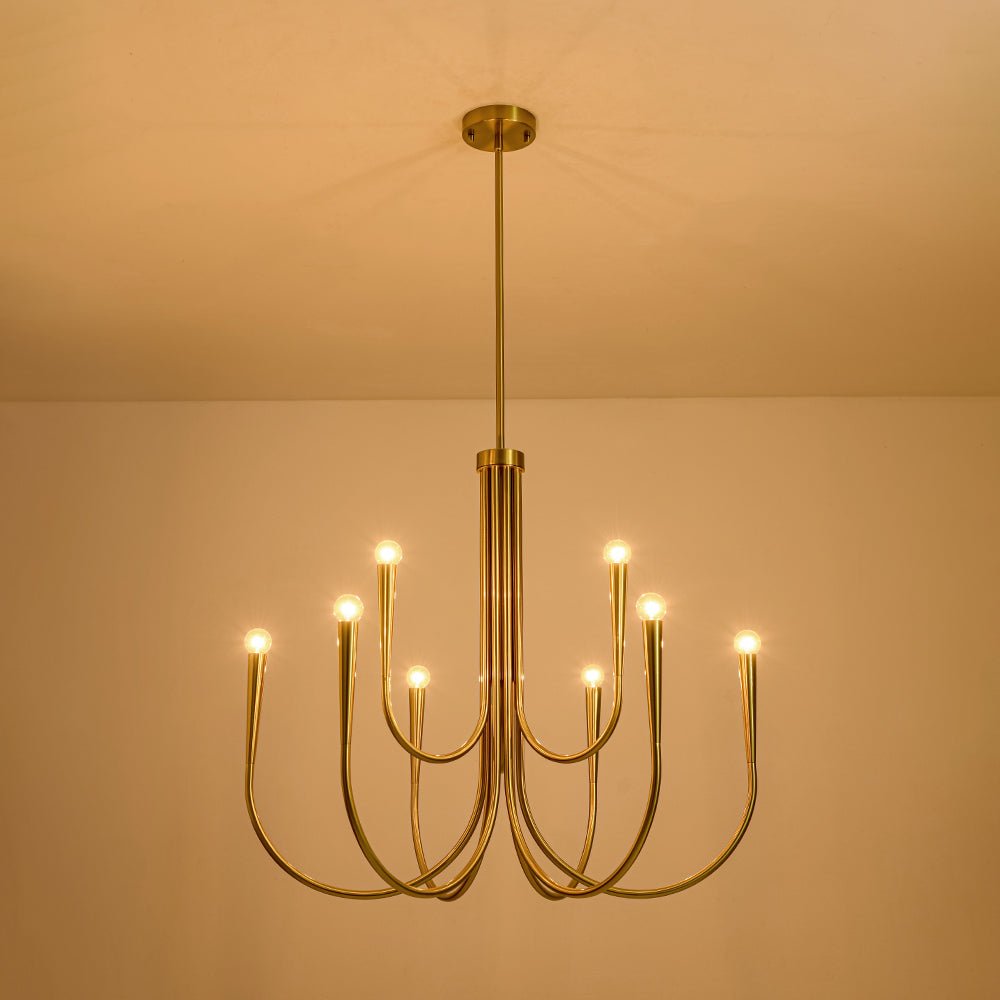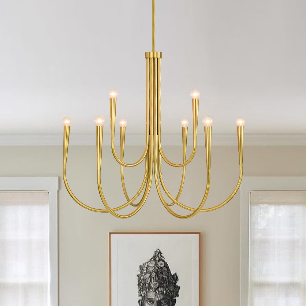 This refined round chandelier blends French farmhouse charm with contemporary sophistication. Its timeless candle-style design features a tiered silhouette of slender, gracefully arched arms finished in brushed brass, lending a touch of mid-century modern allure. Each arm is topped with an exposed E12 bulb (bulbs not included), offering a bright yet inviting glow with subtle vintage character. Versatile and stylish, this candle chandelier elevates entryways, dining rooms, kitchens, bathrooms, living areas, and high-ceilinged spaces with effortless elegance.