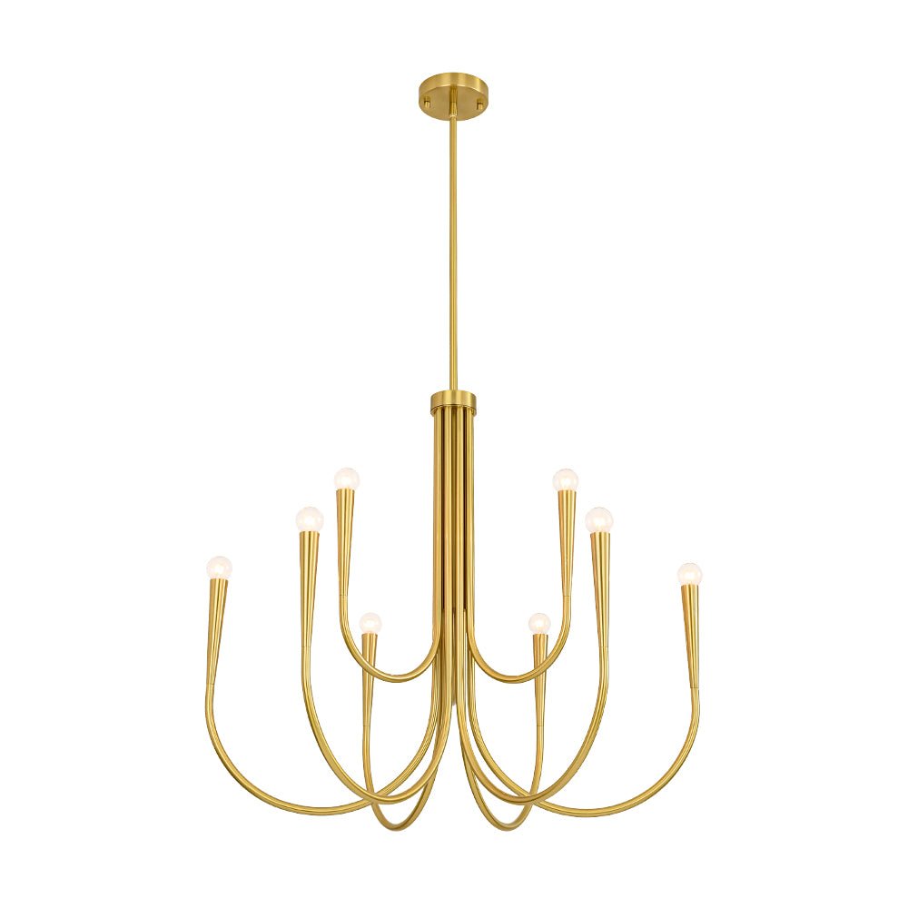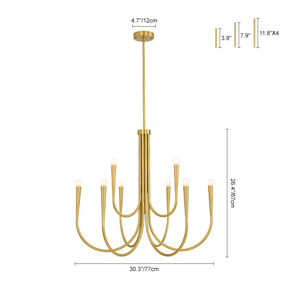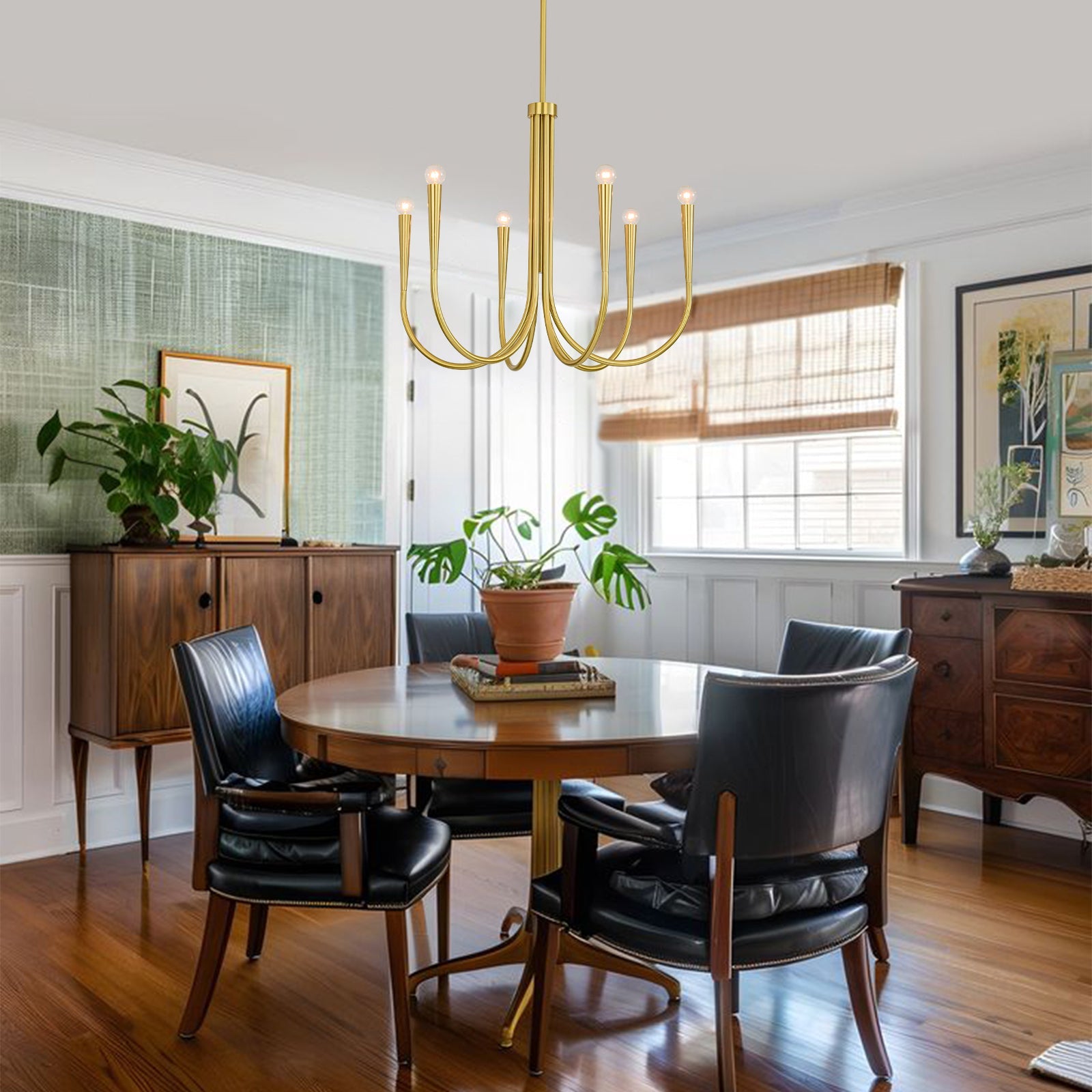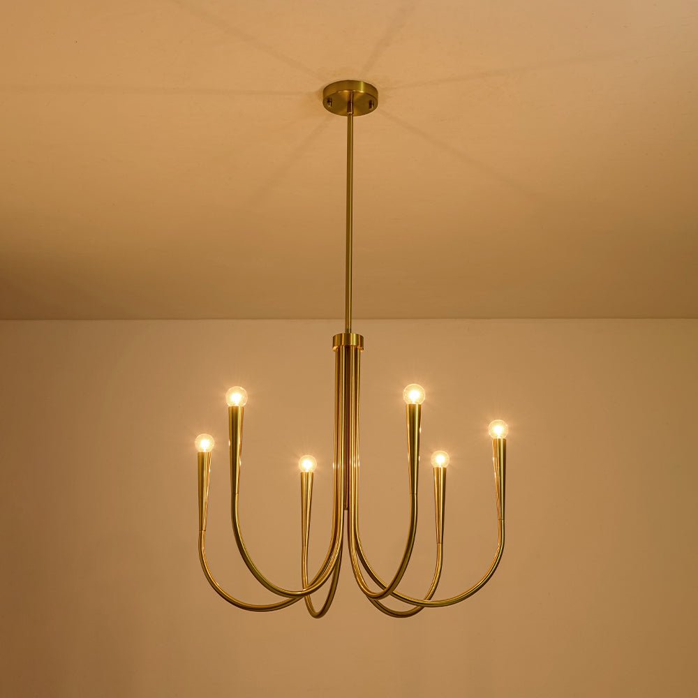 This refined round chandelier blends French farmhouse charm with contemporary sophistication. Its timeless candle-style design features a tiered silhouette of slender, gracefully arched arms finished in brushed brass, lending a touch of mid-century modern allure. Each arm is topped with an exposed E12 bulb (bulbs not included), offering a bright yet inviting glow with subtle vintage character. Versatile and stylish, this candle chandelier elevates entryways, dining rooms, kitchens, bathrooms, living areas, and high-ceilinged spaces with effortless elegance.