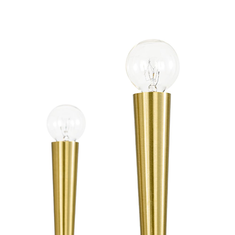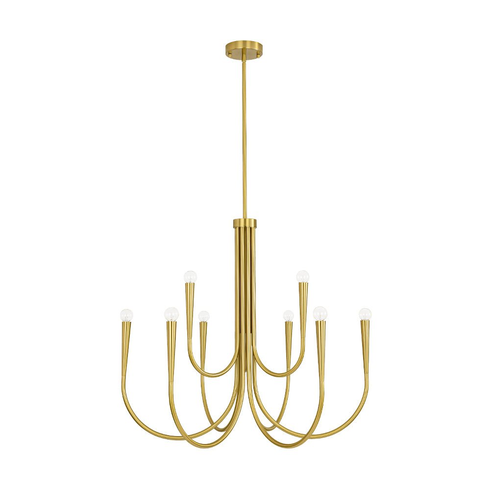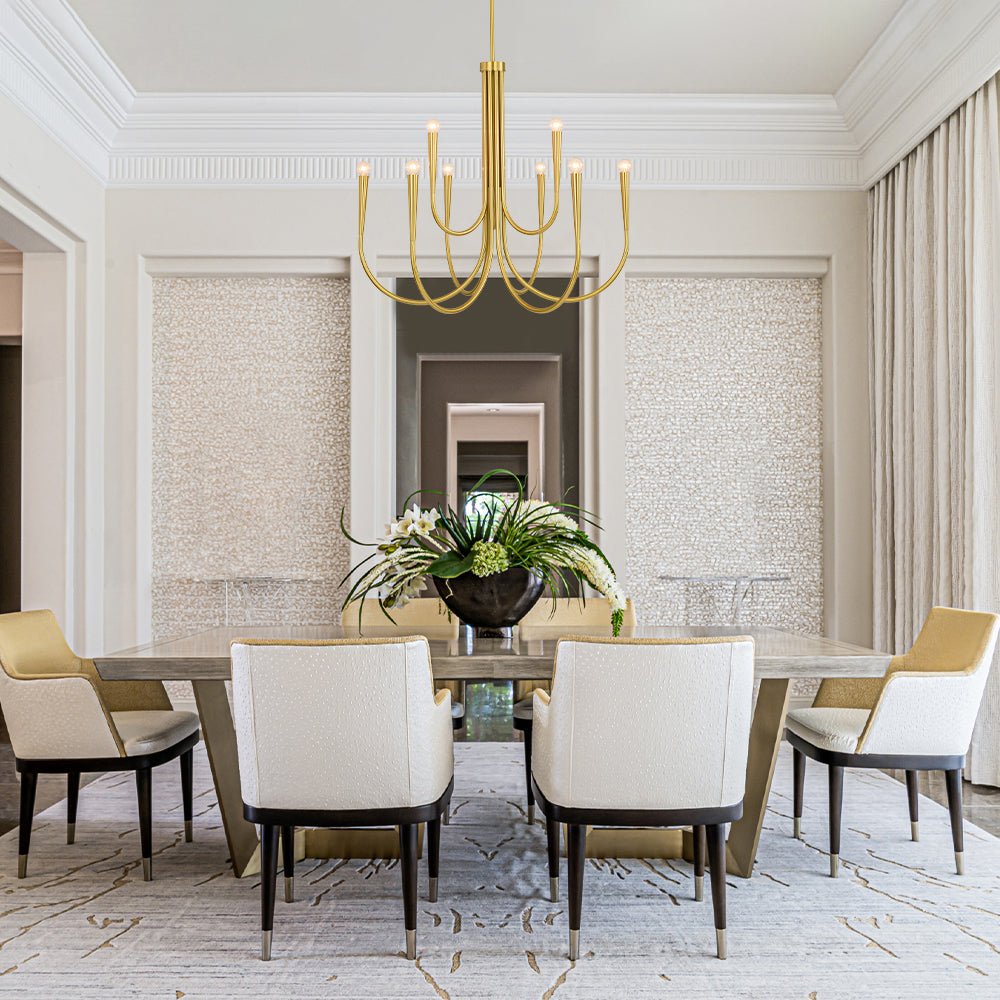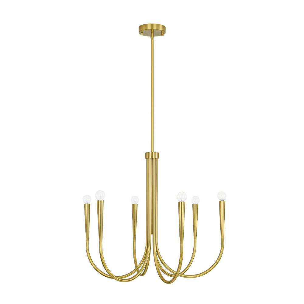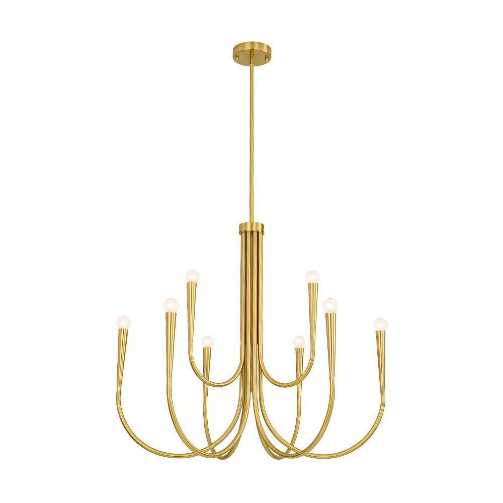This refined round chandelier blends French farmhouse charm with contemporary sophistication. Its timeless candle-style design features a tiered silhouette of slender, gracefully arched arms finished in brushed brass, lending a touch of mid-century modern allure. Each arm is topped with an exposed E12 bulb (bulbs not included), offering a bright yet inviting glow with subtle vintage character. Versatile and stylish, this candle chandelier elevates entryways, dining rooms, kitchens, bathrooms, living areas, and high-ceilinged spaces with effortless elegance.