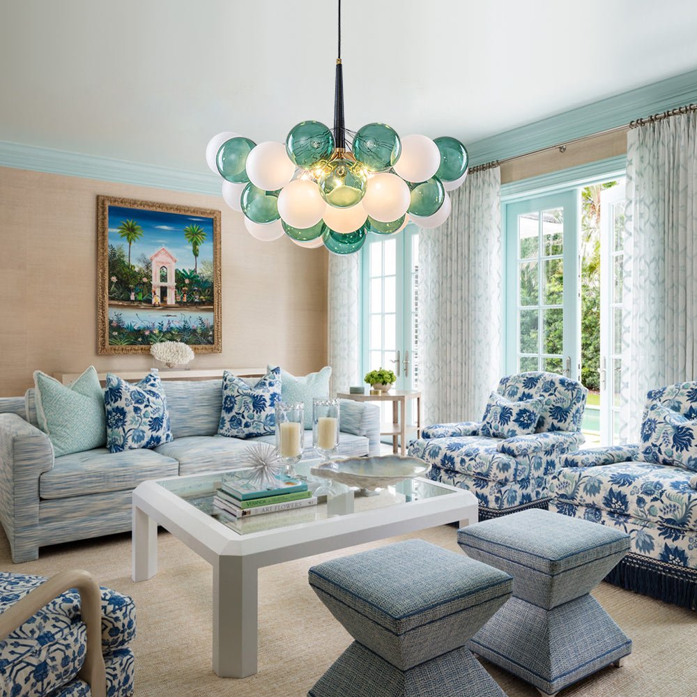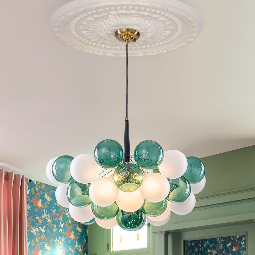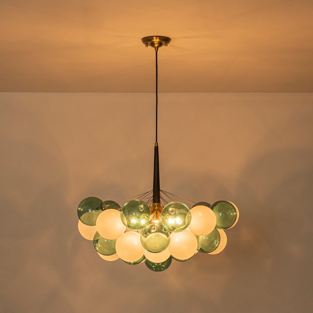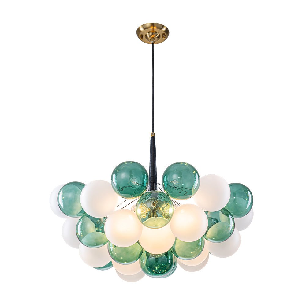 Infuse your interior with artistic charm and serene color through this captivating green and white bubble glass chandelier. Suspended from a sleek central metal rod, a playful cluster of glass globes is arranged in a circular formation, appearing to float effortlessly in the air. The arrangement of green and frosted white spheres, harmoniously interwoven, evokes a sense of balance and tranquility. The green glass globes bring a refreshing, nature-inspired vibrancy reminiscent of lush gardens or coastal waters, while the frosted white shades introduce a soft, calming glow. Designed with five E26 bulbs (not included), this cluster green hue glass globe chandelier delivers ample illumination alongside sculptural elegance. Perfect for modern, mid-century, or contemporary interiors, the bubble chandelier adds a statement of artistic sophistication to living rooms, dining areas, bedrooms, entryways, foyers, bathrooms, or even commercial locations, transforming any space into a serene yet visually dynamic retreat.