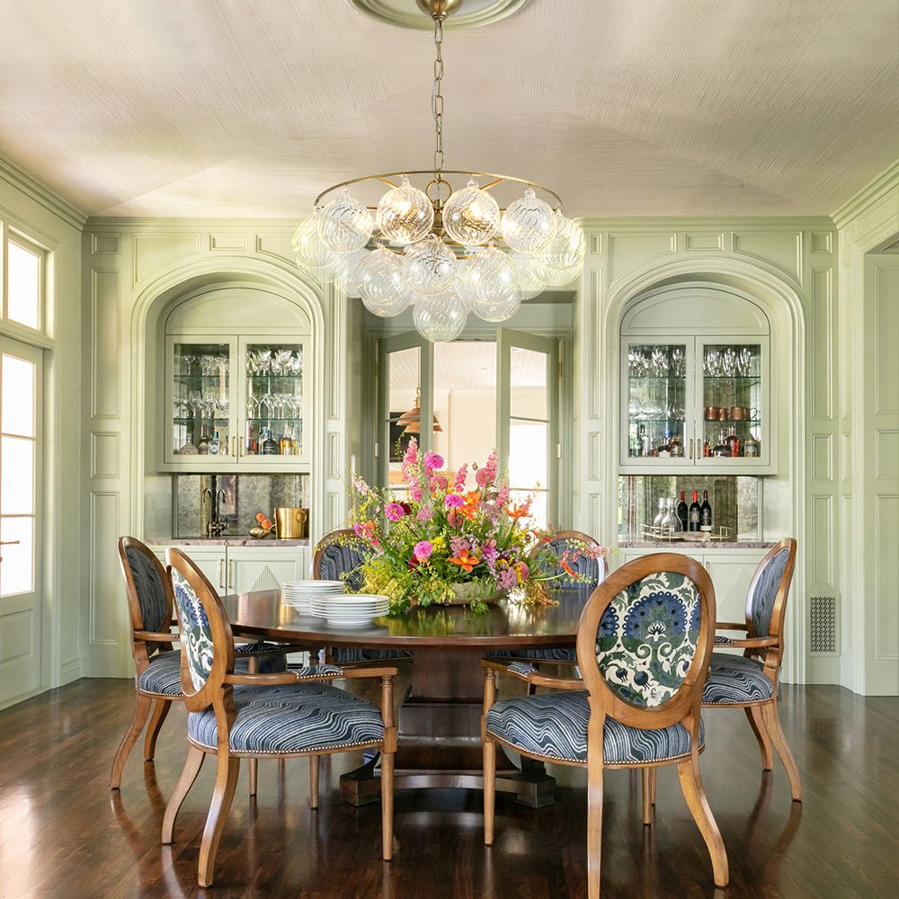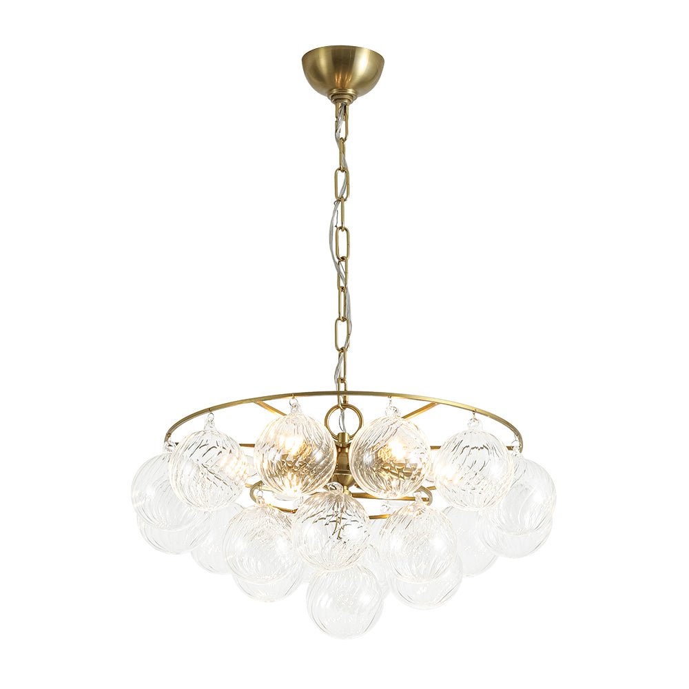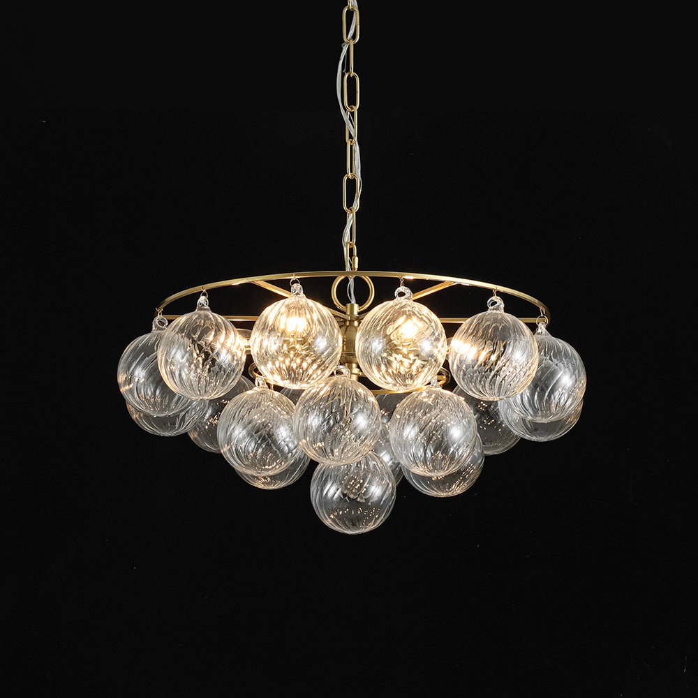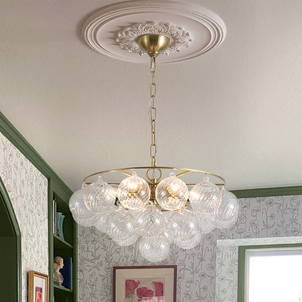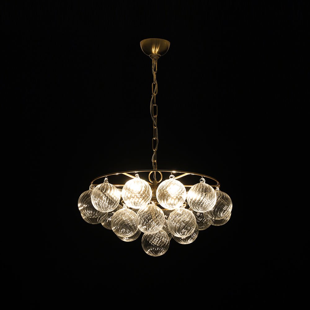This 6-light tiered bubble chandelier brings sculptural elegance with its cascading arrangement of ribbed glass globes. Suspended from an adjustable hanging chain, it offers versatile installation, whether gracing dining rooms, bedrooms, stairwells, or entryways with standard or higher ceilings. The brushed brass frame adds a warm, sophisticated finish, while the round, tiered design conveys harmonious elegance and layered artistry. Each clear globe, etched with graceful swirled textures, enriches the fixture with depth and intrigue, evoking floating bubbles frozen in motion. When illuminated, the ribbed glass diffuses the light into a soft, radiant glow with shimmering depth, making this round cluster glass globe pendant light a luminous focal point for both contemporary and transitional interiors.