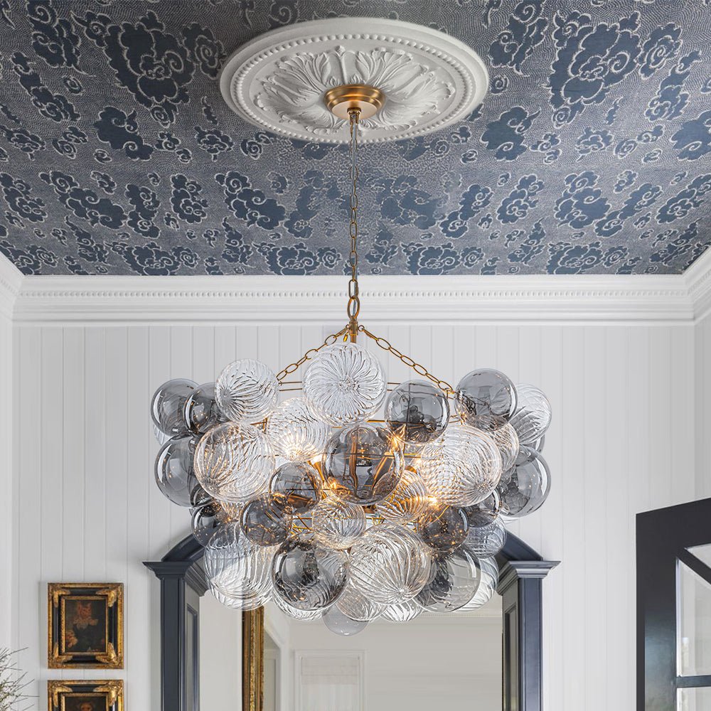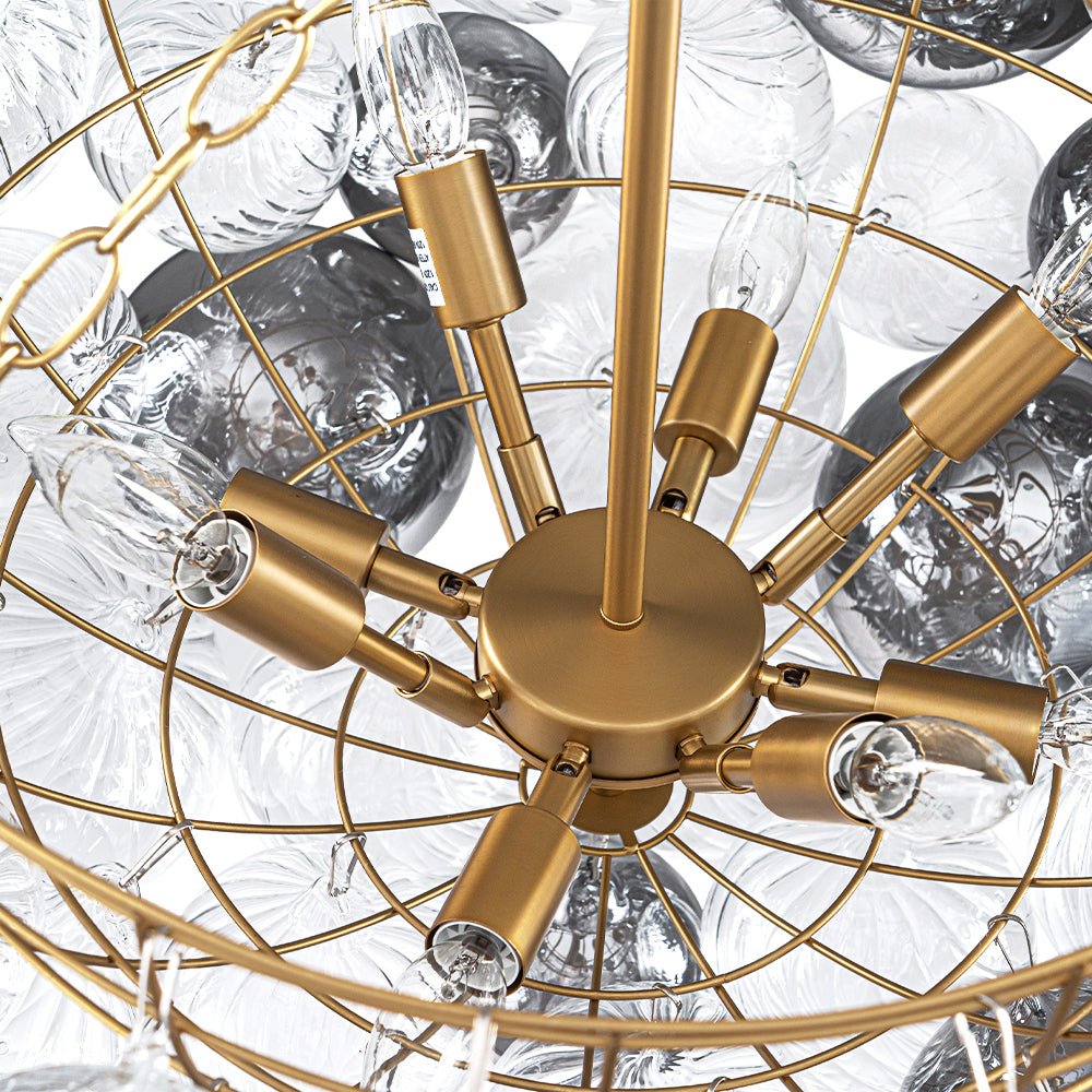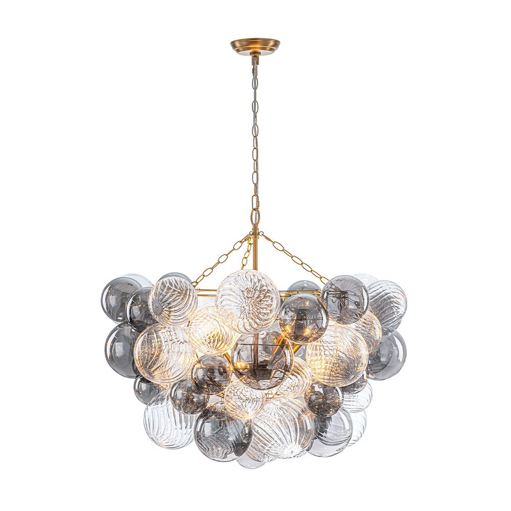 Grouped in a beautifully layered cluster, this funky round bubble chandelier makes a bold artistic statement with a playful yet sophisticated appeal. Its wide open bowl frame, crafted from durable iron in a brushed brass finish, is adorned with glass orbs in varying sizes—clear ribbed spheres and smoky gray globes that glimmer like glam gemstones for dimensional visual interest. When lit, the ribbed textures scatter and reflect light, while the smoked glass adds a delicate gray luster for a moody yet elegant effect. Perfect to create a warm, multi-layered shimmer and dramatic charm, this cluster glass globe chandelier is a bold magnificent accent that accentuates the decor in any living room, dining room, entry, bedroom, bathroom, hall or even boutique hotels and upscale retail environments.