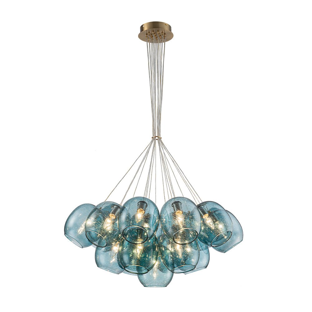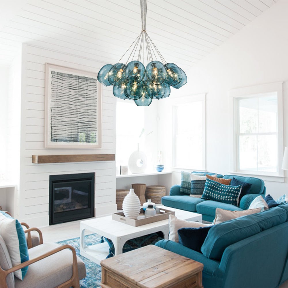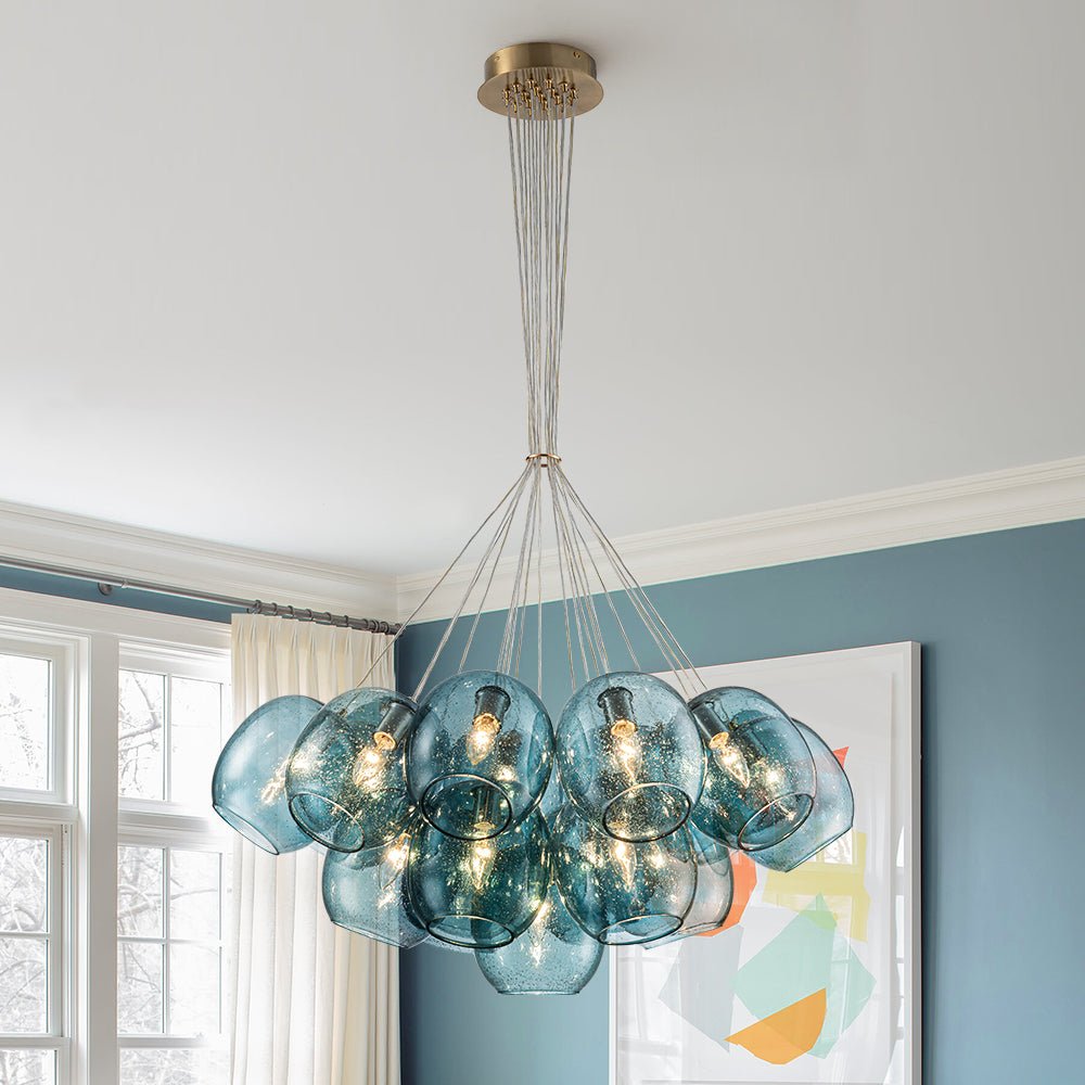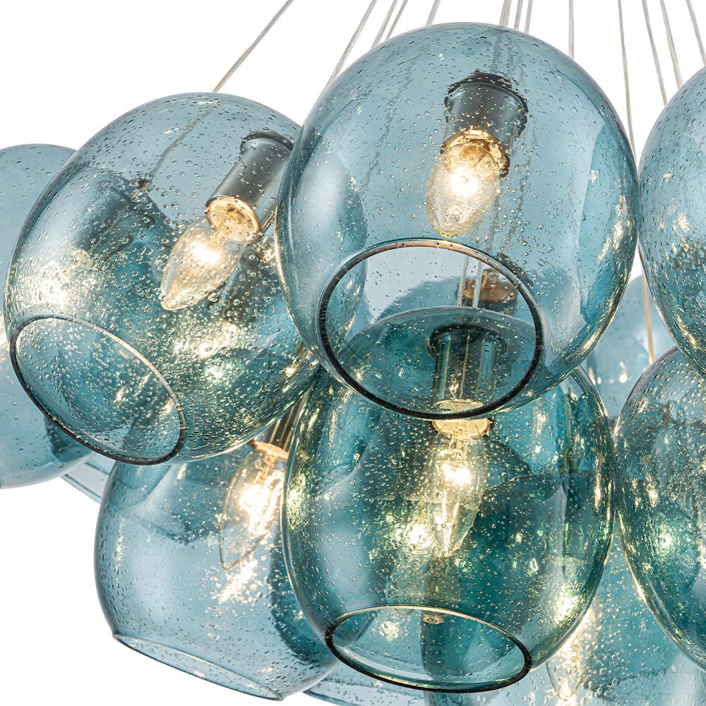 Bring a touch of serene romance into your home with this 19-light cluster bubble chandelier. Nineteen glass globes, each with an open bottom, gather in a cascading arrangement to form a glamorous cluster design that feels both modern and timeless. The standout feature lies in its striking blue glass, kissed with a subtle green undertone that evokes the tranquil ambiance of a lake house retreat. Each globe is enriched with seeded textures, reminiscent of raindrops trailing down a window on a quiet rainy day, infusing the piece with poetic charm.
